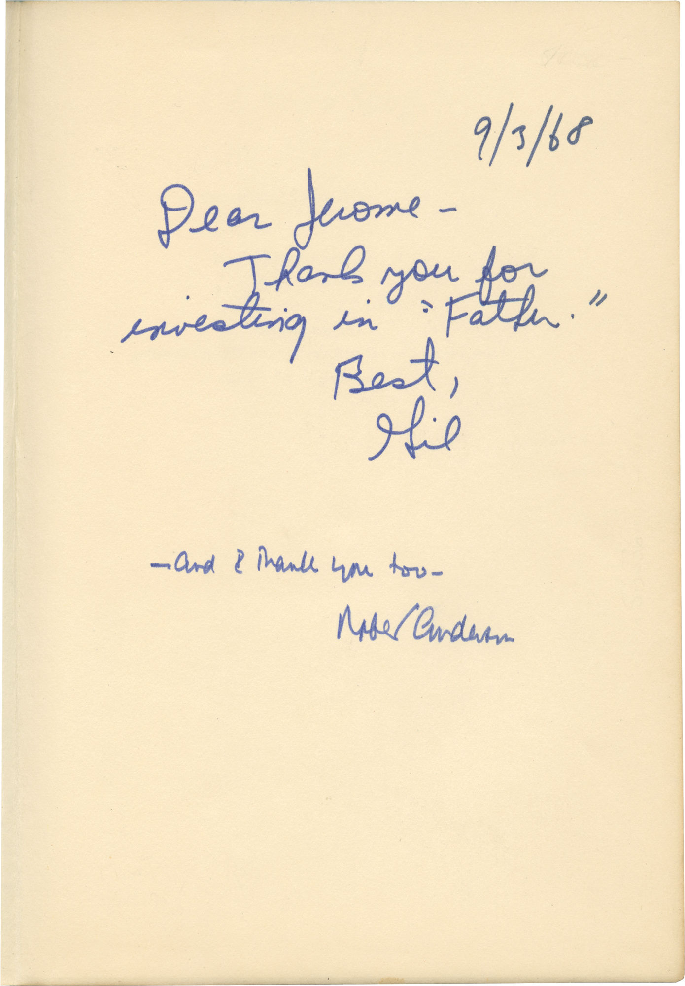 New York: Random House, 1968. First Edition. First Edition. INSCRIBED by author Robert Anderson and director Gilbert Cates on the front endpaper in the year of publication: "9/3/68 / Dear Jerome / Thank you for investing in 'Father' / Best / Gil / and I thank you too / Robert Anderson."