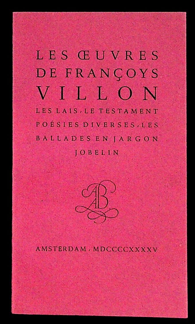 Amsterdam: A.A. Balkema, 1945. Softcover. Very Good. Softcover. François Villon (c.1431-1463) was a well-known French poet of the Middle Ages. He was also known for being involved in criminal behavior, including a stabbing death. Much of his poetry, such as Le Testament, deals with these personal incidents. This publication contains Le Testament, other poems, and ballades in Jargon Jobelin, known as the thieves argot. Small octavo. Rose-colored paper wrappers, with title in black to front wrapper and spine. Pages are bright and clean. Printed from the works of François Villon, edited by Auguste Longon and published by Jean Longnon by the Cité des Livres, Paris, 1926. 153 pages. FRLANG/022224.
