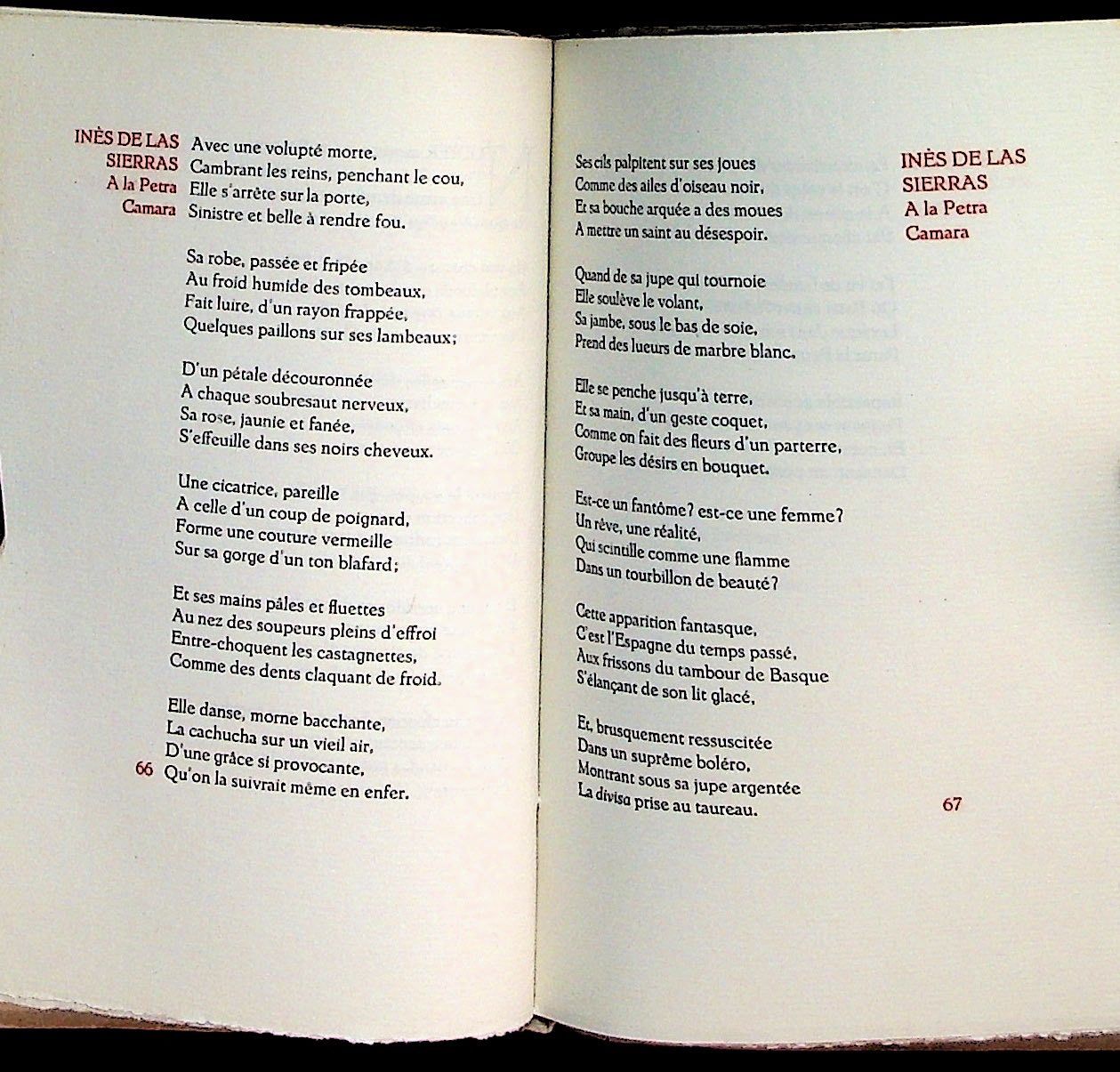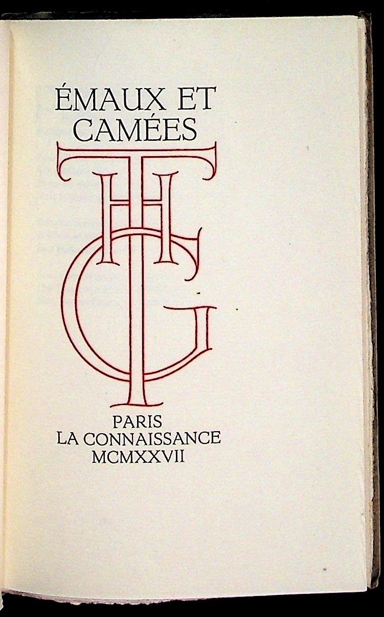 Paris: La Connaissance, 1927. Softcover. Very Good. Softcover. [IN FRENCH] Théophile Gautier (1811-1872) was a French poet, journalist, and critic. He began publishing poetry in 1830, and he continued publishing poetry. novels, travel literature, and criticism throughout his life. Émaux et Camées, initially published in 1852, is considered one of his best works. The 1852 edition contained 18 poems; a second expanded edition was published in 1872. This publication contains 46 poems. A limited edition of 100 non-commercial copies on paper by Hollande van Gelder Zonen; 400 commercial copies on the same paper; and 5 copies on Japan for the publishers. This is copy 155 of 400. Small octavo. Grey paper wrappers, with title in black to front wrapper and spine. THG monogram in red to front wrapper. Wrappers are slightly bumped at edges. Pages are bright and clean. Poems printed in black; poem titles in red. 137 pages, plus colophon. FRELANG/022224.