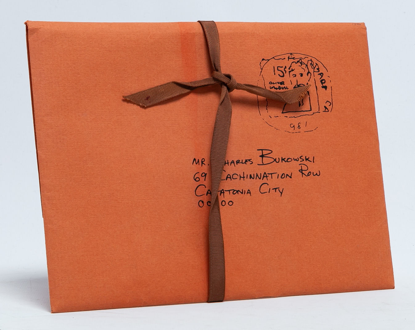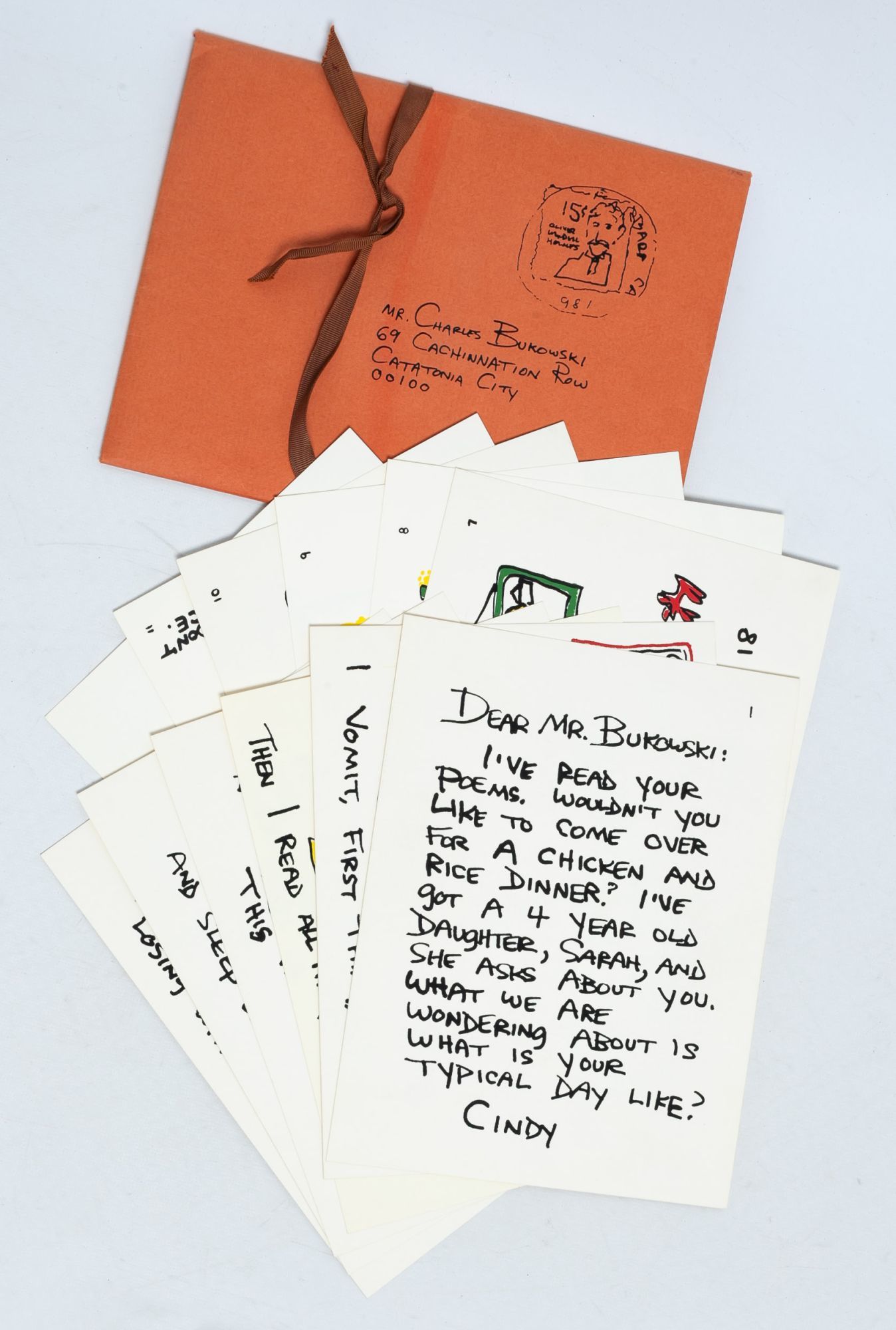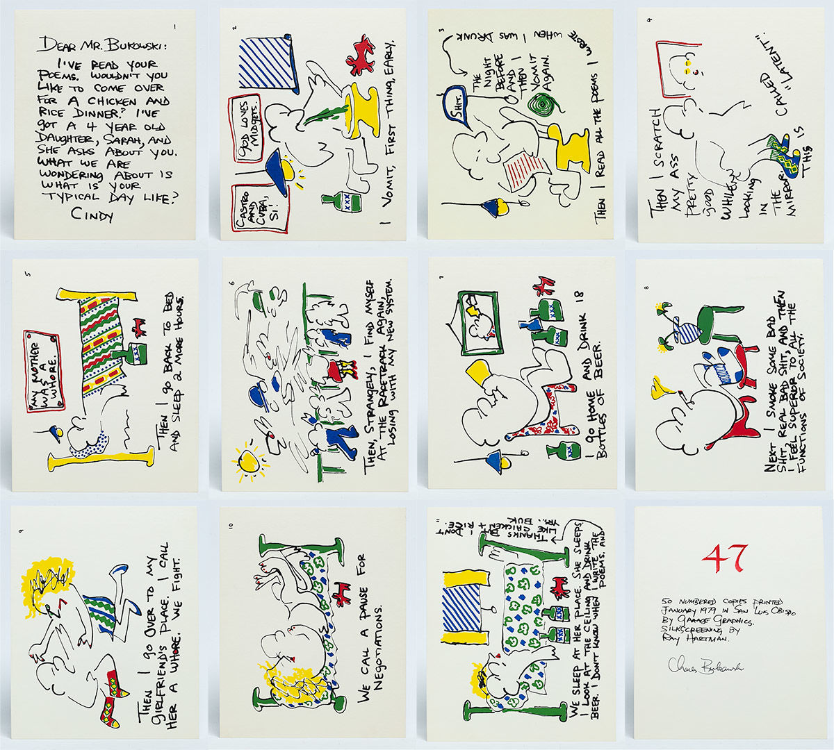 Artist book in the form of a letter sent to Bukowski with his responses as individual illustrated cards. Read sequentially, the cards offer a humorous play-by-play of a day in the author's life, underwritten with self-loathing yet maintaining levity throughout. An entertaining set.