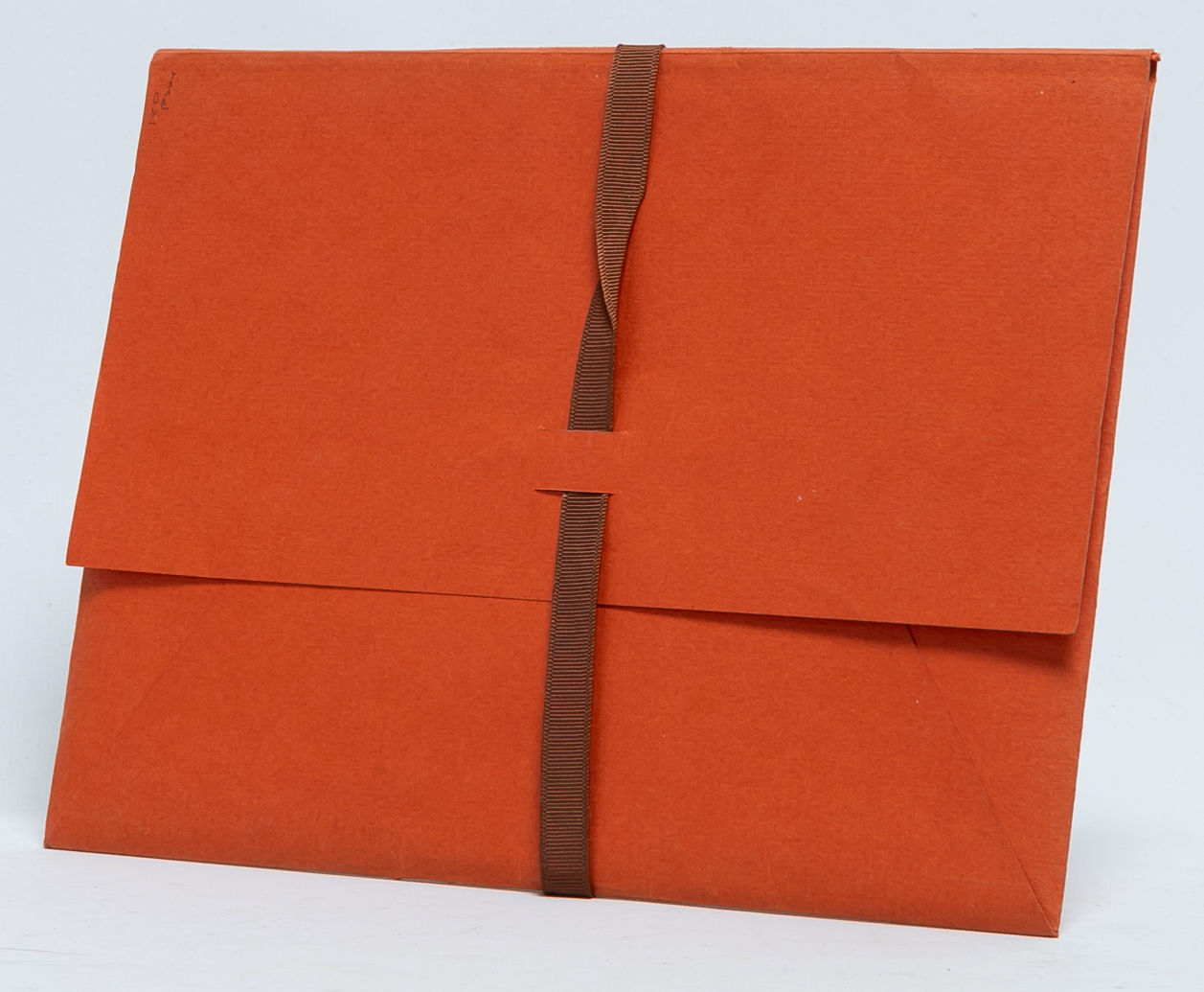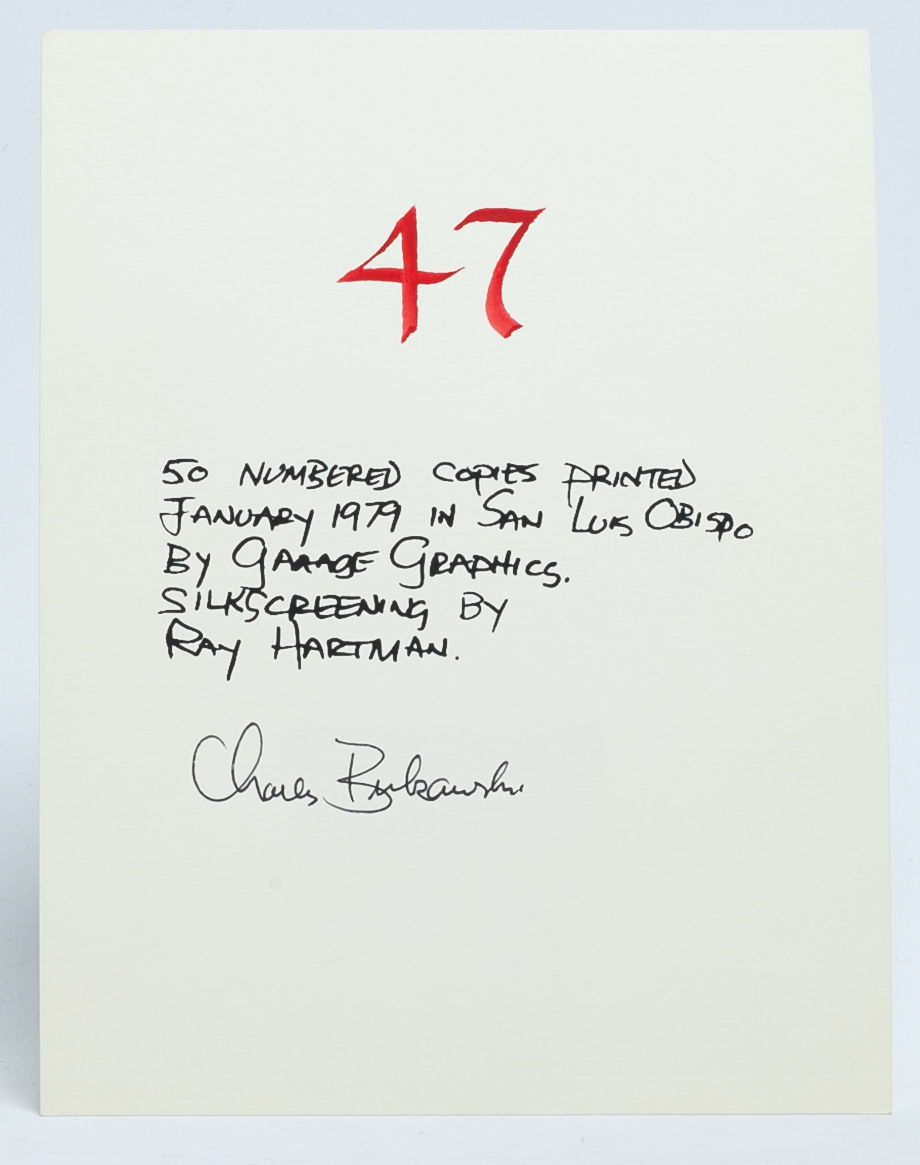 Santa Barbara: Black Sparrow Press, 1979. First edition. Fine/Near Fine. Number 47 of 50 signed copies, with author signature on colophon. A collection 12 unbound leaves measuring 8 1/2 x 6 1/2 inches, numbered 1-11, with 1 unnumbered leaf contained in an envelope. Extremely clean and bright leaves silkscreened with illustrations and text, Fine in nearly Fine envelope. Orange envelope with brown ribbon and silkscreened text and artist's holograph, slight overall fading to colored paper.