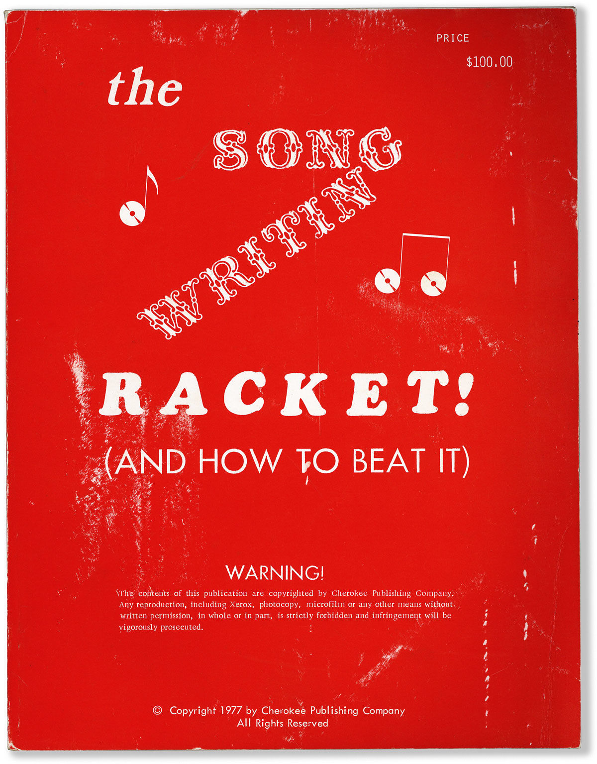 A guide to the music publishing industry by two professed "insiders;" the book appears to have been marketed by mail, through advertisements in trade publications. Whether the $100 cover price is a mis-print, a gag, or the actual publisher's price is beyond us to determine. Apparently rare, with no copies traced in commerce and only two catalogued holdings in OCLC.