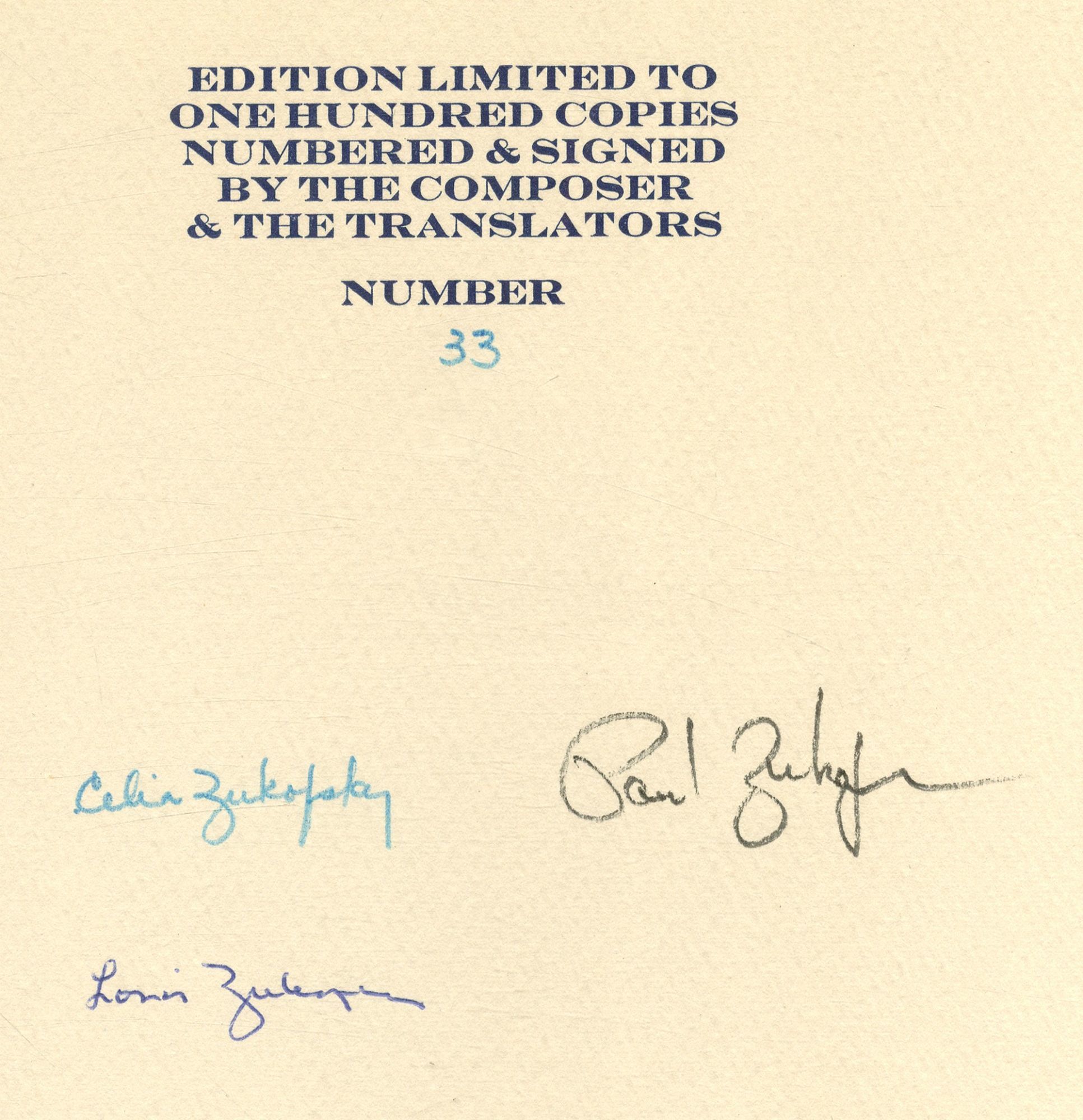 (London: Turret Books, 1969. Softcover. Fine. First edition. Folio. Music by Paul Zukofsky. Translated by Louis Zukofsky and Celia Zukofsky. Unprinted stitched wrappers. Fine in fine dust jacket. One of 100 numbered copies Signed by both the composer and both translators. Scarce.