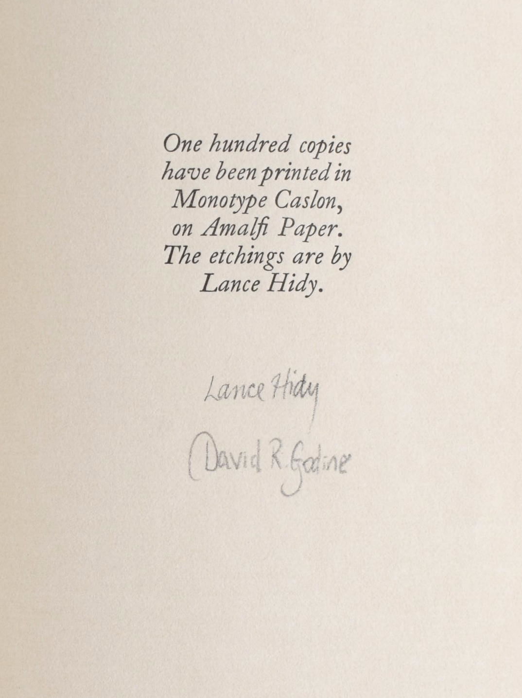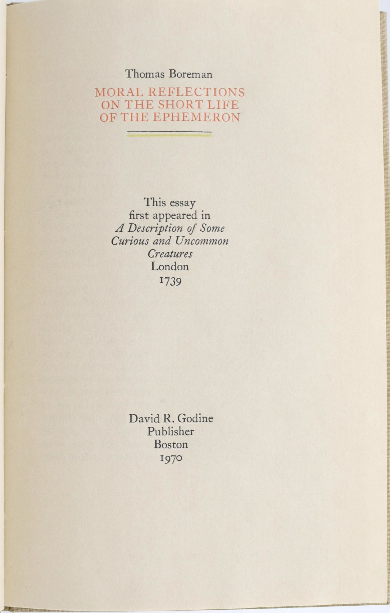 Boston: David R. Godine Publisher, 1970. Hard Cover. Near Fine binding. 8vo.; in tan linen with printed paper label, housed in a matching linen box; 17 unnumbered pages with color illustrations by Lance Hidy; the bottom corner of the frontispiece is lightly wrinkled; one of one hundred copies signed by the illustrator Lance Hidy and the printer David R. Godine.~~"This essay first appeared in A description of some curious and uncommon creatures, London, 1739" ~~This lovely little book is an early offering of the estimable David Godine.~~Thomas Boreman was one of the earliest publishers of English children's books, with a focus on animals. Mr. Boreman had several shops in an around London.~~. Near Fine binding.