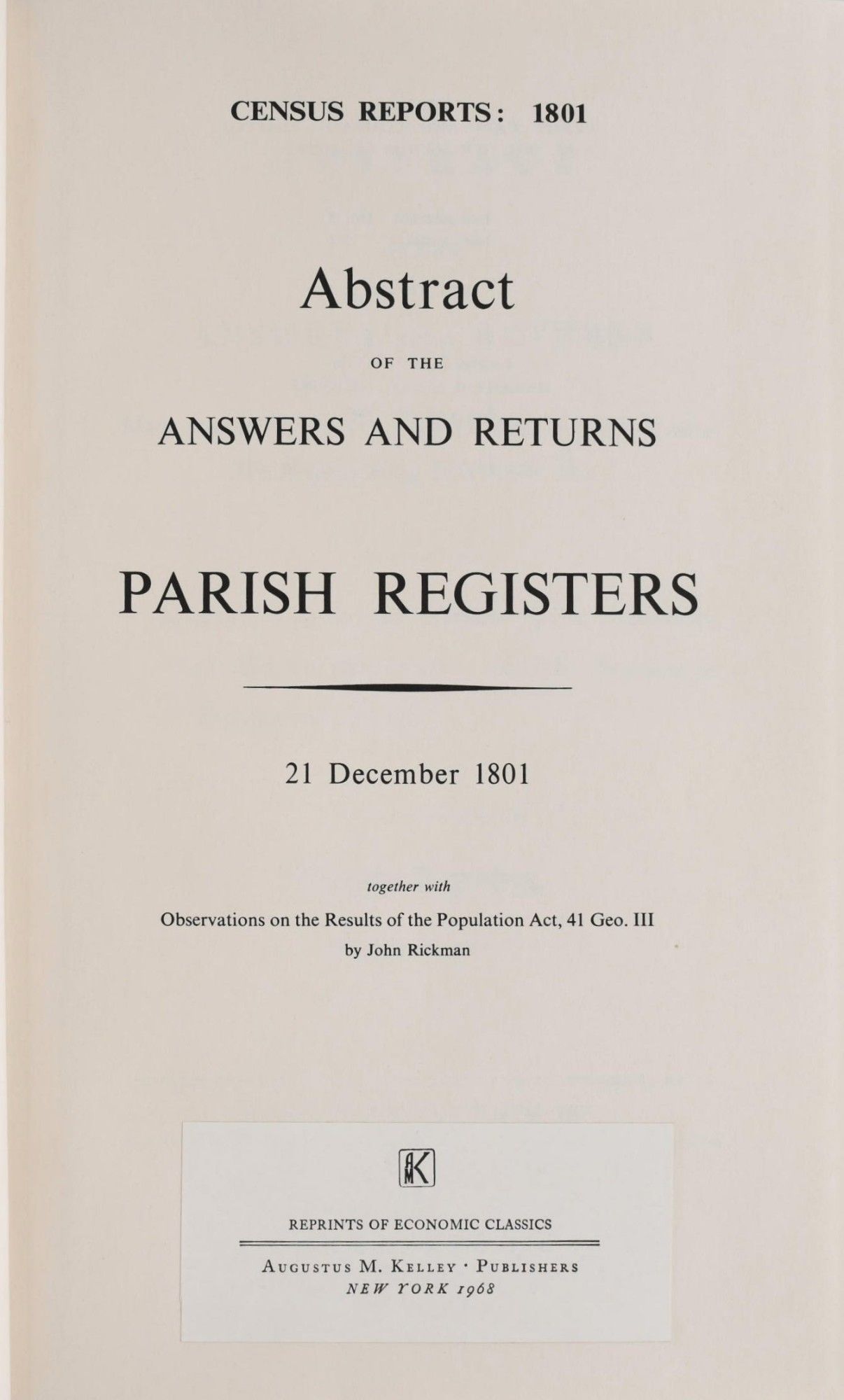 [ENGLISH] CENSUS REPORTS: 1801. ABSTRACT OF THE ANSWERS AND RETURNS. PARISH REGISTERS, 21 DECEMBER 1801, TOGETHER WITH OBSERVATIONS ON THE RESULTS OF THE POPULATION ACT, 41 GEO. III BY JOHN RICKMAN [A FACSIMILE OF THE EDITION OF 1801-2]