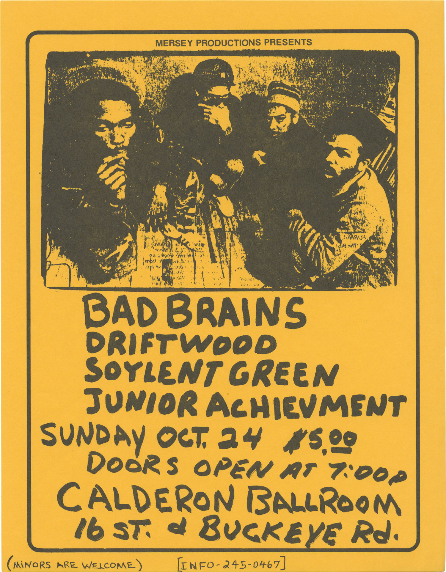 Original flyer for a performance by Bad Brains, Driftwood, Soylent Green, and Junior Achievement at the Calderon Ballroom, October 24, 1982