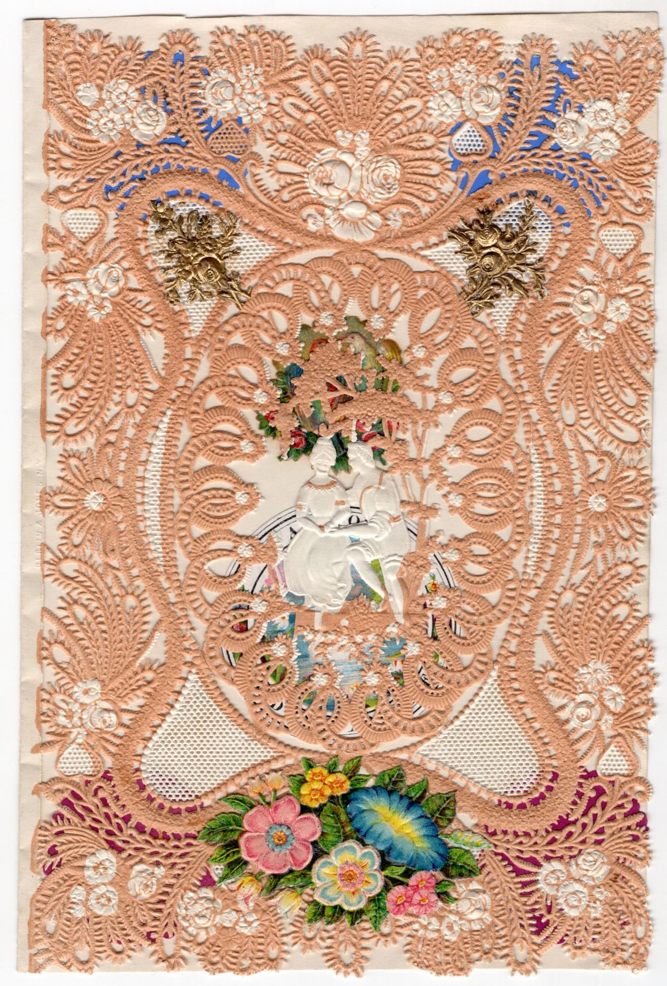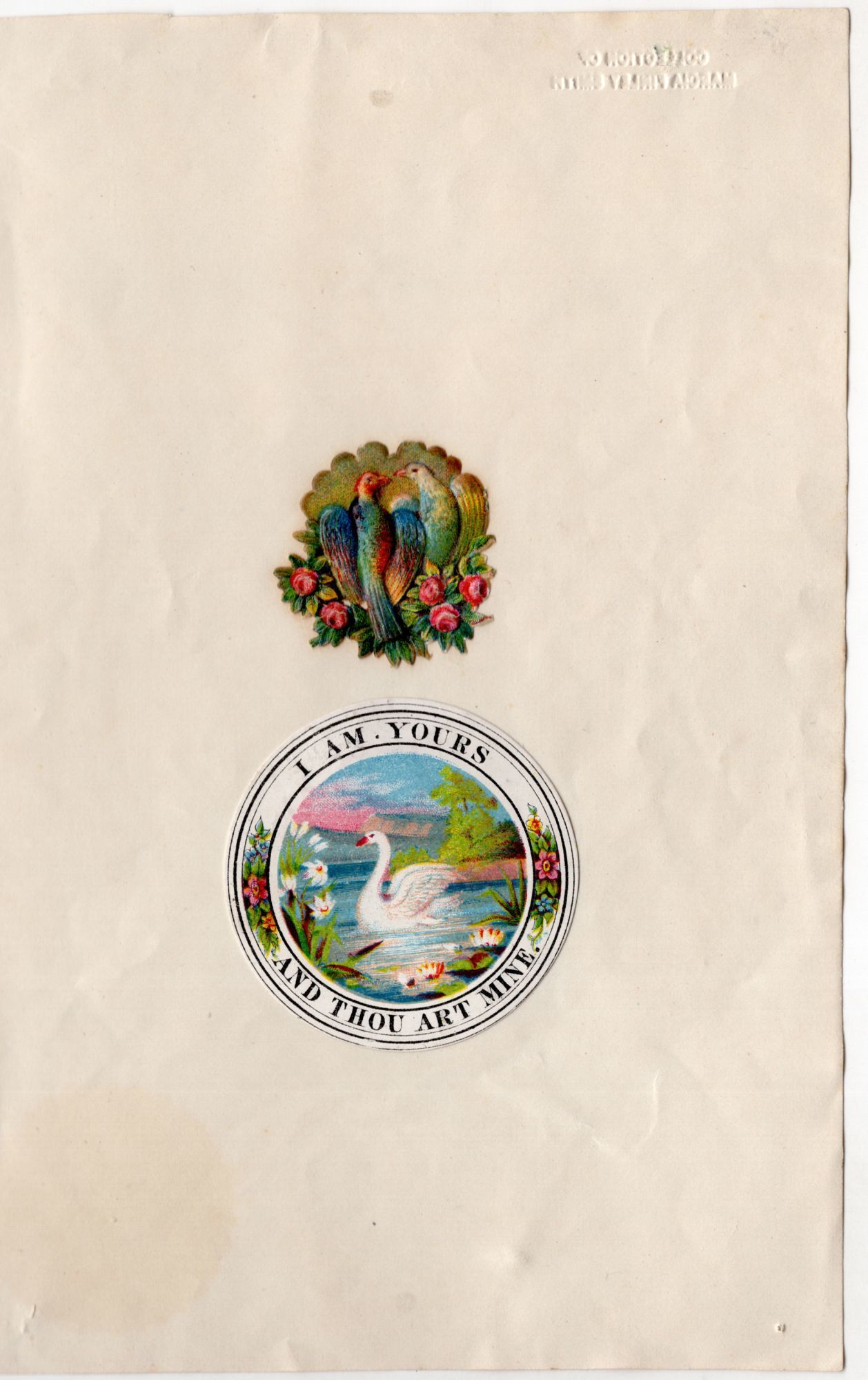 England, 1850. Near-fine.. An attractive octavo Valentine with intricately produced lace paper, depicting wild roses and lace surrounding a young couple. Opens to reveal two scraps: one embossed with two birds, and the other depicting a swan with the phrase "I am yours and thou art mine". Larger floral scrap to front. Lace paper colored with pale orange and gold. Measures approx. 7" by 4.75". Blind stamp to lower leaf ("From the collection of Marcia Finley Smith"). No maker noted.