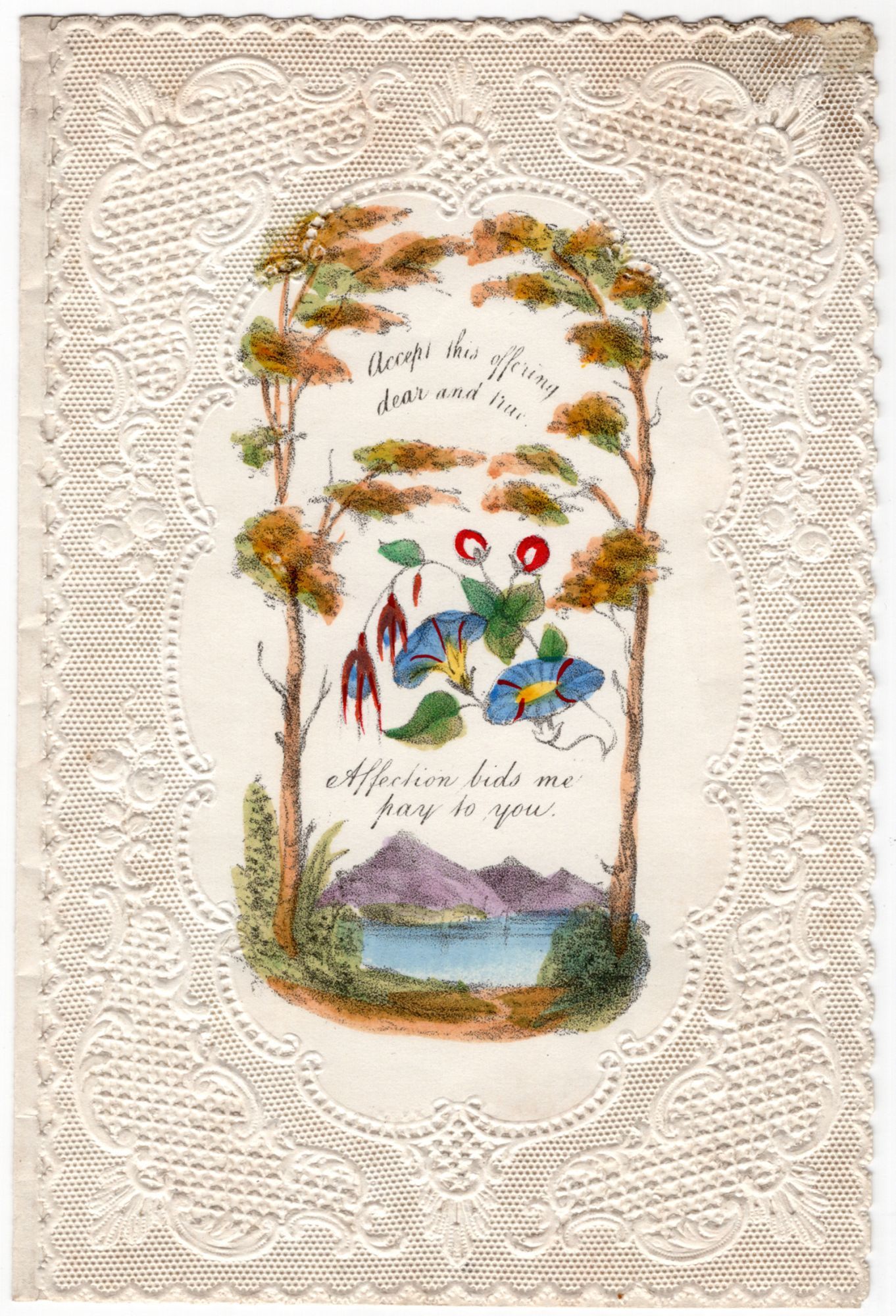England, 1850. Very good. Minor staining. An attractive 12mo-sized Valentine by the maker Meek, using lace paper which has been lithographed and hand-colored. The text reads, "Accept this offering dear and true. Affection bids me pay to you." Image is of a serene lake with autumn trees, morning glories. Measures approx. 5.75" by 3.75