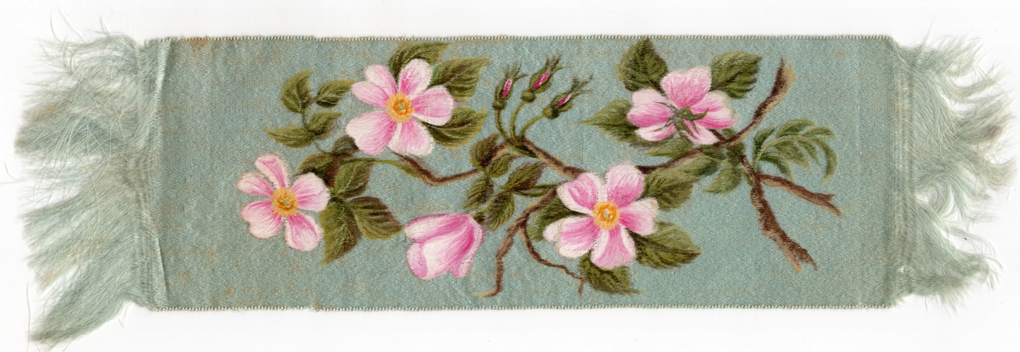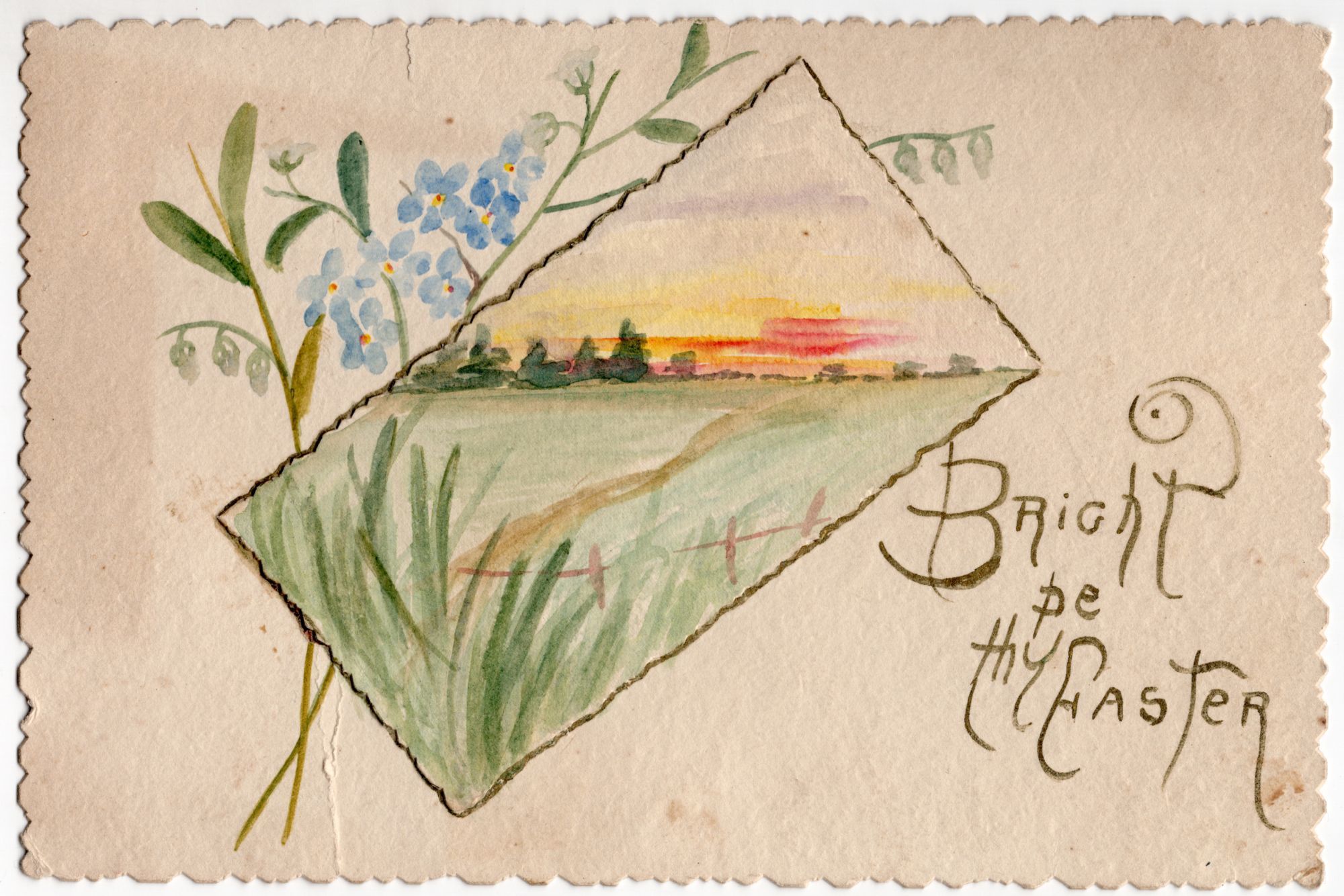 United States, 1900. Very good. Light dust soiling.. A delicate and charming original watercolor on die-cut card, offering an Easter greeting ("Bright be thy Easter") alongside a sprig of Forget-Me-Nots and a country sunset. It is accompanied by a light green-blue silk bookmark with fringe decorated by the same artist in watercolor, with a sprig of what appear to be wild roses. Greeting card measures 5" by 7.5", bookmark measures 2.5" by 9