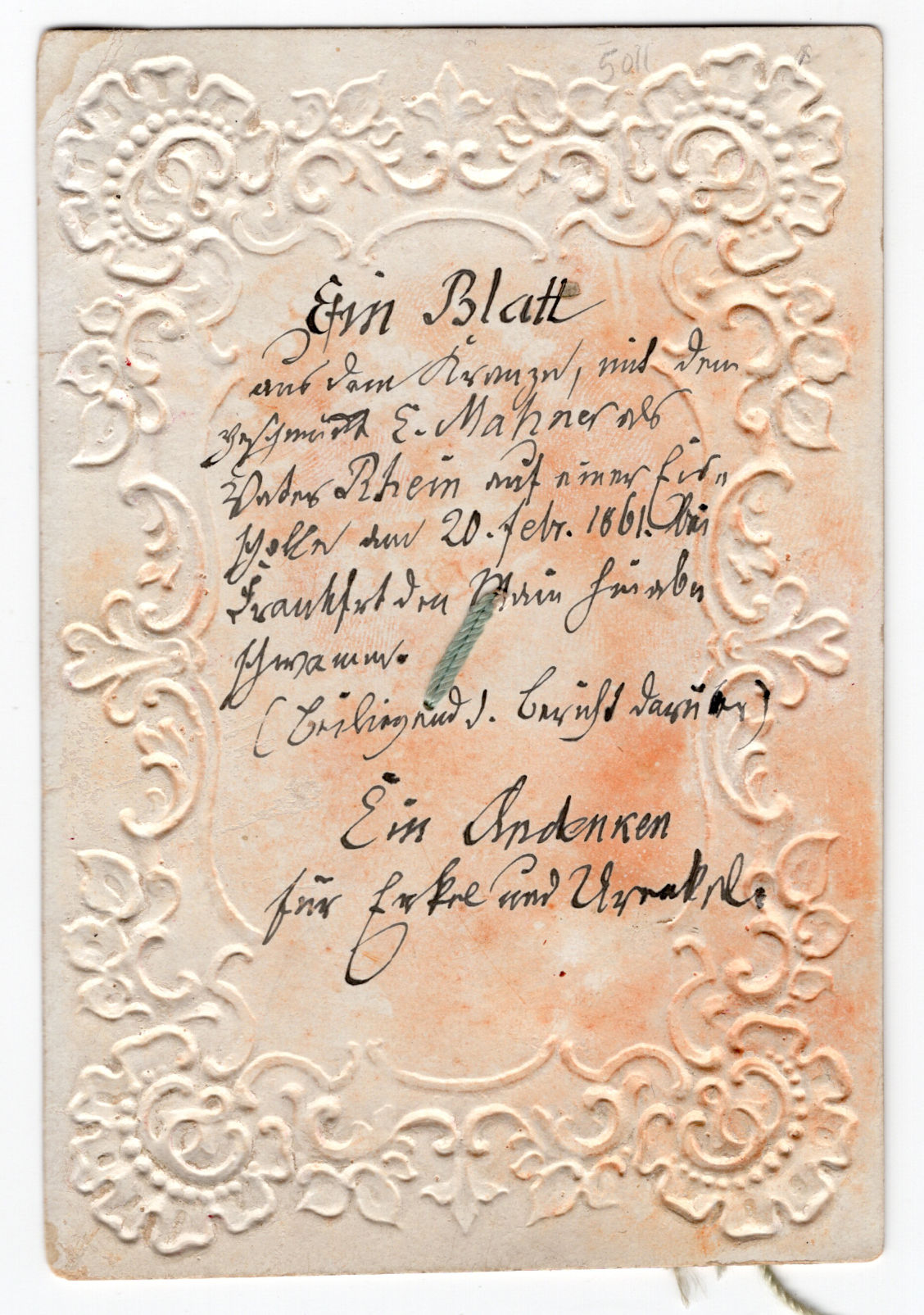 Germany, 1861. Very good. Minor dust soiling.. An embossed and chromolithographed token of friendship card, featuring a small leaf in the center secured with silk cord, and a small wax seal. Dated 20 February 1861, it has lines of verse in German on the front in ink manuscript, and another several lines on the verso with the title "Ein Blatt" ("A Leaf"). Measures approx. 3.75" by 2.5