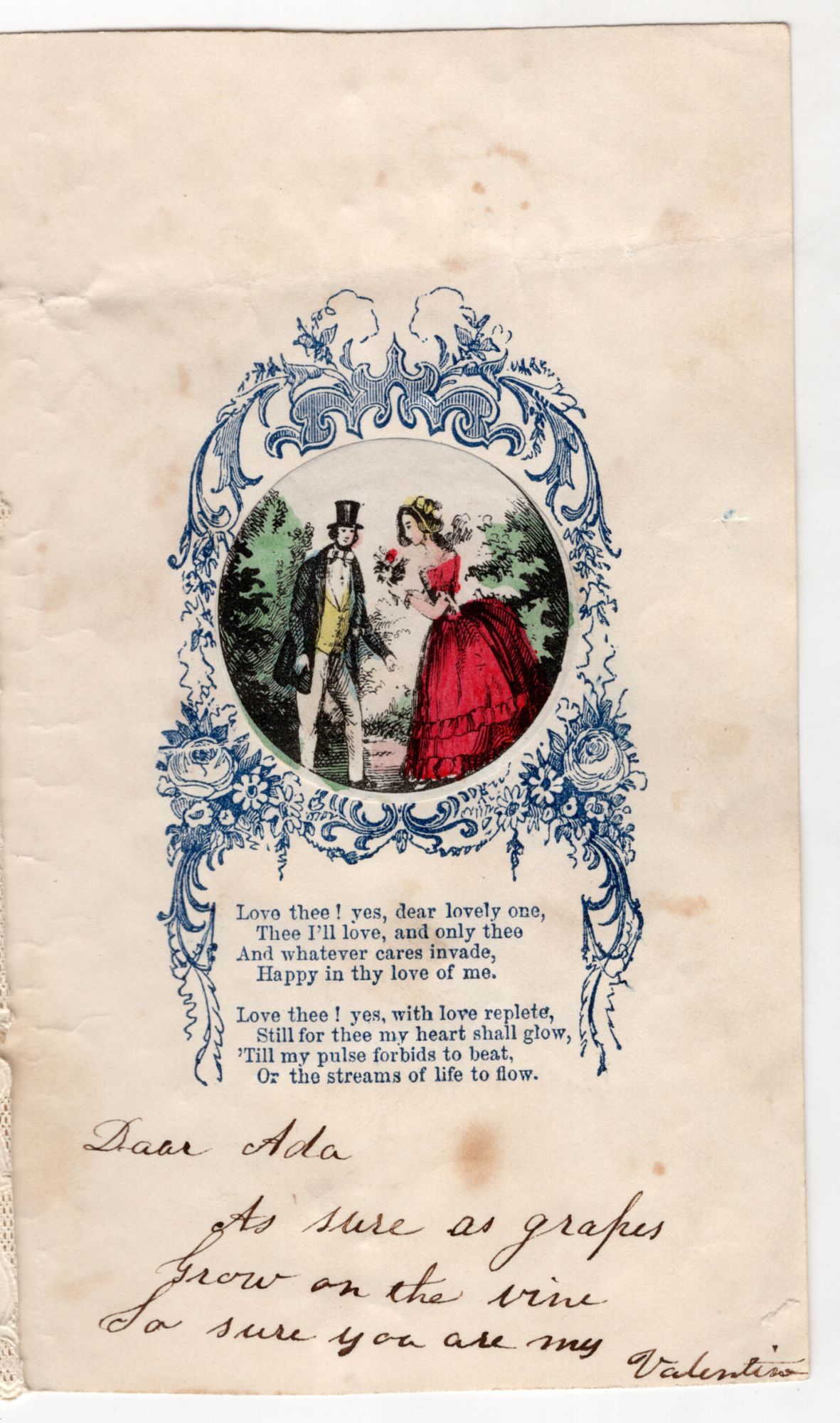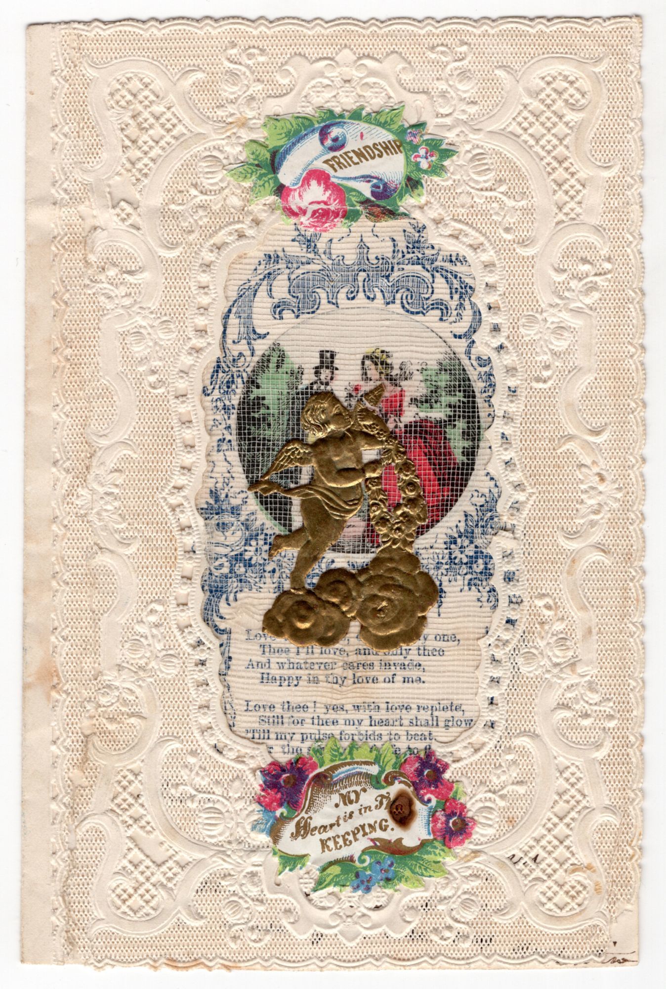 England, 1850. Very good. Minor toning, one small spot of discoloration to scrap on front.. A fine lace paper Valentine featuring embossed Victorian gilt scrap of Cupid, a hand-colored lithographed image of a couple inside, and a very delicate silk mesh window. Two printed stanzas of verse inside, with early ink manuscript below reading, "Dear Ada As sure as grapes Grow on the vine So sure you are my Valentine". 12mo sized bifolium measuring approx. 5.5" by 3.75
