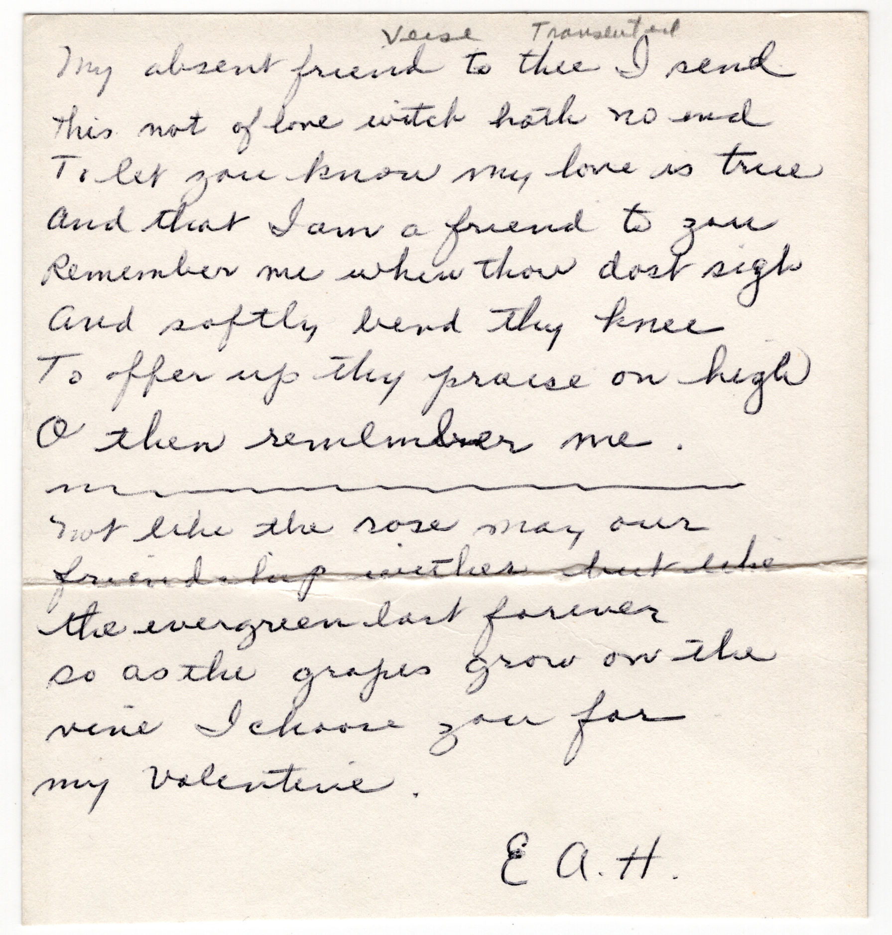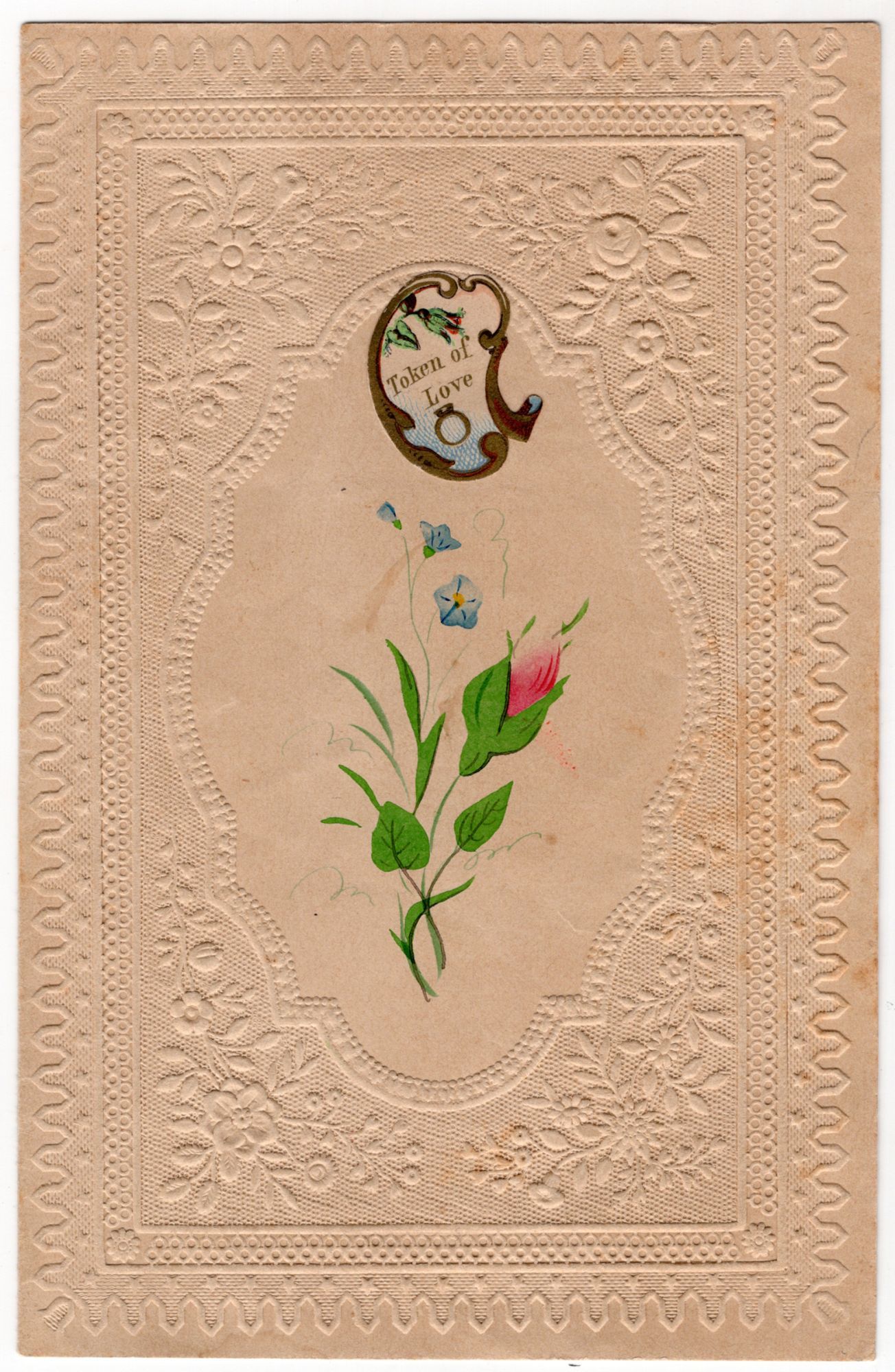 United States, 1850. Very good. Toned.. An attractive duodecimo-sized Valentine on lace paper with water color rosebud and morning glory, with an applied scrap reading "Token of Love". Scrap has a tiny image of an engagement ring in the center. Measures approx. 5.75" by 3.75