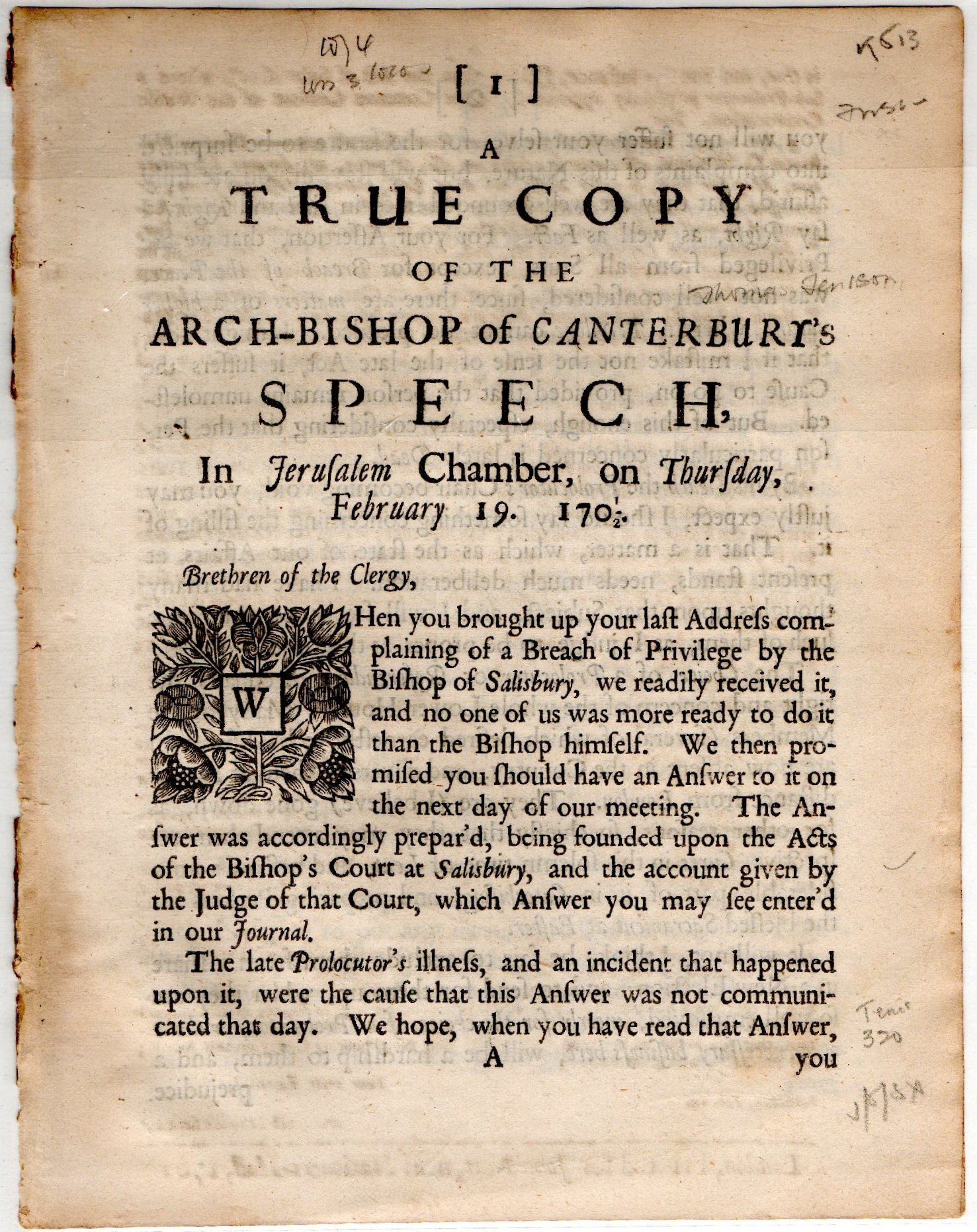 [ENGLISH] A TRUE COPY OF THE ARCH-BISHOP OF CANTERBURY'S SPEECH, IN JERUSALEM CHAMBER, ON THURSDAY, FEBRUARY 19, 1702