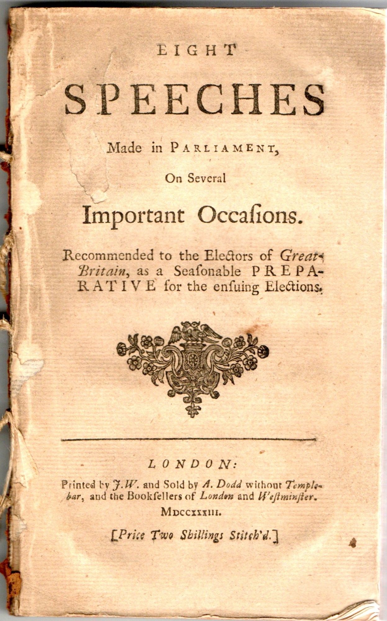[ENGLISH] EIGHT SPEECHES MADE IN PARLIAMENT, ON SEVERAL IMPORTANT OCCASIONS, RECOMMENDED TO THE ELECTORS OF GREAT BRITAIN AS A SEASONABLE PREPARATIVE FOR THE ENSUING ELECTIONS