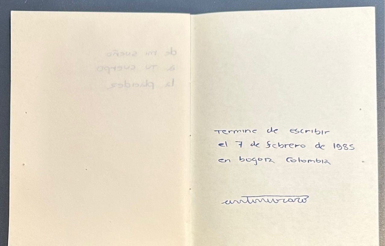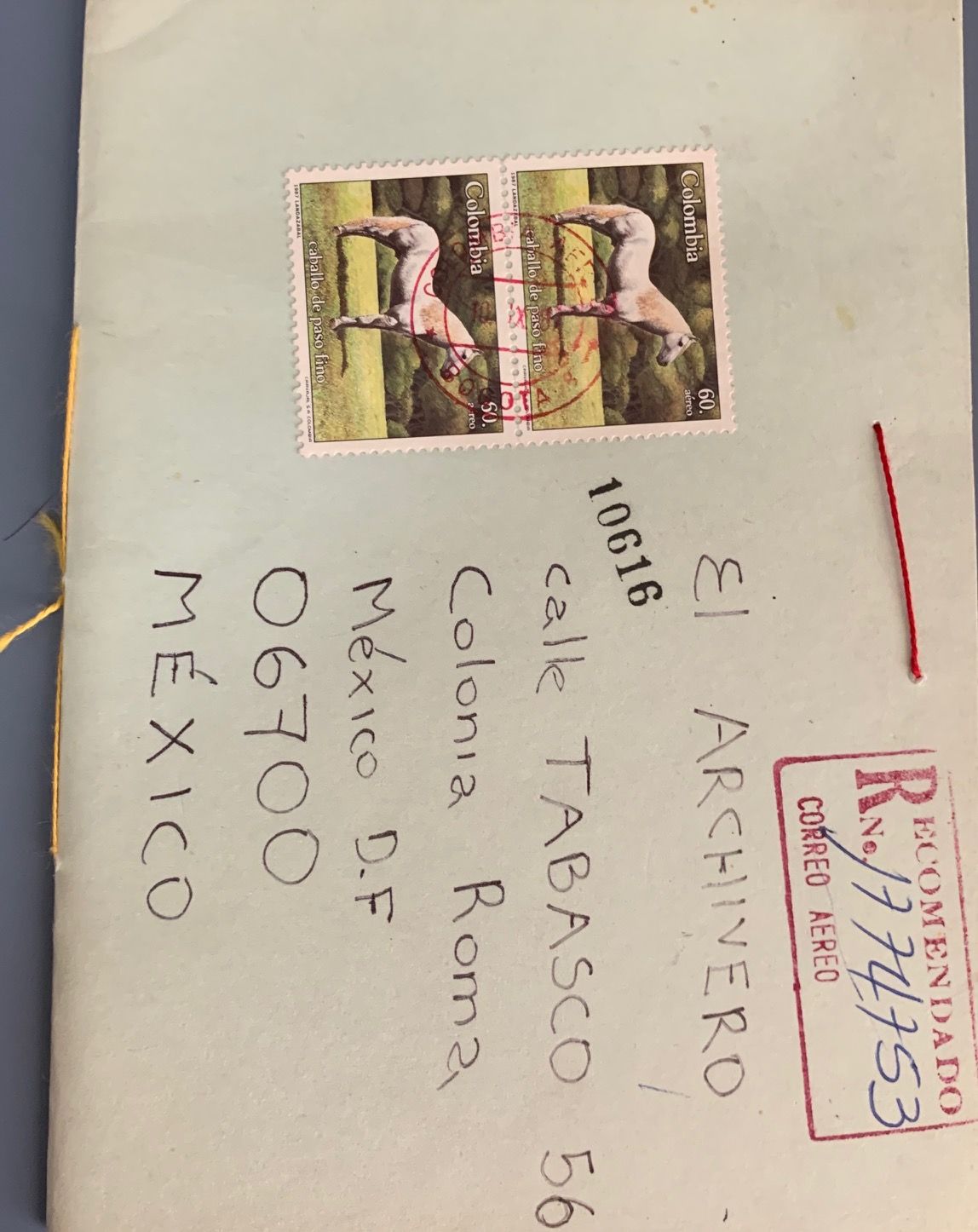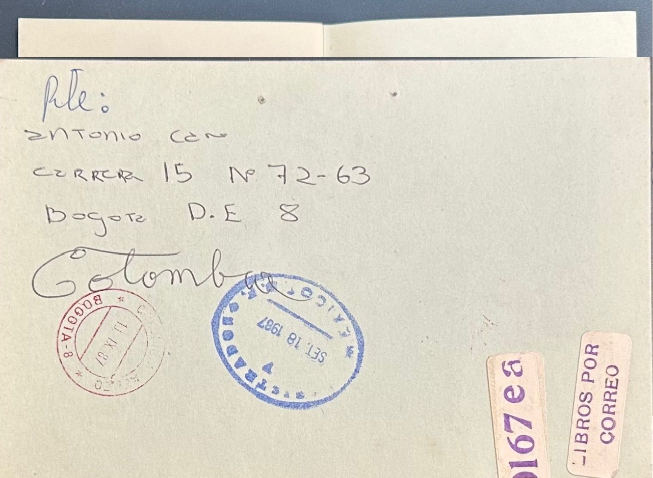 México, D.F.: El Archivero Libros de Artista, 1985. string bound wrps. with cancelled postage stamps, ink stamps, ink writings and red thread inserted for closure. Mailed handmade artists book created by conceptual artist Antonio Caro (Bogotá, Colombia 1950). "Termine de escribir el 7 de febrero de 1985 en Bogotá, Colombia. Antonio Caro." --Colophon. Early artwork by Caro.
