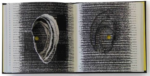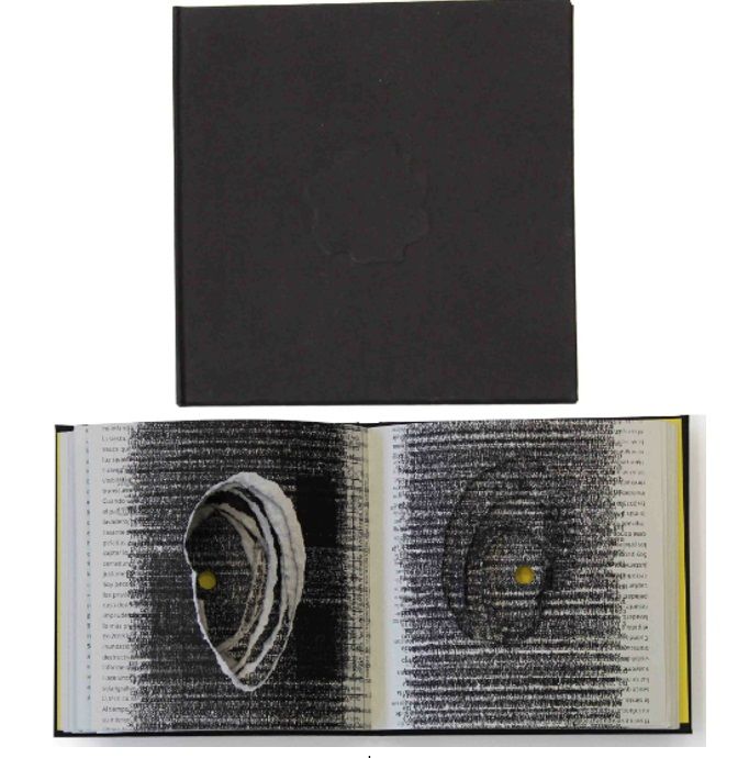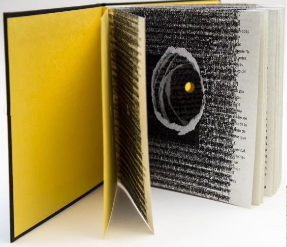 La Plata: Tercera persona, 2023. b/w and duo tone plates, pages are cut-out in the center, lined with black cardstock boards containing embossing different geometric shapes. NOTE: Inside, printing test and torn pages, are interspersed. The holes created by the torn pieces creates a void inside from which emerges the yellow color of the cardboard at the beginning and end of the book. Torn pices of paper from pages are included. One certificate of authenticity printed on a loose sheet, sig. SIGNED AND NUMBERED OF LIMITED EDITION OF 50. "Editado por TERCERA PERSONA (Leticia Barbeito Andrés and Juan Pablo Montero). Encuadernado a mano con costura francesa y papeles rasgados por Fa Taller Estudio. Páginas en papel de desecho de Imprenta con Mística (bookcel de 80 gramos) y papel colorplus de 120 gramos. Tapas de cartón forradas en papel negro color plus de 120 gramos. Ejemplar no. __ de la primera edición de 50 ejemplares. La Plata. Año 2023"--Certificate of Authenticity enclosed. TERCERA PERSONA is a collection carried out by Leticia Barbeito Andrés and Juan Pablo Montero since 2019. From the city of La Plata, they publish books and "things" from people interested in publications as a space of intimacy but also the artist's book as collaborative device, of action, of gesture or being a landscape in itself or a field of visual research. In total they have eleven proposals among which are authors such as Lulú Lobo, Marcela Cabutti, Celestina Alessio or Daniel Díaz Teruggi. Montero productions are based at Fa Taller Estudio, Tercera Persona and Imprenta con Mística. He is in charge of printing each of the EME books since August 2020.