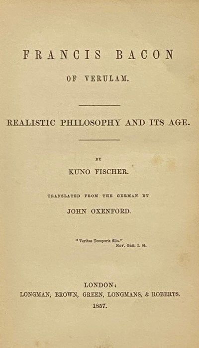 London: Longman, Brown, Green, Longmans, & Roberts, 1857. First English Language Edition. Hard Cover. Very Good/No Jacket. First English translation. Boards lightly rubbed with some light spotting on front, few pages lightly foxed. 1857 Hard Cover. xxiii, 508 pp. First English translation of the work first published in Germany in 1856. Discusses Bacon, Locke, Berkeley, Hobbes, Hume, Plato, Aristotle, etc., and the relation of Bacon's thought to religion, science, idealism, empiricism, etc.