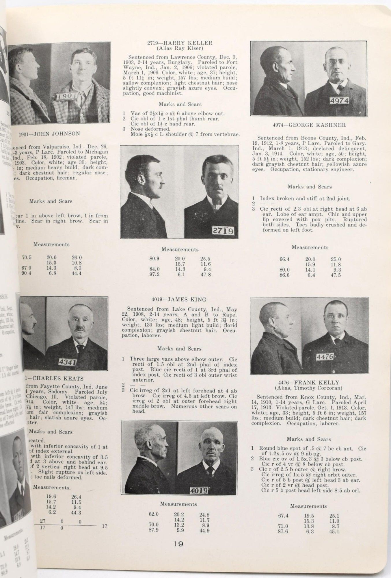 1900. Soft Cover. Very Good binding. Quarto; in brown printed cardstock covers with black tape spine (small ink spot to the upper cover); 41 pages, all with mugshots and statistical data about the prisoners gone missing -- when they were sentence, when they were paroled, the nature of their parole violation; the crime for which they were sentenced; their physical description, occupation, etc. There are the mugshots of 240 former inmates.~~The dates of the parole violations are almost entirely from 1900 to 1920.~~The prisoners had been sentenced for everything from Burglary, to Forgery; from entering a house to commit a felony, to sodomy.~~~~. Very Good binding.