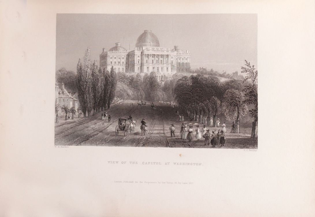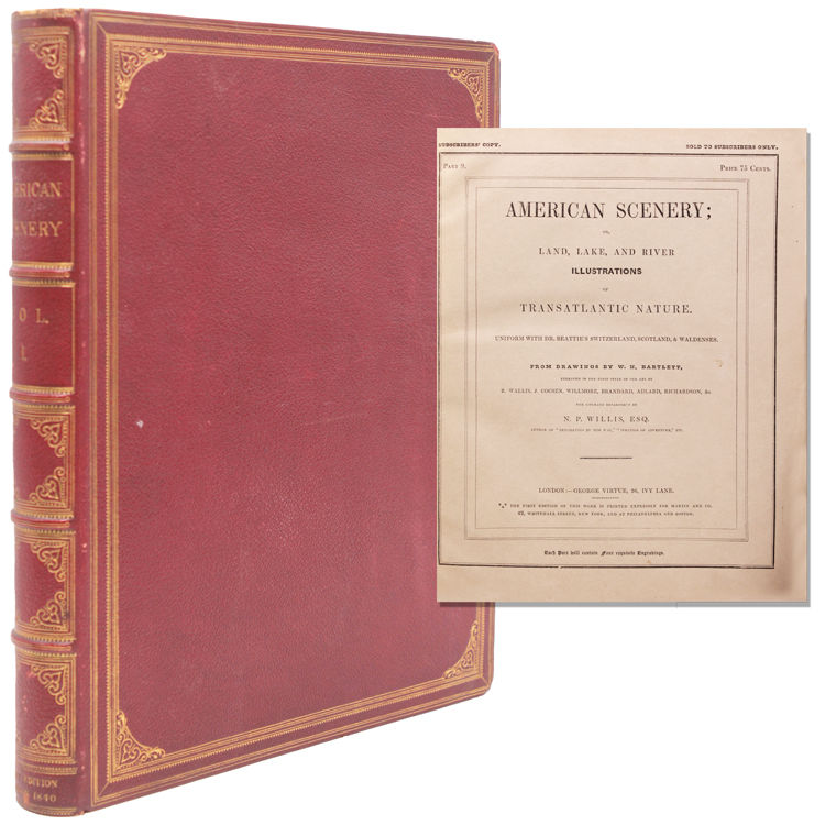 London: George Virtue, 26, Ivy Lane, 1840. First edition, state A of volume II with Contents list numbered, with part wrappers issue tipped in at front and back of each volume. With 120 steel engraved plates by William H. Bartlett, including a full-page map of the Northeastern United States, portrait, and two engraved title pages, tissue guards. 2 vols. 4to. Bound in contemporary pebbled maroon morocco, gilt spine, a.e.g. PLATES VERY CLEAN. FINE. First edition, state A of volume II with Contents list numbered, with part wrappers issue tipped in at front and back of each volume. With 120 steel engraved plates by William H. Bartlett, including a full-page map of the Northeastern United States, portrait, and two engraved title pages, tissue guards. 2 vols. 4to. Sabin 3784; Howes B209; BAL 22755; Abbey, Travel, 651