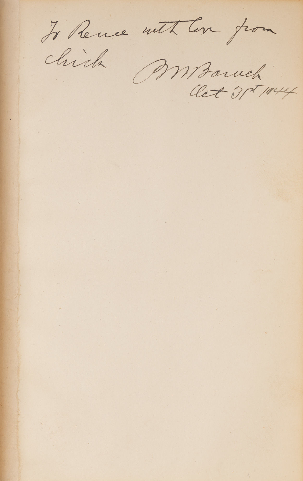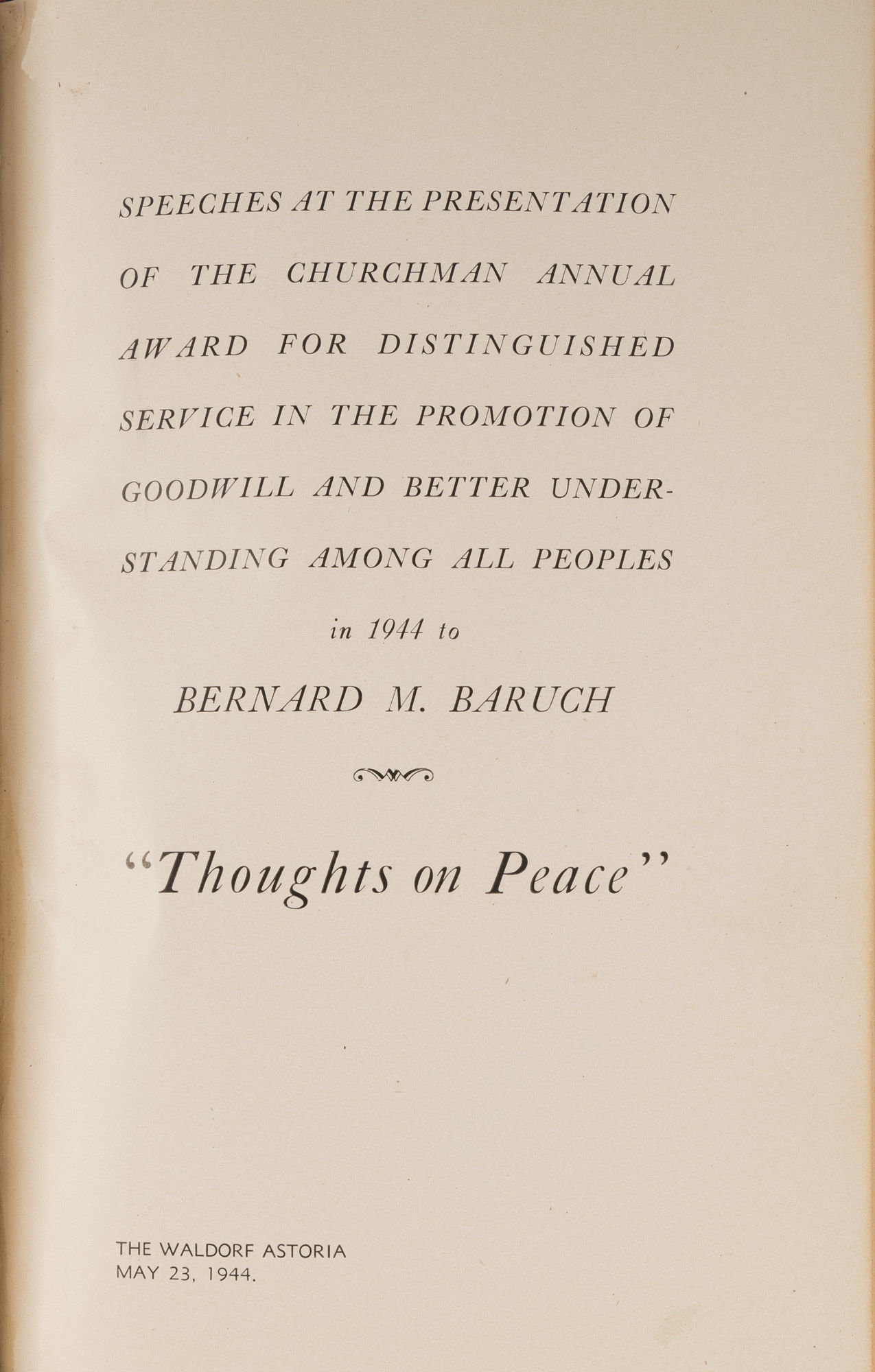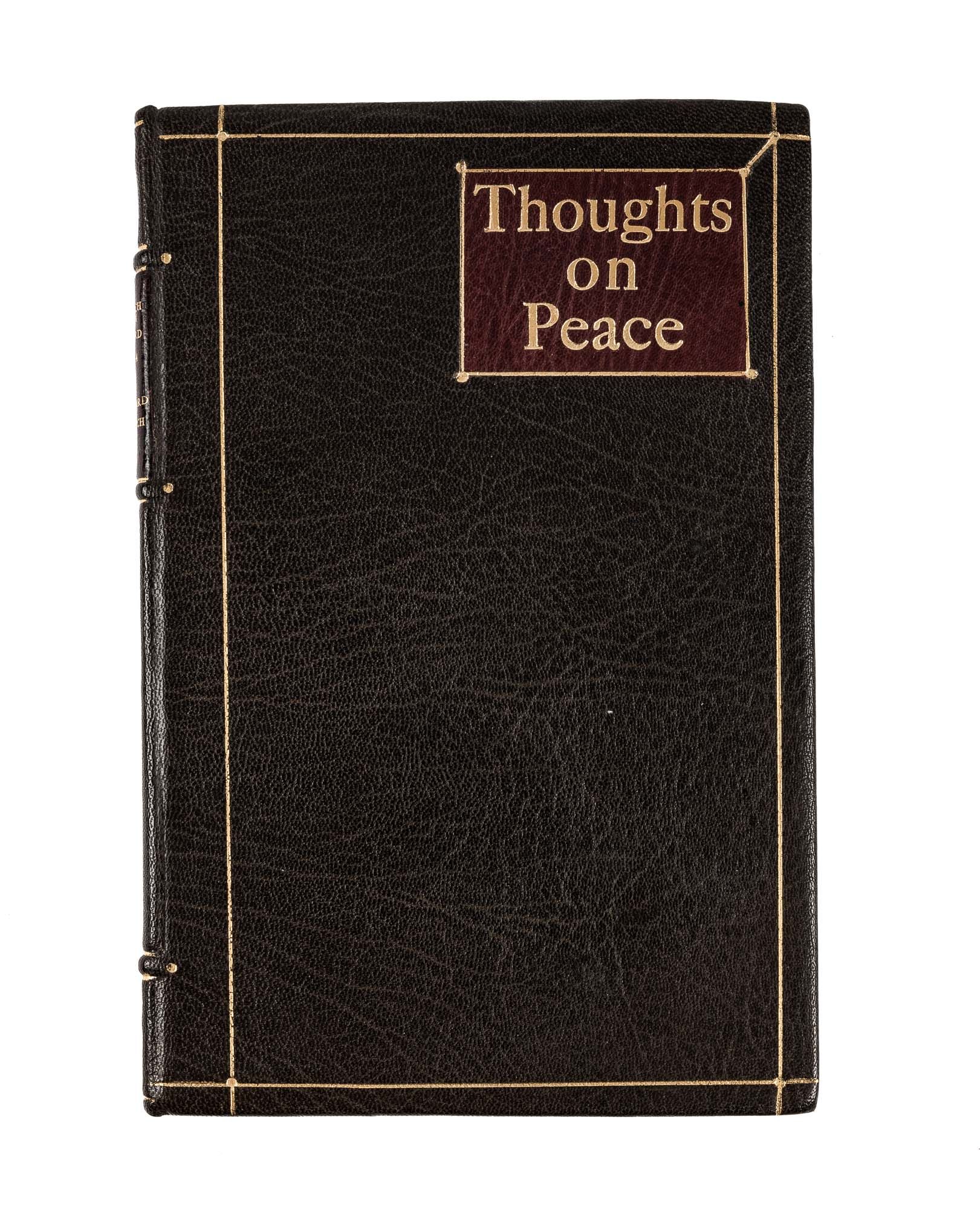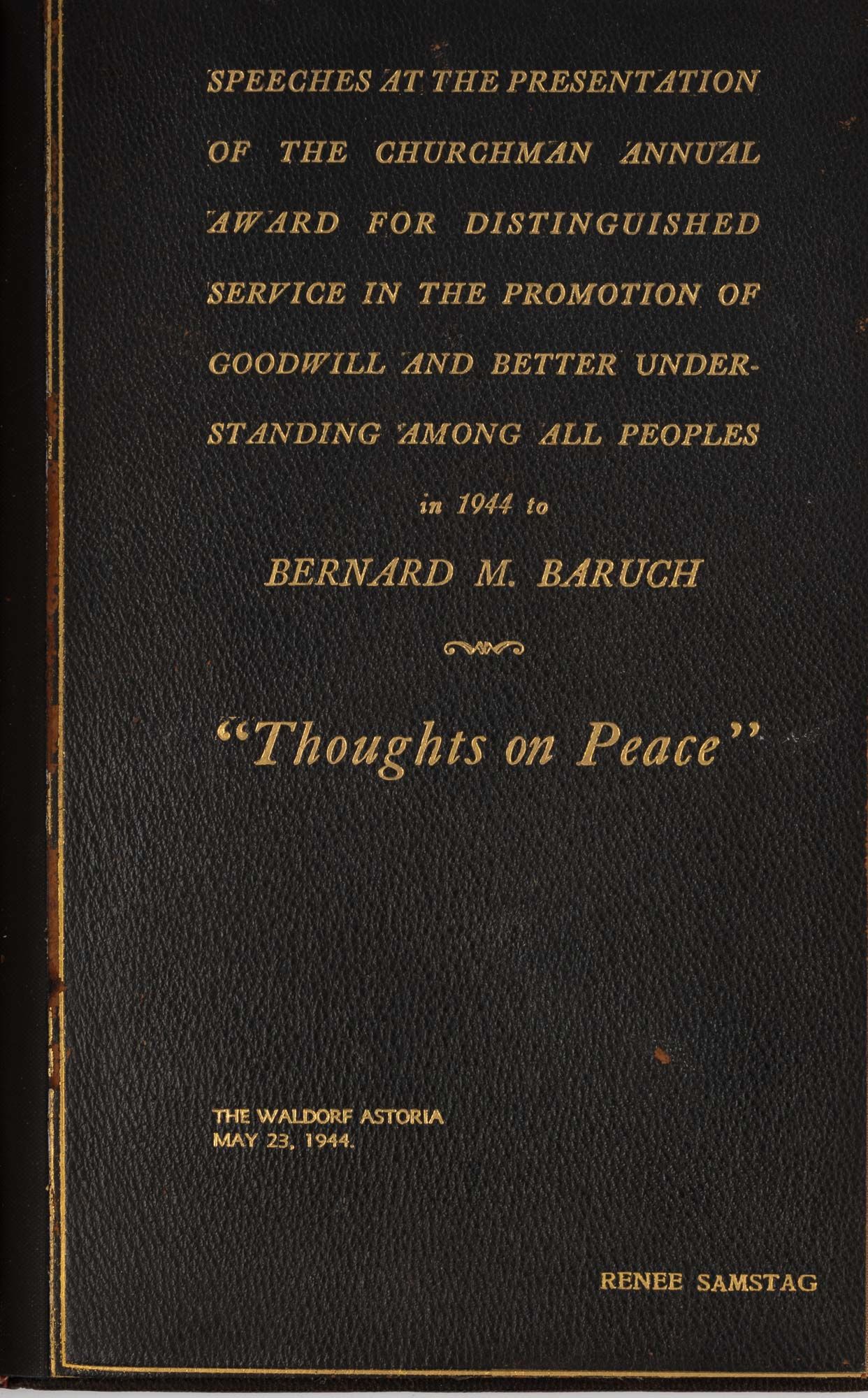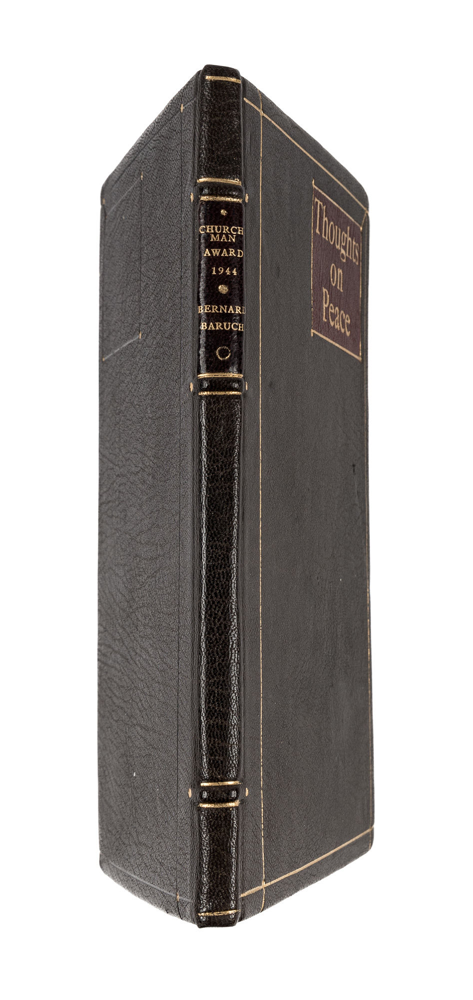 1944. Inscribed by an Eminent Statesman to his Daughter [Baruch, Bernard M. (1870-1965)]. "Thoughts on Peace." At head of title: Speeches at the Presentation of the Churchman Annual Award for Distinguished Service in the Promotion of Goodwill and Better Understanding Among All Peoples in 1944 to Bernard M. Baruch. [New York: The Churchman], 1944. 29 pp. Stiff morocco wrappers with gilt title and stamped name (Renee Samstag) to front wrapper, bound in recent goatskin, gilt rules to boards, gilt title to front board, raised bands and lettering piece to spine, original wrappers separated from text block and bound at rear. Light toning to interior, small surface tear to p. 7 not affecting text, presentation inscription "To Renee with love from chick (?) BM Baruch Oct 31st 1944." A notably handsome copy. $250. * Only edition. Bernard Baruch was an American financier, statesman and presidential advisor to Wilson and Roosevelt. He was the sixth recipient of The Churchman Award, presented by the magazine "to an individual who has rendered distinguished service 'in the promotion of goodwill and better understanding of all peoples.'" Previous recipients included Eleanor Roosevelt, Franklin Delano Roosevelt and William Allen White. Renee Baruch Samstag [1905-1944] was Baruch's youngest daughter. OCLC locates 9 copies of this title.