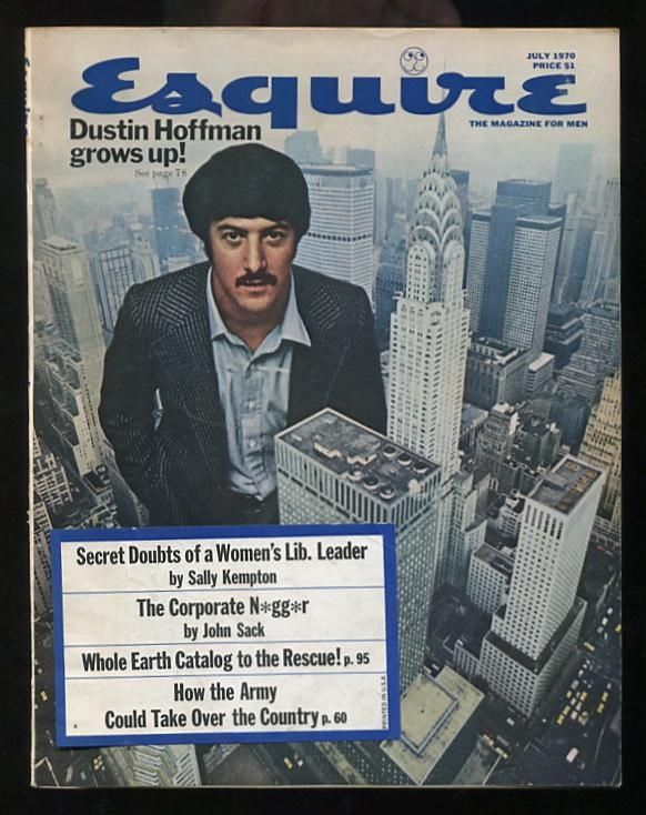 Chicago: Esquire, Inc.. Very Good+. 1970. (Vol. LXXIV, No. 1; whole no. 440). Magazine. [light handling wear only; includes small "headlines" label affixed to front cover (indicating that this was a newsstand, not subscription, copy)] (B&W/color photographs, ads, etc.) The featured article is "Cutting Loose" (blurbed on the contents page as "The Confessions of a Sufragette.") This "private view of the Women's Uprising" is by Sally Kempton, who is also the author of the cover feature, a profile of Dustin Hoffman entitled "Little Big Man Clings to Life," about Hoffman's life in New York. Also included in this issue: "En Garde, Foolish World!" by Dalton Trumbo, in which the once-blacklisted screenwriter prints a number of his letters, to Ring Lardner Jr., John Garfield, and others; "The Corporate N*gg*r" by John Sack ("Every company needs one. Wha' fo'?"); "Fiona," a story by Wright Morris. .