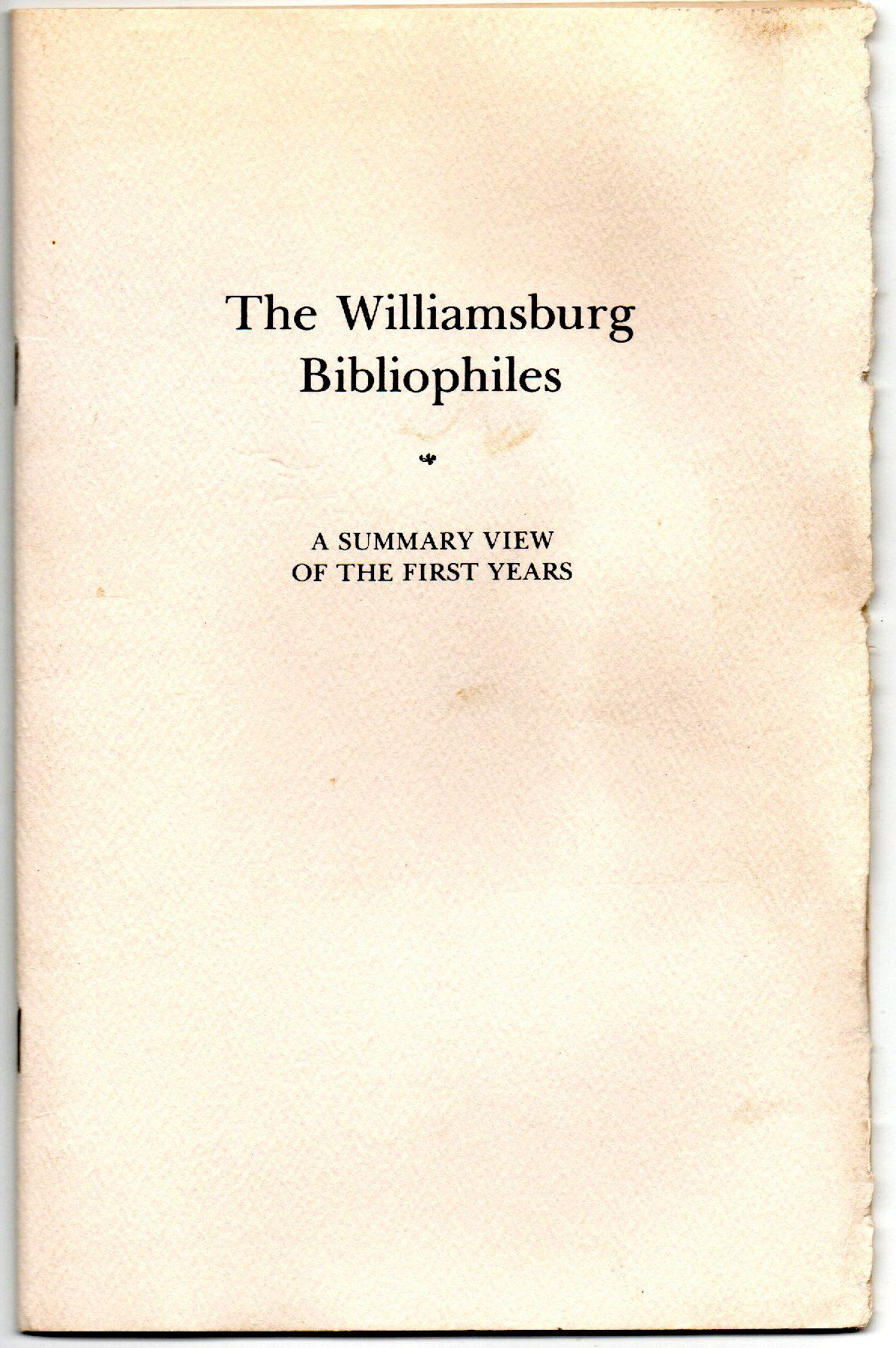 [Williamsburg]: Williamsburg Bibliophiles, 1990. Soft Cover. Near Fine binding. 8vo.; stapled pamphlet in tan printed wrappers; [vii], 15 pages.~~The Williamsburg Bibliophiles were organized in 1980 to further the interests of booklovers through programs on book collecting, fine printing, graphic arts and to encourage public interest in such pursuits through exhibits and lectures. The Williamsburg Bibliophiles were patterned after the Pittsburgh (Pa.) Bibliophiles.~~. Near Fine binding.