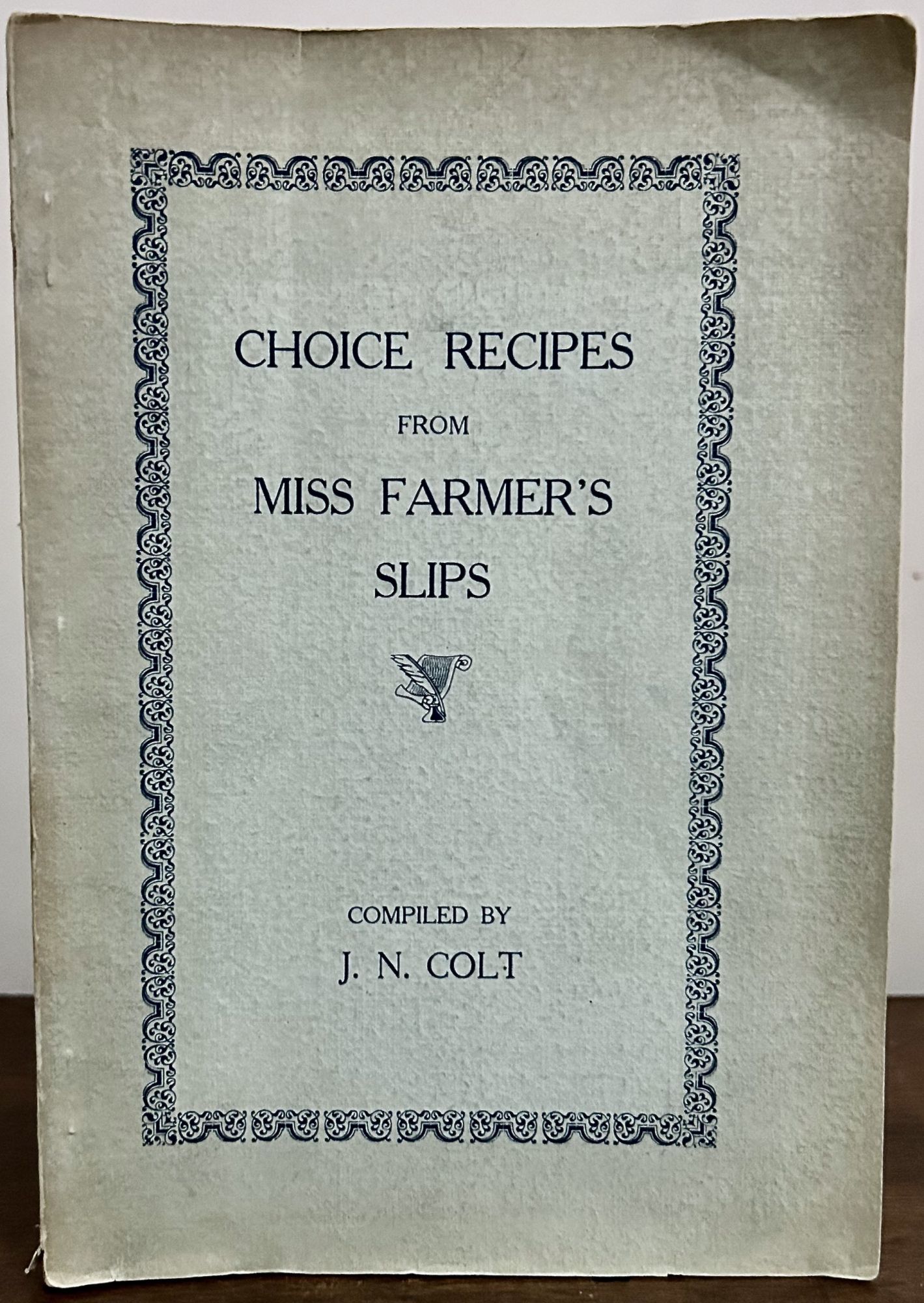 Boston: John W. Schaeffer & Co. (Boston, Mass.) printer, 1926. Wraps. Light green wrappers front cover border and text printed in blue. Very good. 3 unnumbered leaves, 41 leaves. 22 x 15.5 cm. OCLC: 1236247373. "Imprint date suggested from manuscript inscription on title page. Some recipes include wine or liquor as ingredients." Nicks to back cover fore-edge, interior clean and fresh.