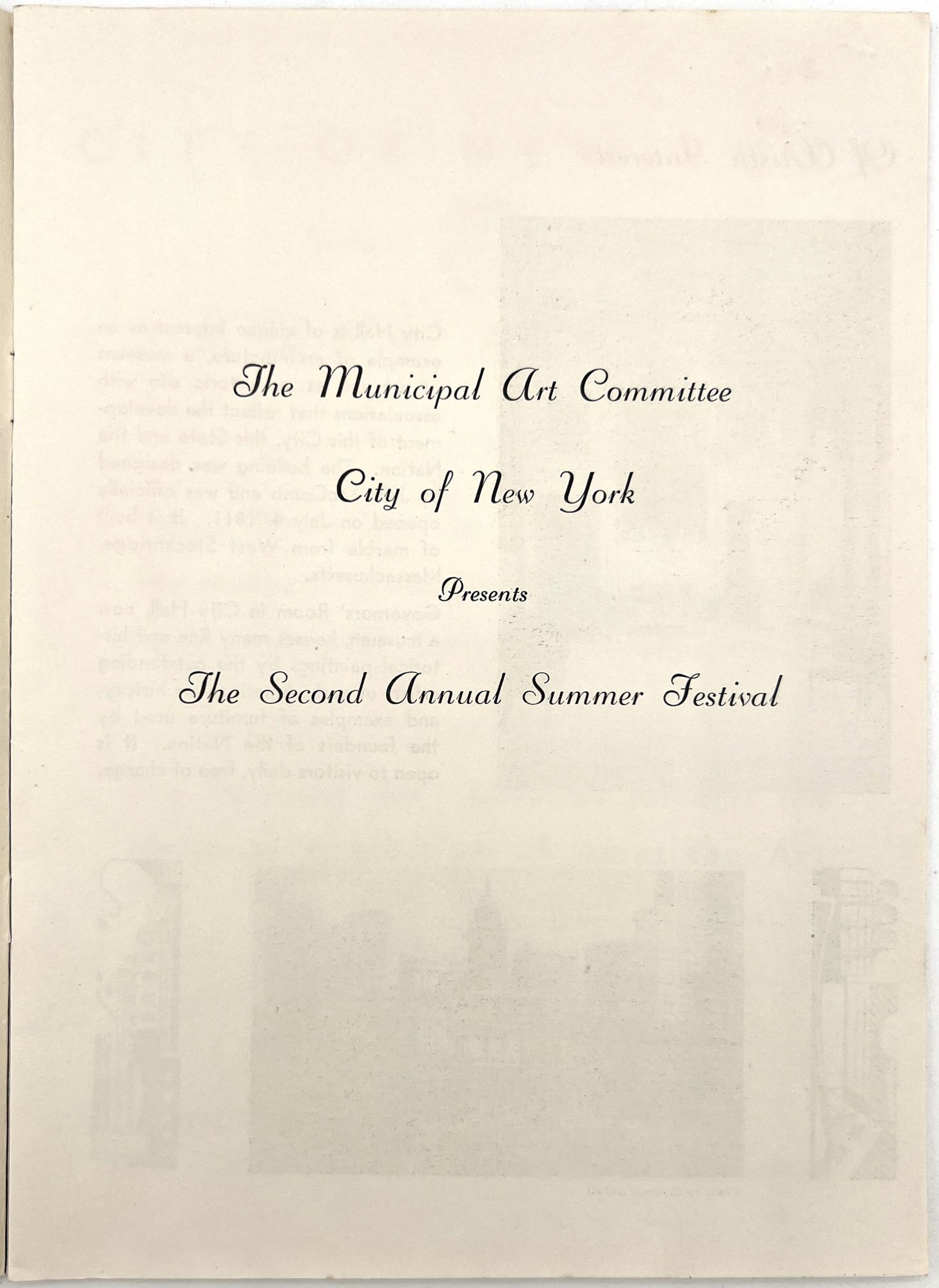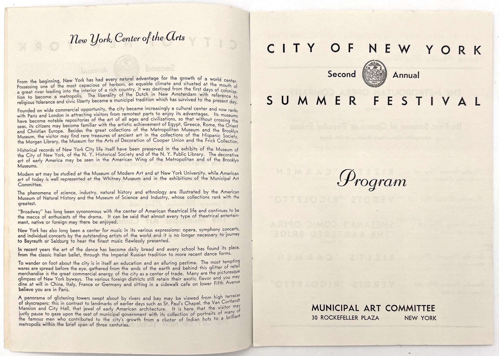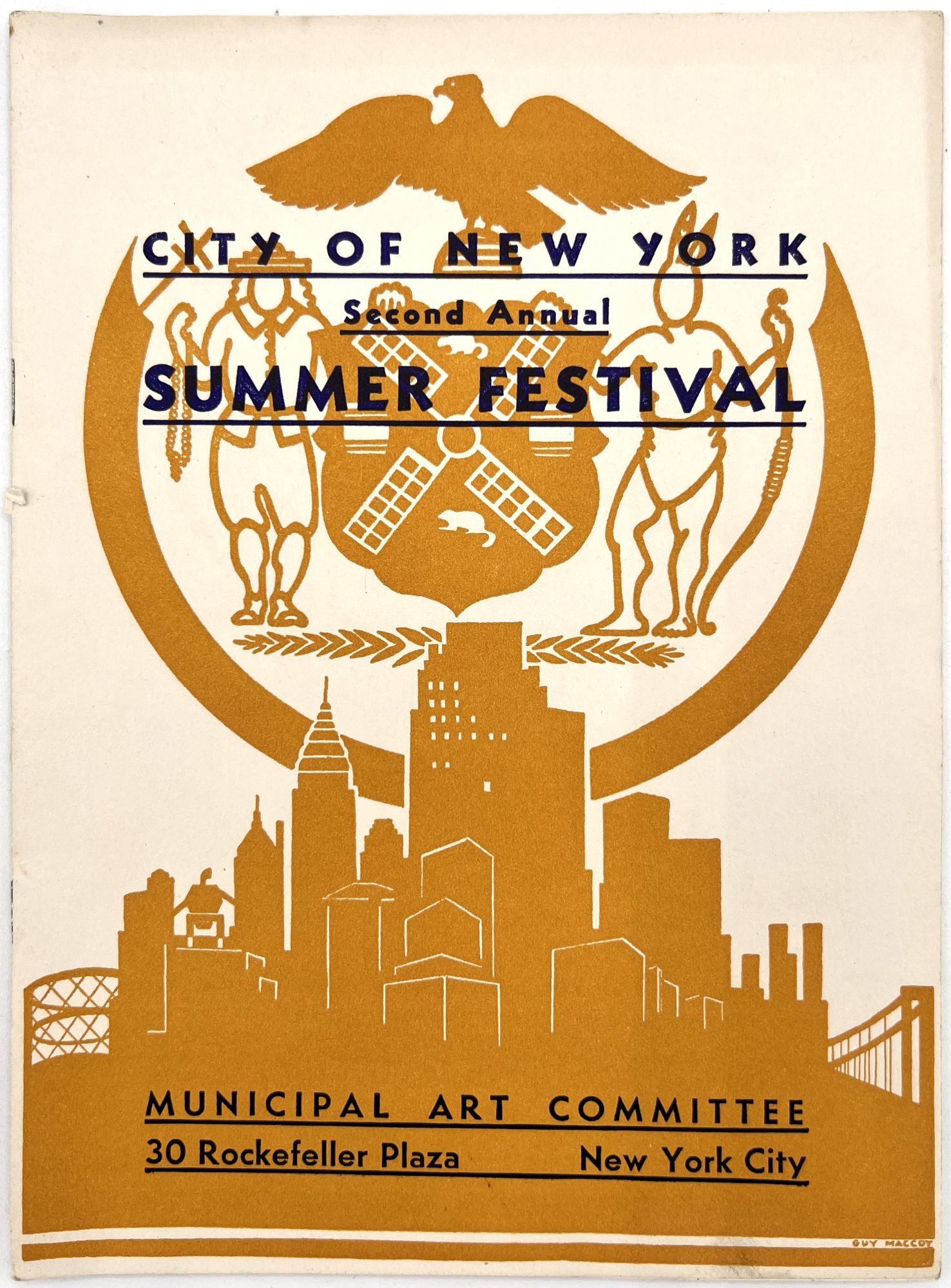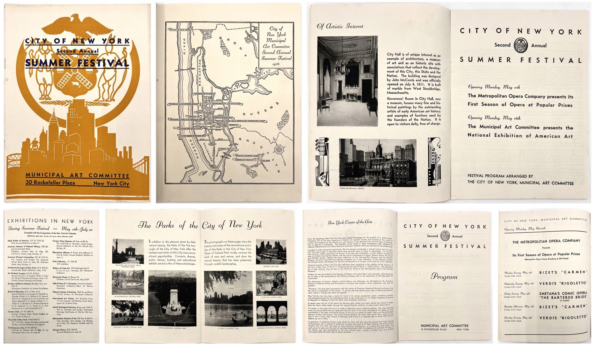 New York, New York: Municipal Art Committee, 1936. Near-fine. Minor rust staining from staples.. Illustrated booklet promoting the Second Annual Summer Festival of the City of New York, a grand celebration of the city's museums, parts, performances, and cultural events. Organized by the Municipal Art Committee, the festival opened with a performance by the Metropolitan Opera at the Metropolitan Opera House, and an exhibition of American art in Rockefeller Center. Includes a full listing of the city's exhibitions and museums, with addresses and hours, as well as photos of Central Park. Map with salient arts locations labeled on the inside of the lower wrapper. Single vol. (9.25" by 6.75"), pp. [14], illus., stapled in original illus. wrps printed in goldenrod and navy, with allegorical seal and skyline of the city.