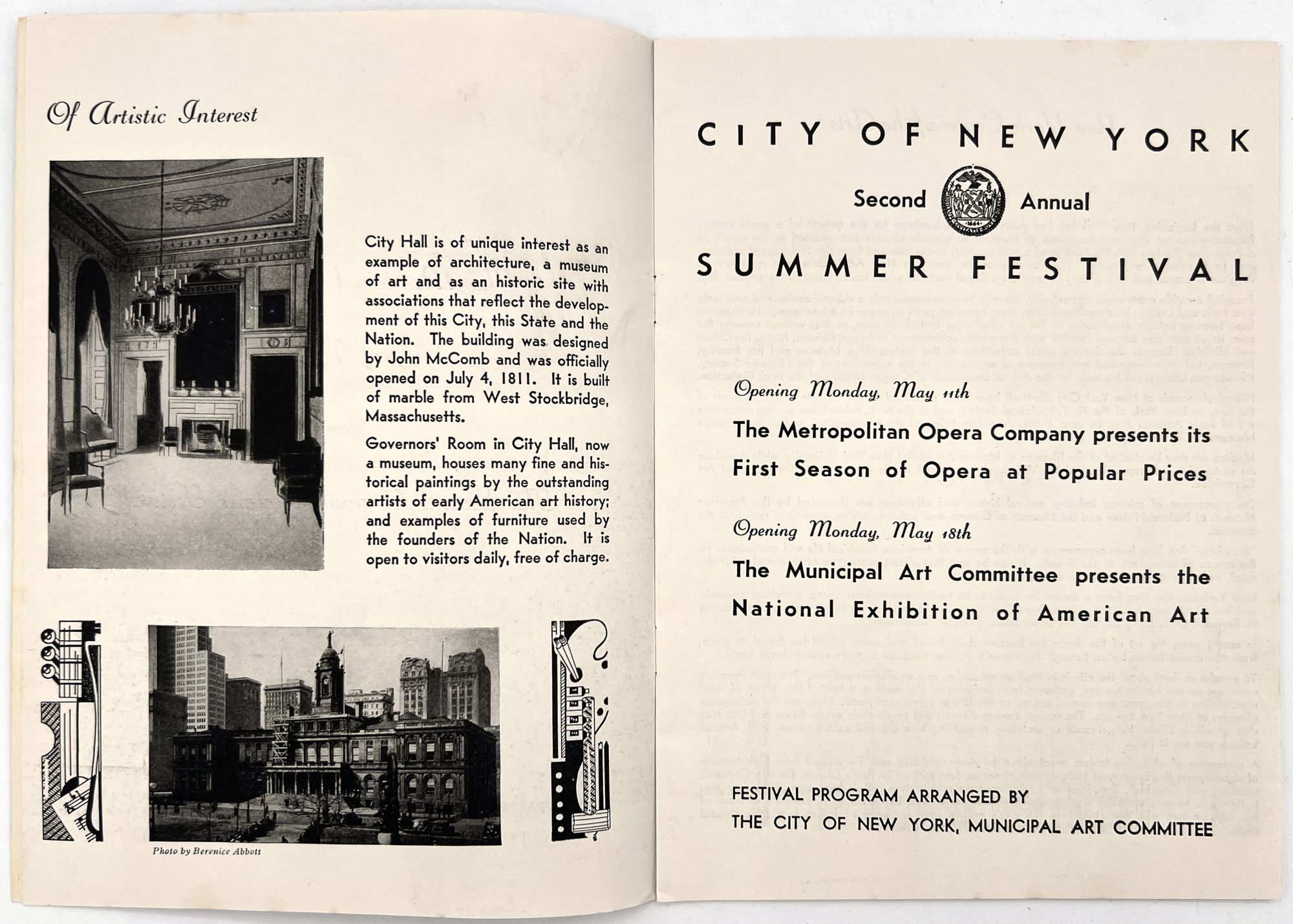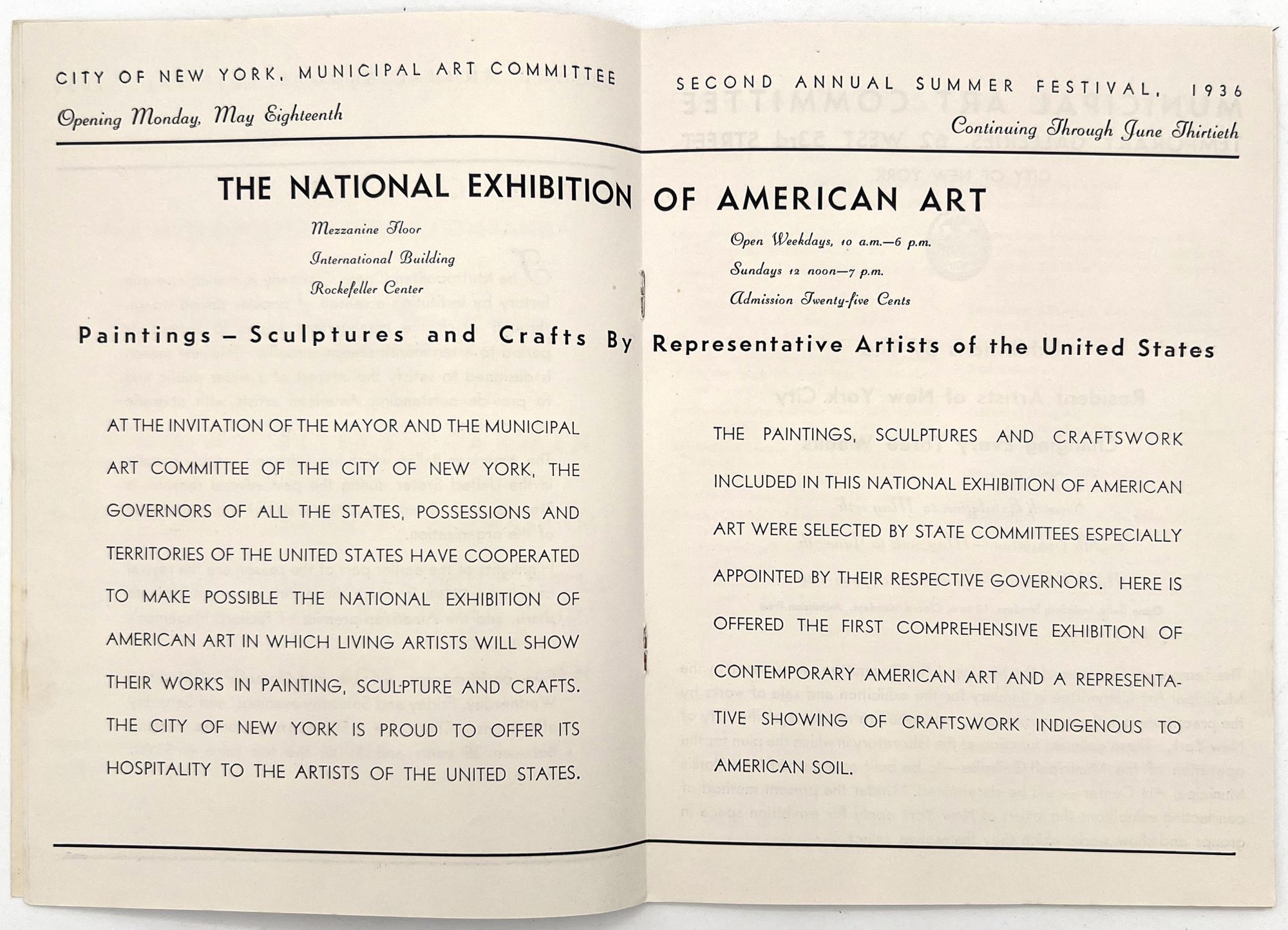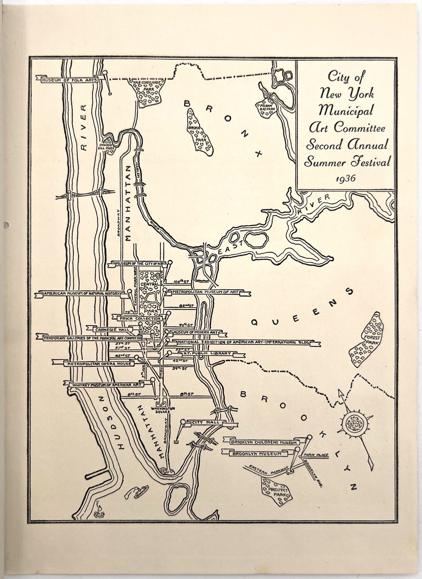 New York, New York: Municipal Art Committee, 1936. Near-fine. Minor rust staining from staples.. Illustrated booklet promoting the Second Annual Summer Festival of the City of New York, a grand celebration of the city's museums, parts, performances, and cultural events. Organized by the Municipal Art Committee, the festival opened with a performance by the Metropolitan Opera at the Metropolitan Opera House, and an exhibition of American art in Rockefeller Center. Includes a full listing of the city's exhibitions and museums, with addresses and hours, as well as photos of Central Park. Map with salient arts locations labeled on the inside of the lower wrapper. Single vol. (9.25" by 6.75"), pp. [14], illus., stapled in original illus. wrps printed in goldenrod and navy, with allegorical seal and skyline of the city.