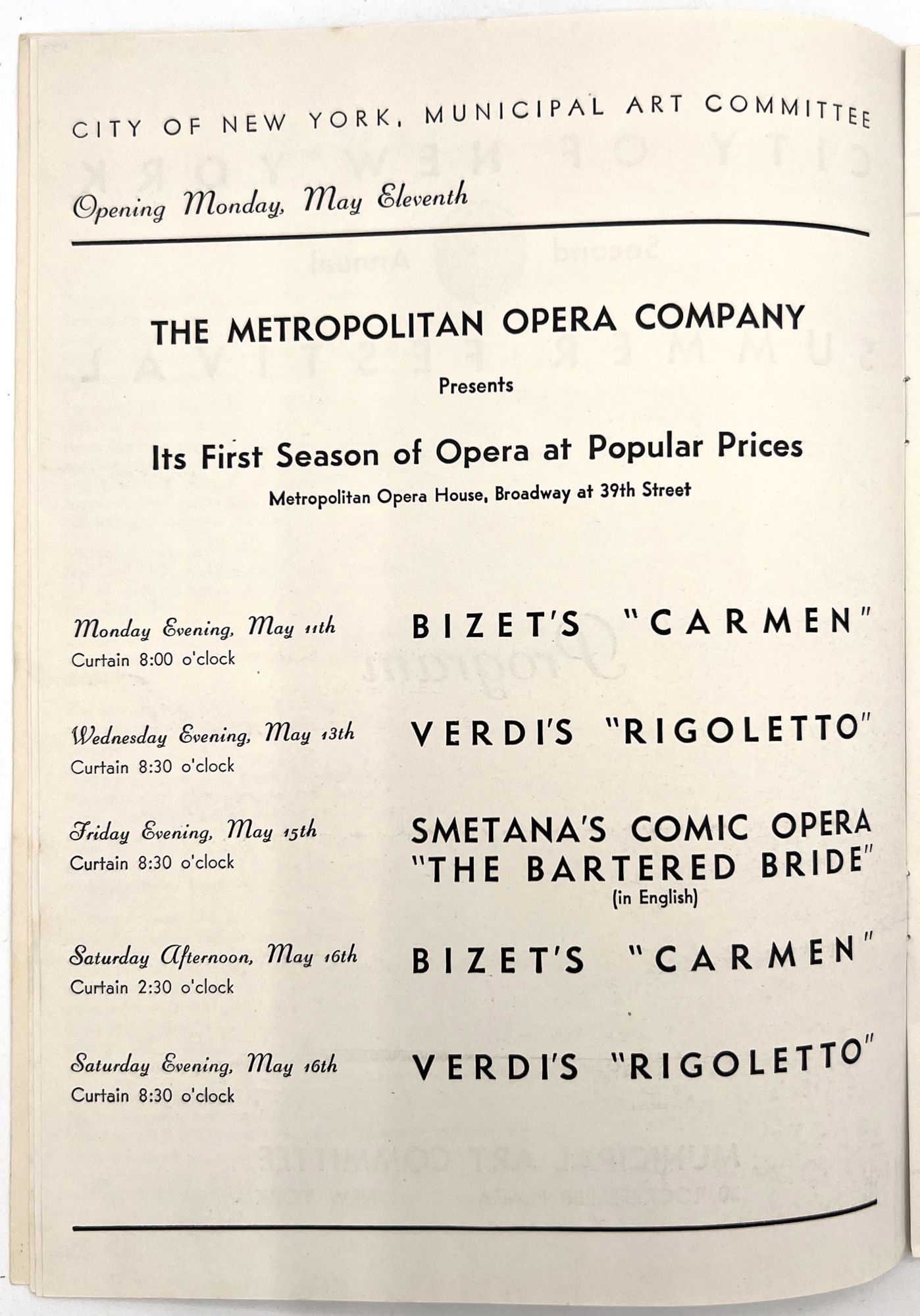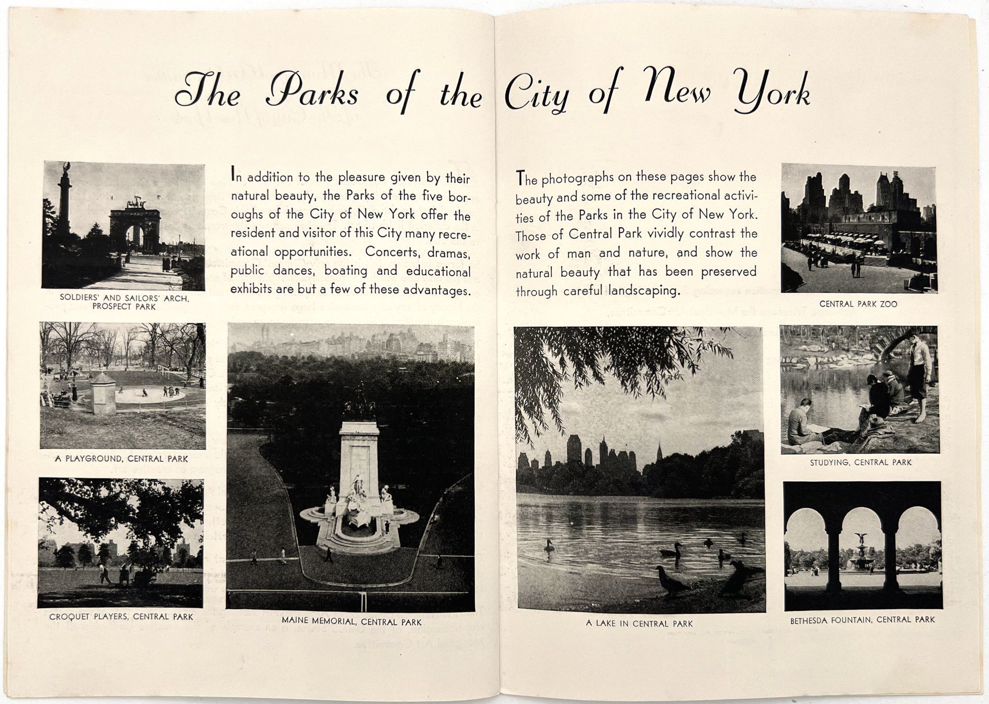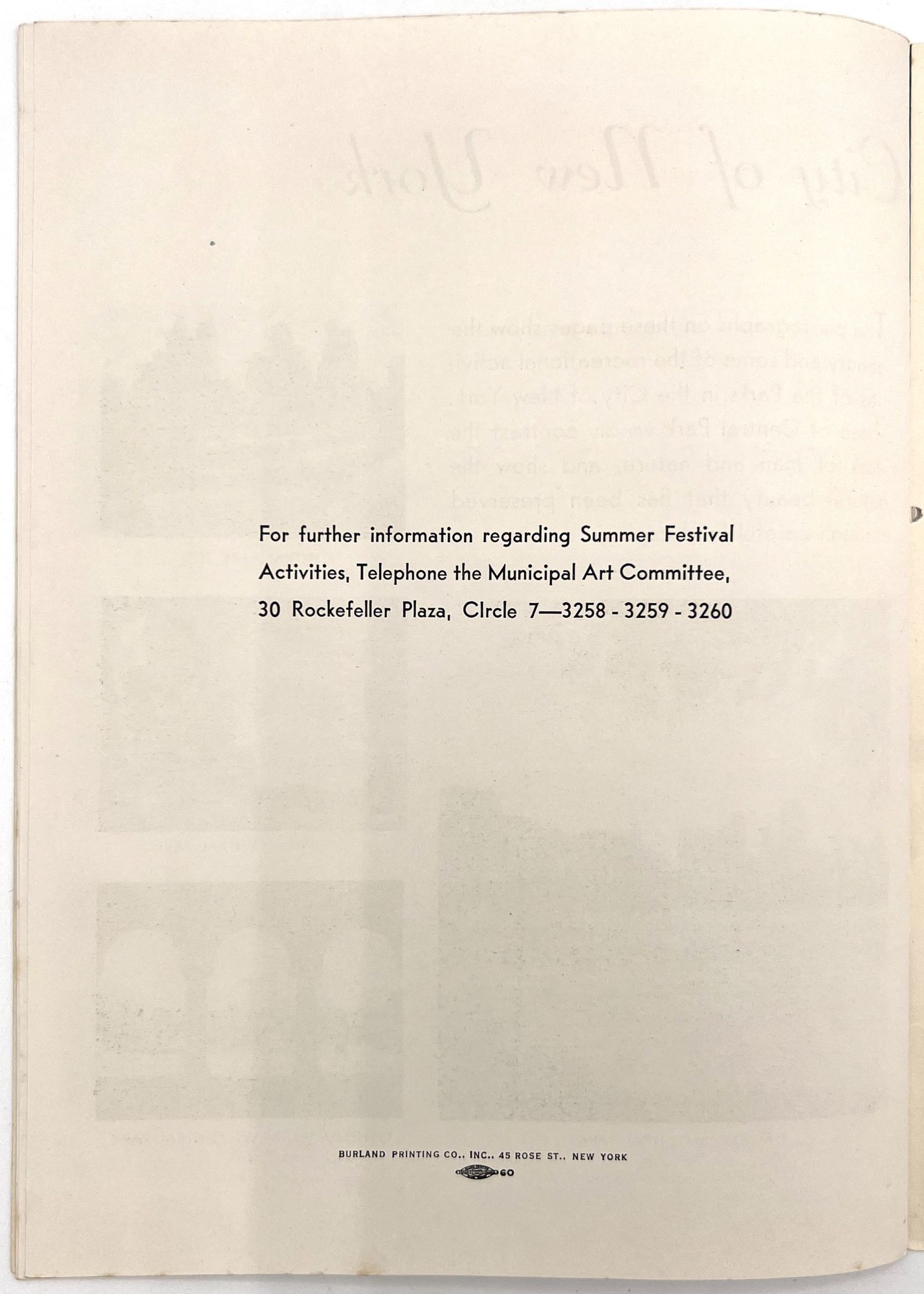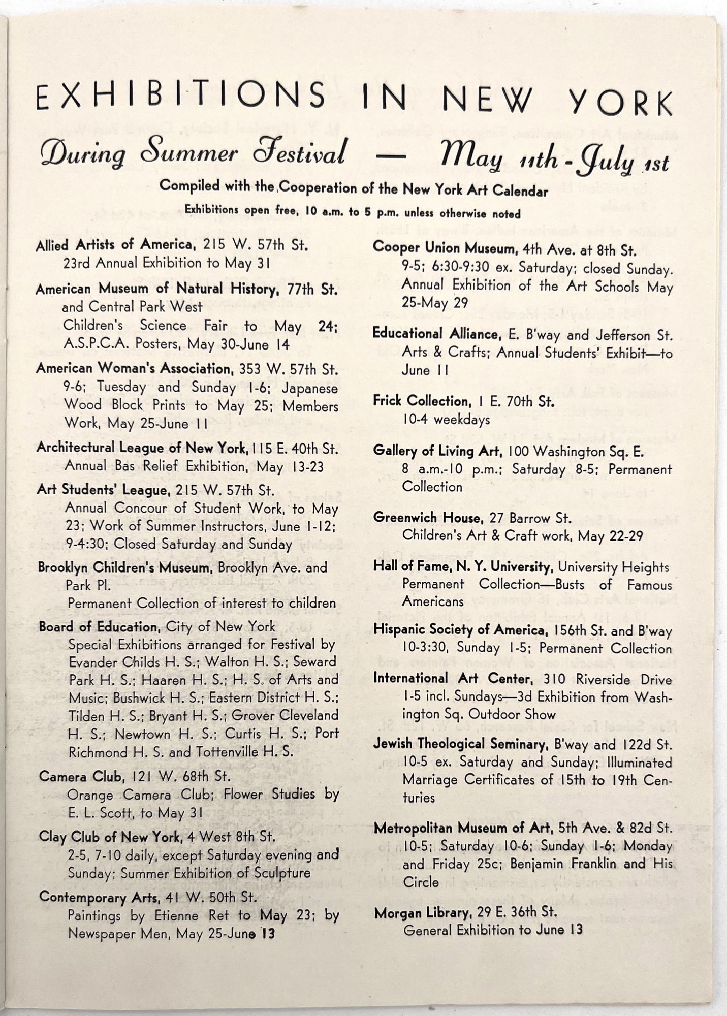 New York, New York: Municipal Art Committee, 1936. Near-fine. Minor rust staining from staples.. Illustrated booklet promoting the Second Annual Summer Festival of the City of New York, a grand celebration of the city's museums, parts, performances, and cultural events. Organized by the Municipal Art Committee, the festival opened with a performance by the Metropolitan Opera at the Metropolitan Opera House, and an exhibition of American art in Rockefeller Center. Includes a full listing of the city's exhibitions and museums, with addresses and hours, as well as photos of Central Park. Map with salient arts locations labeled on the inside of the lower wrapper. Single vol. (9.25" by 6.75"), pp. [14], illus., stapled in original illus. wrps printed in goldenrod and navy, with allegorical seal and skyline of the city.