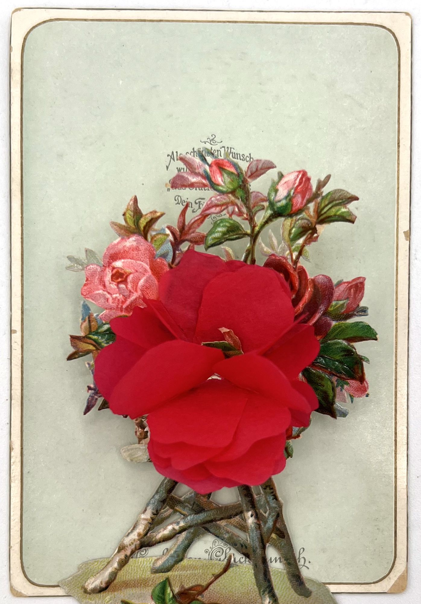 Germany, 1880. Very good. Minor dust soiling.. A most charming German greeting card with a clever mechanism: when the embossed die-cut scrap is pulled down, the red tissue paper flower unfolds and reveals itself along with a hidden message wishing the reader happiness. The scrap depicts a rosy floral arrangement sitting atop a birch wood table with a dove. Measures approx. 4.5" by 3