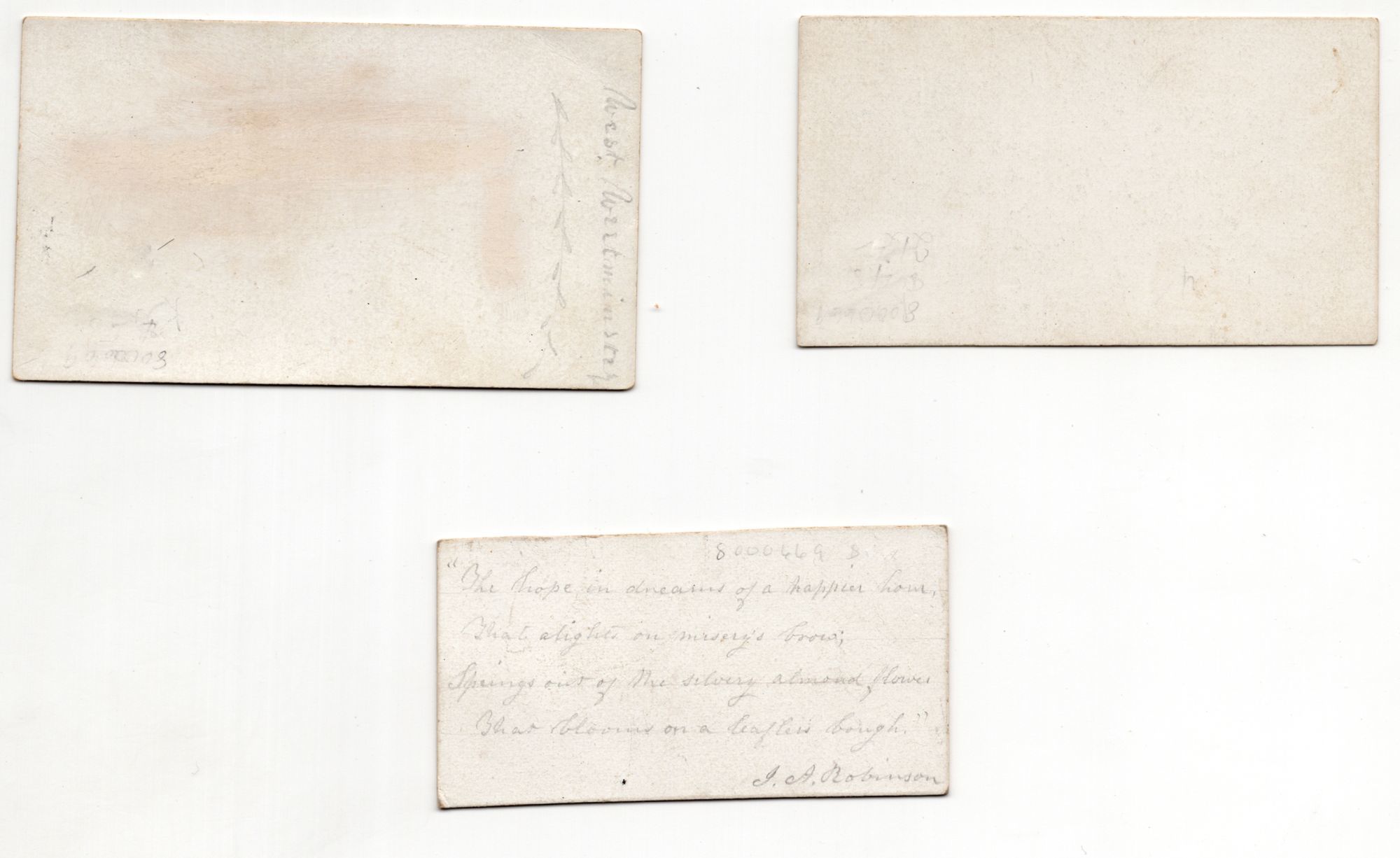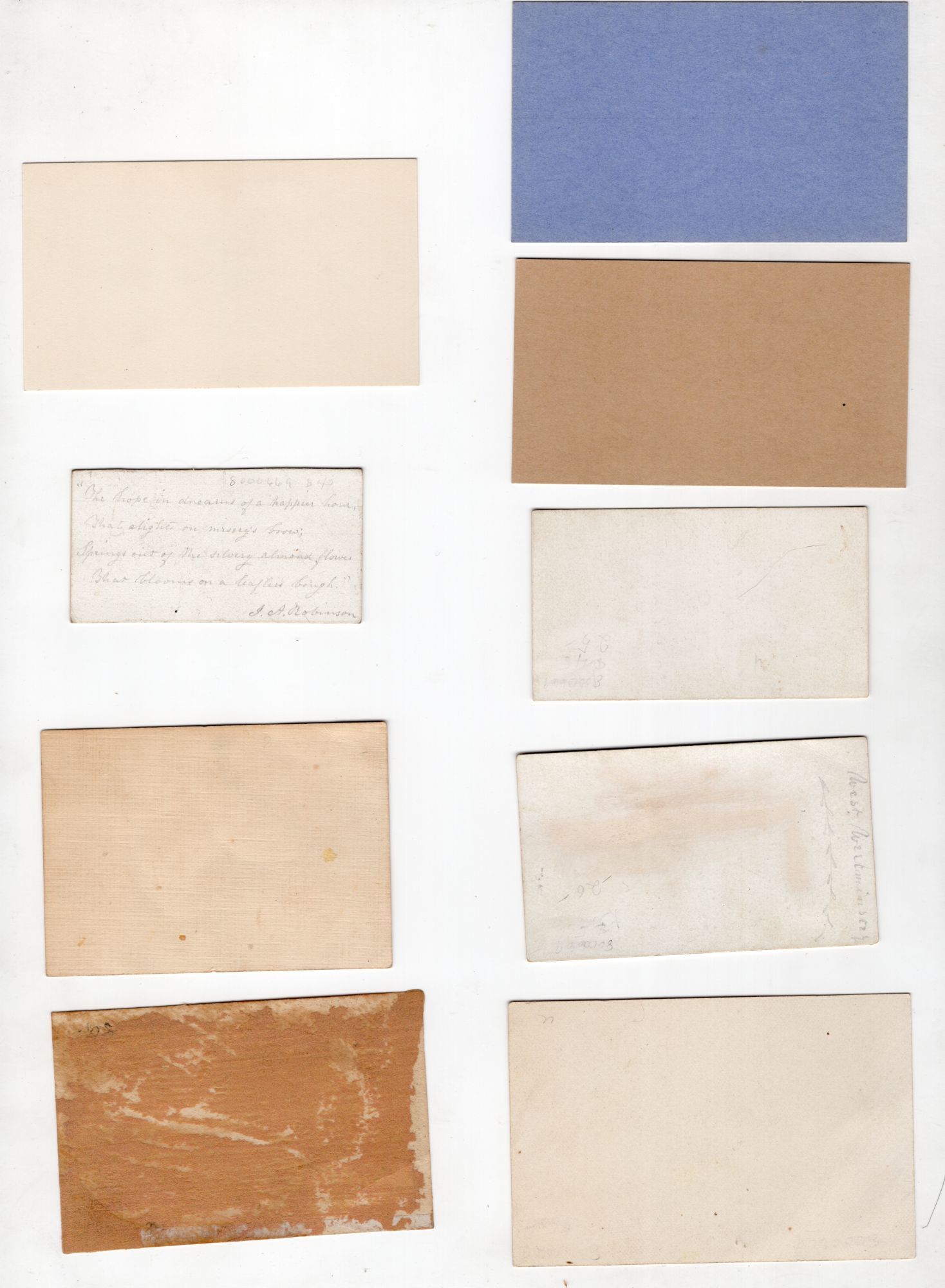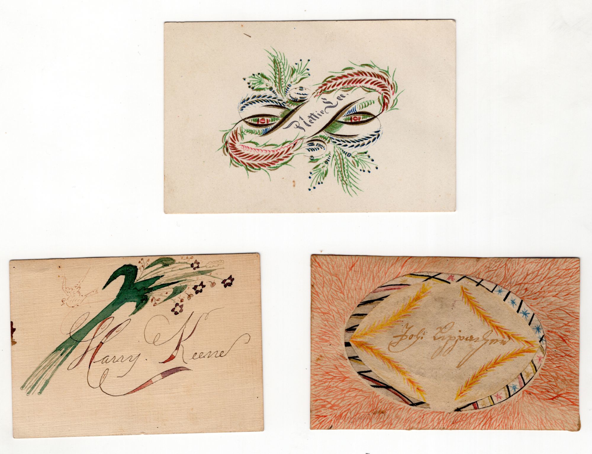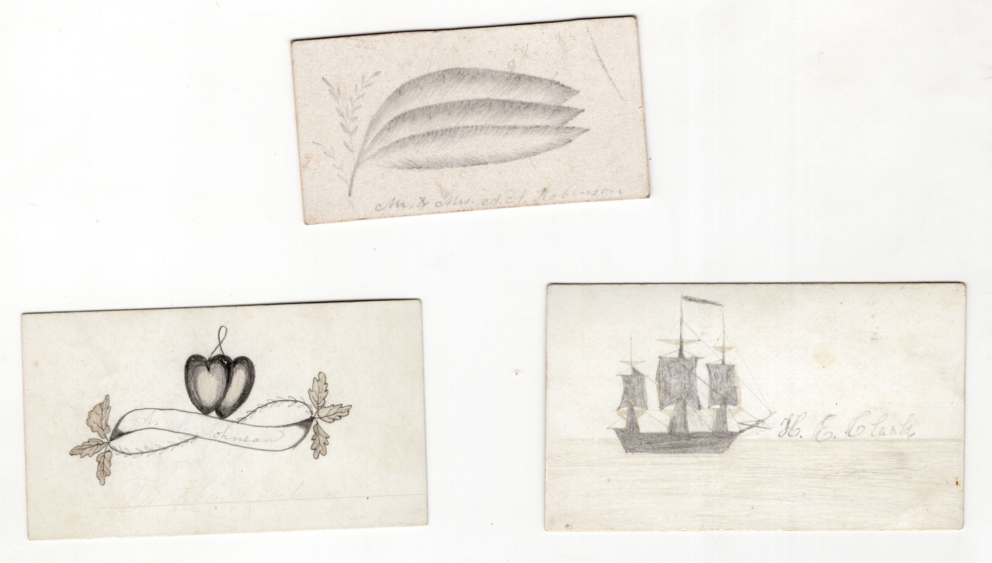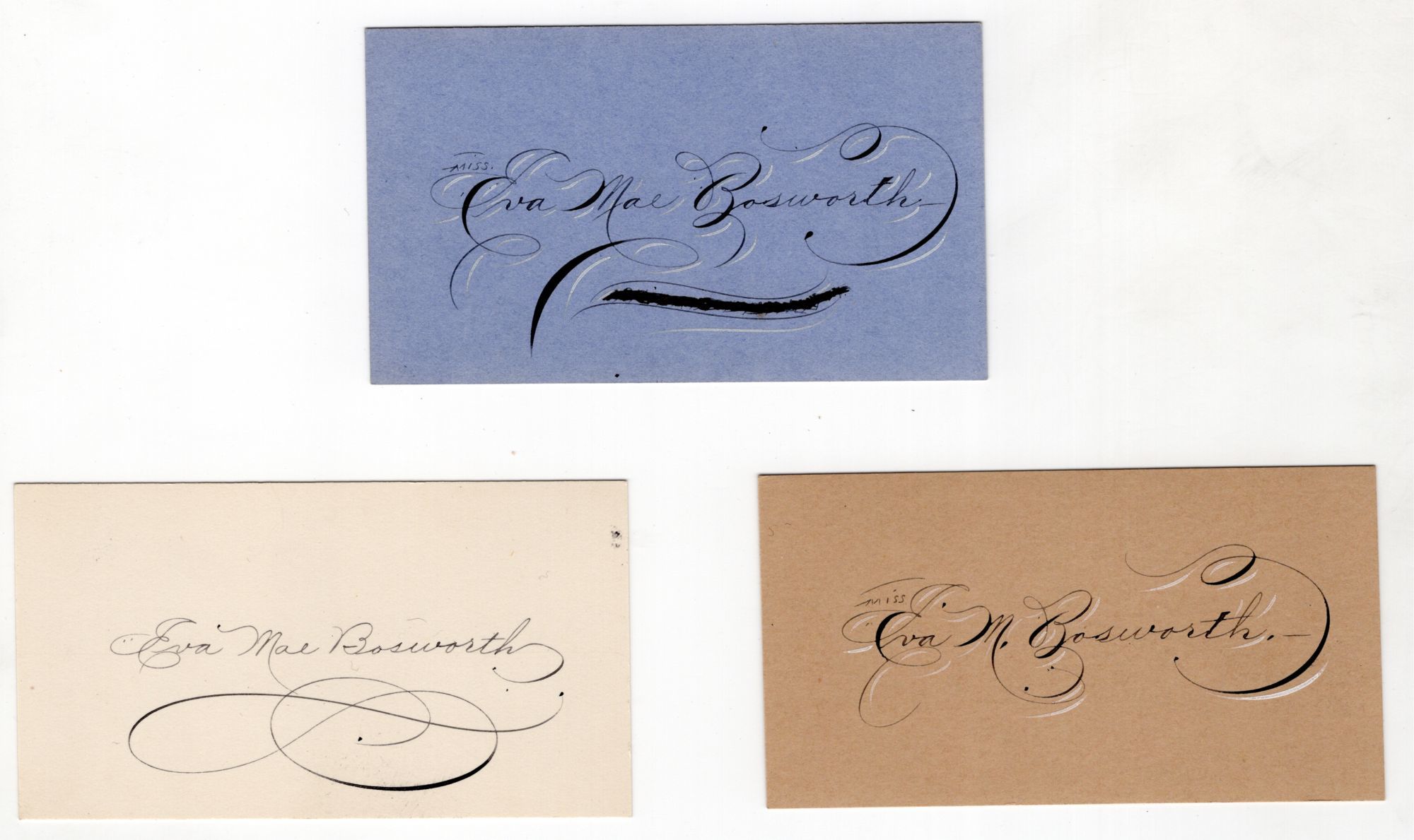 United States, 19th century. Very good.. Eight (8) hand-lettered calling cards/tokens of friendship, displaying a range of techniques and artistic skill. Nicely represents the 19th century practice of calligraphic drawing, especially in the example lettered "Hettie Lee", which employs five different ink colors and calligraphic flourishes. Other imagery includes a ship at sea ("H.E.Clark"), two entwined hearts ("A.[?] Johnson"), three feathers ("Mr. & Mrs. A. A. Robinson"), and a sprig of wildflowers. Two of the cards are for "Eva Mae Bosworth" in a very fine calligraphic hand. Smallest measures 1.75" by 3", largest measures 2.5" by 3.5