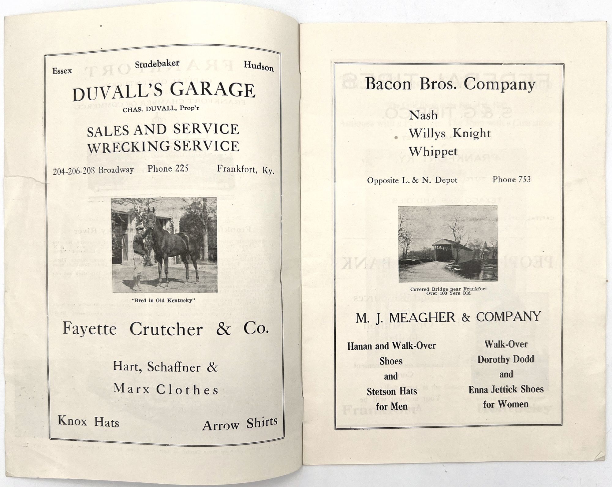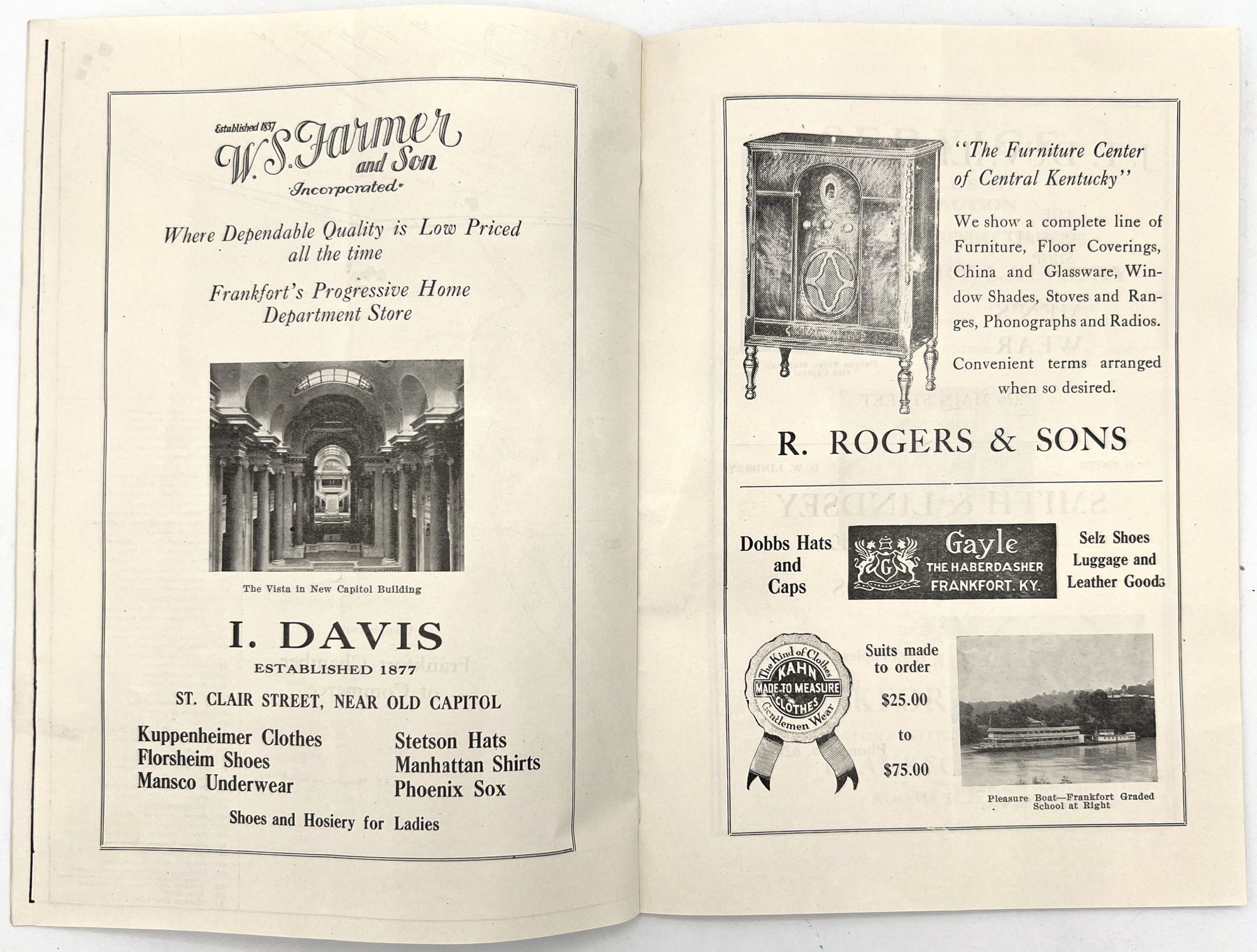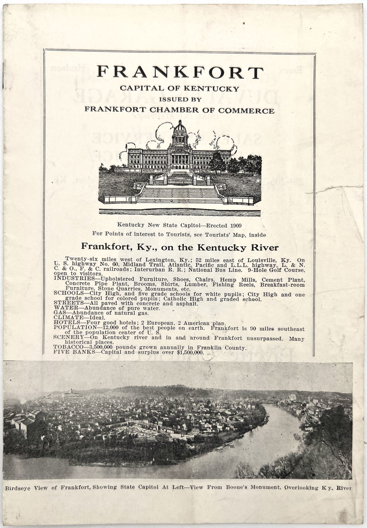 Frankfort, Kentucky: Frankfort Chamber of Commerce, 1930. Good to very good. Minor dust soiling. Short tear to first leaf.. Illustrated tourism brochure for the capitol of the state of Kentucky, Frankfort, published by their Chamber of Commerce in the 1930s. Comprised largely of advertisements for local businesses, it provides a valuable snapshot into the area's local commerce at this time, and the businesses essential to its economy and identity. Includes a two-page spread map of the town, which spans the banks of the Kentucky River. First leaf includes illustration of the Capitol building, a panorama photo of the city, and several selling points/draws (e.g. 3,500,000 lbs of tobacco grown in Franklin County annually, paved streets, and the main industries: furniture, concrete, lumber, quarries. Single vol. (8.75" by 6.25"), pp. [24], illus., original illus. self wrps. Includes adverts for ladies' clothing, confectionaries, the local cinema, hotels, and repair shops.