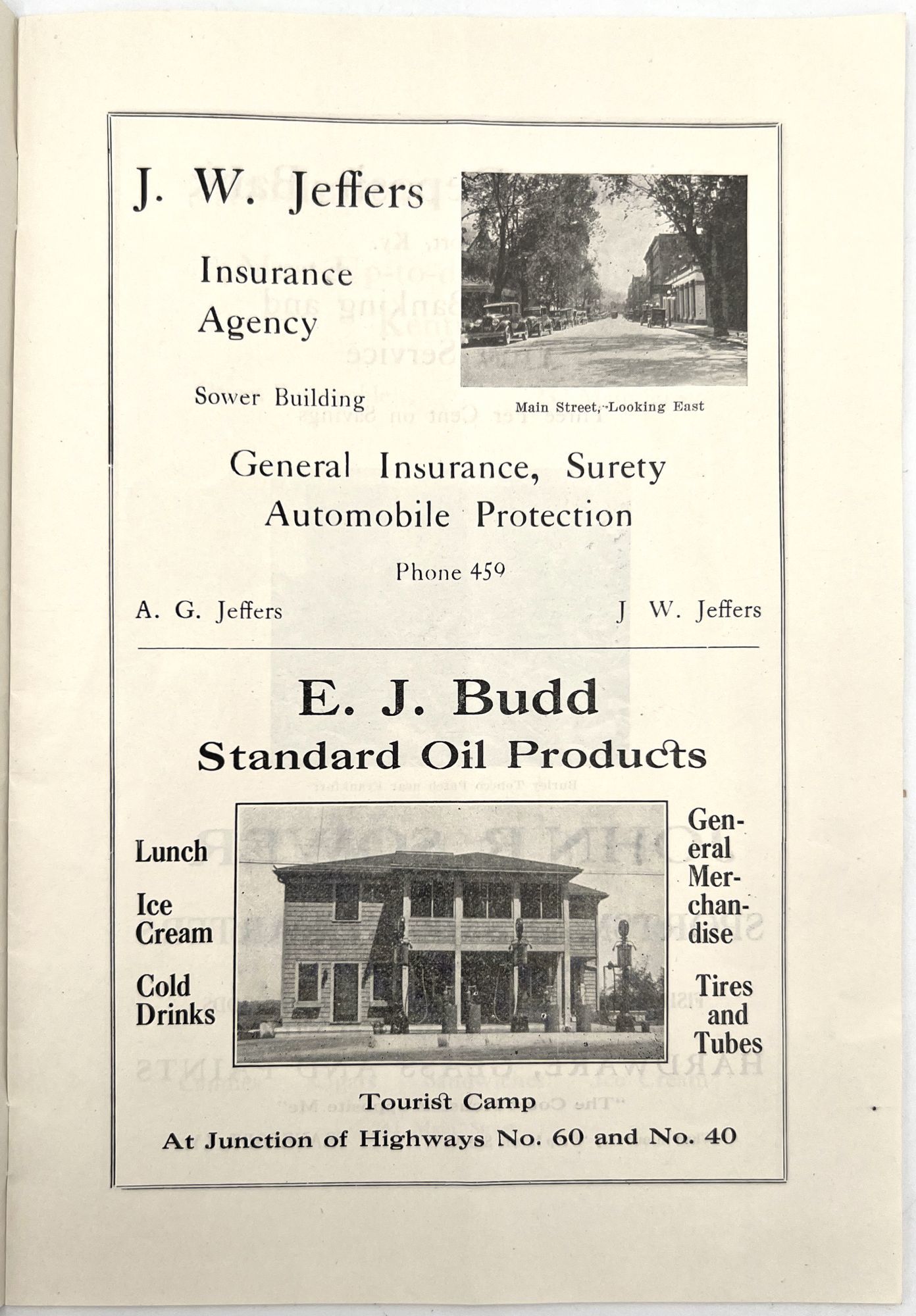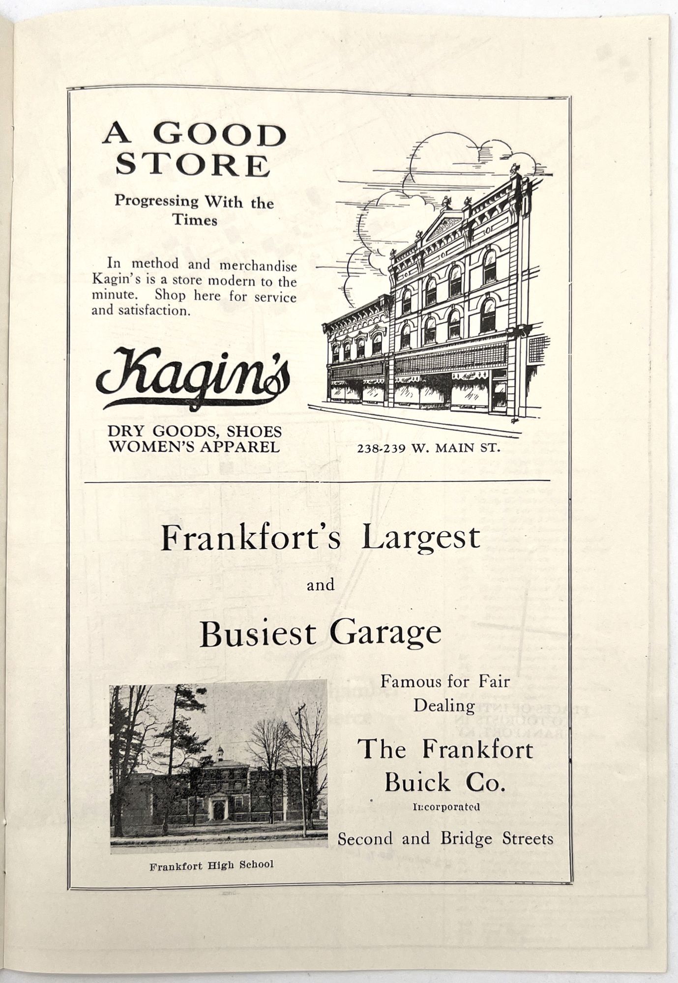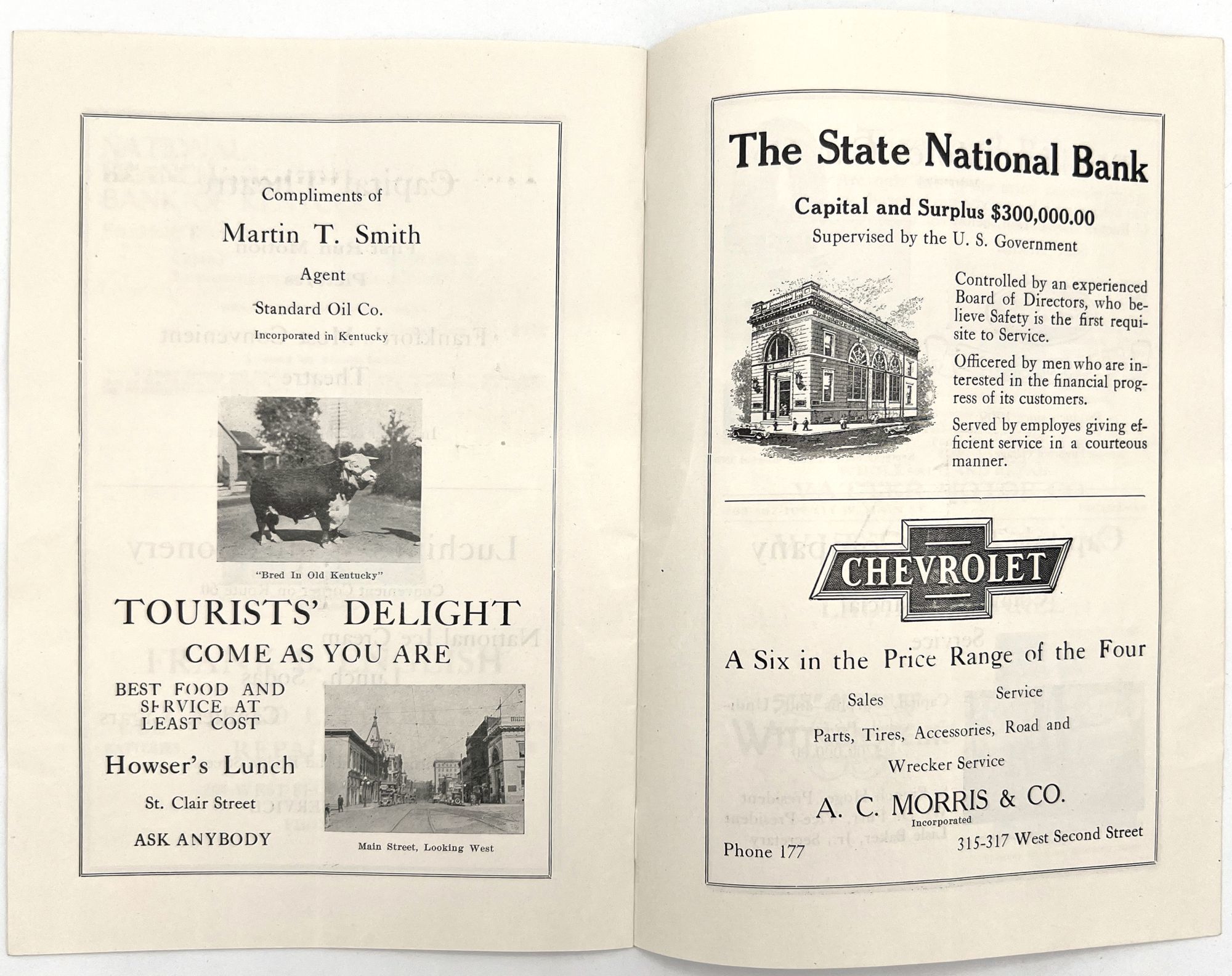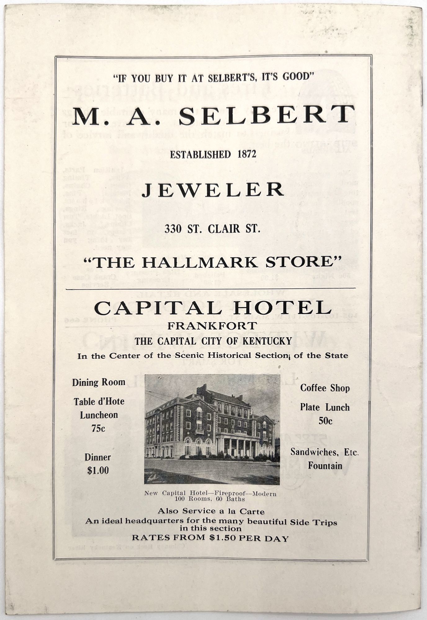 Frankfort, Kentucky: Frankfort Chamber of Commerce, 1930. Good to very good. Minor dust soiling. Short tear to first leaf.. Illustrated tourism brochure for the capitol of the state of Kentucky, Frankfort, published by their Chamber of Commerce in the 1930s. Comprised largely of advertisements for local businesses, it provides a valuable snapshot into the area's local commerce at this time, and the businesses essential to its economy and identity. Includes a two-page spread map of the town, which spans the banks of the Kentucky River. First leaf includes illustration of the Capitol building, a panorama photo of the city, and several selling points/draws (e.g. 3,500,000 lbs of tobacco grown in Franklin County annually, paved streets, and the main industries: furniture, concrete, lumber, quarries. Single vol. (8.75" by 6.25"), pp. [24], illus., original illus. self wrps. Includes adverts for ladies' clothing, confectionaries, the local cinema, hotels, and repair shops.