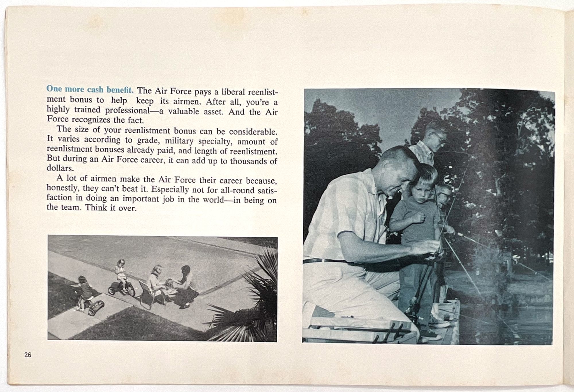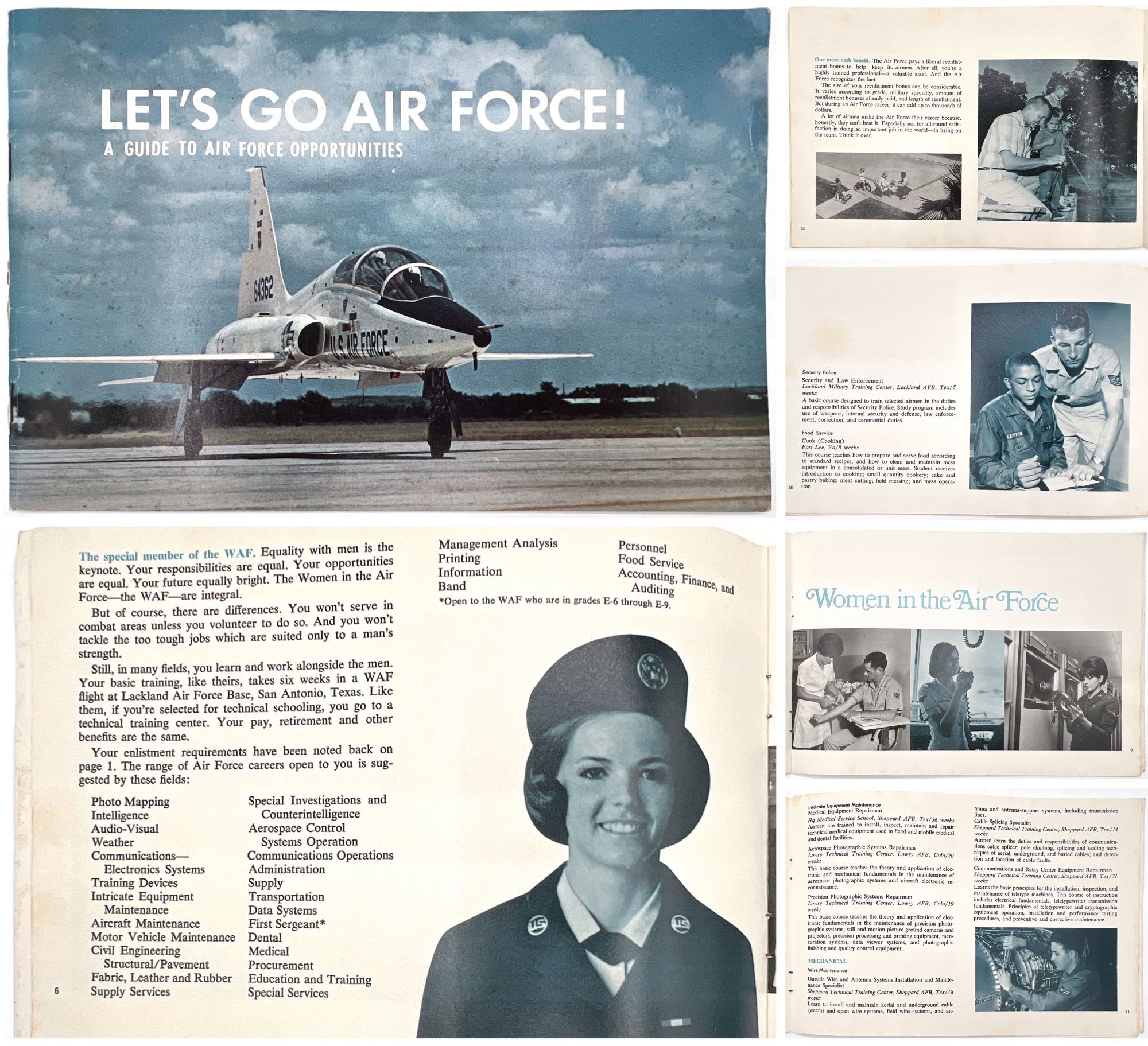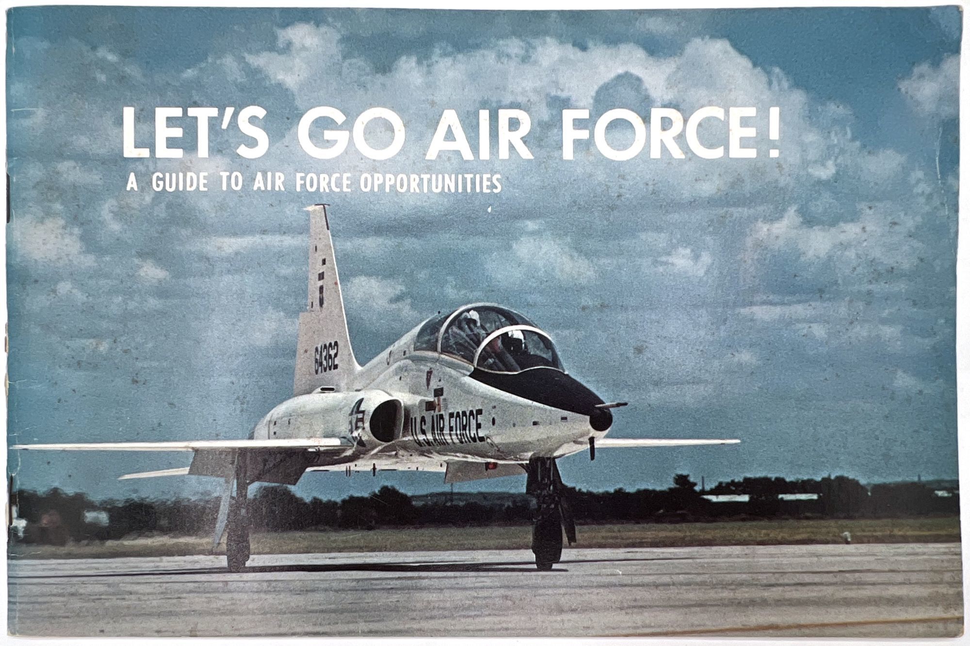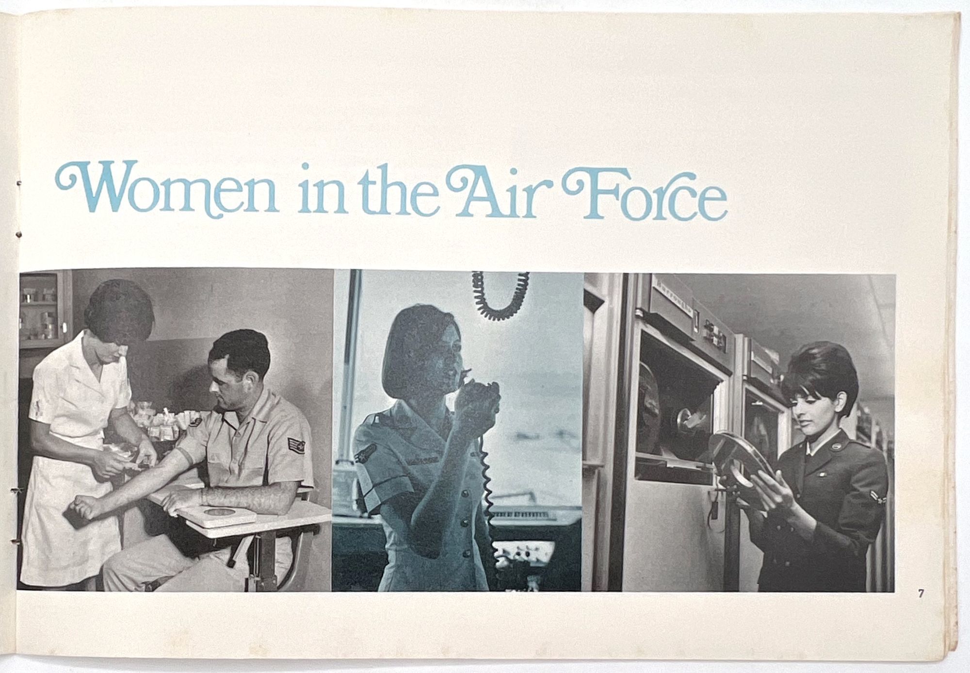 United States: U.S. Air Force, 1972. Very good. Minor dust soiling, extremities worn.. A guide to career opportunities in the Air Force, published for teens and young adults. Featuring an illustration of a plane on a runway on the front, the booklet aims to paint military service as an exciting and fulfilling career path rife with opportunities for advancement. Includes an index of different job titles in the back ranging from Helicopter Mechanic to Marksmanship Instructor, Photographer, Weather Observer and Air Traffic Control Officer. Note that it includes a message to parents in the front of the booklet, easing their fears. Offers information on benefits, what it's like living on base, and offers brief descriptions of the different roles. An interesting view into military recruitment c.1972, at a time when the military found it difficult to recruit young people (Vietnam War). Single vol. (6" by 9"), pp. 28, illus., stapled in original photo- illus. wrps.