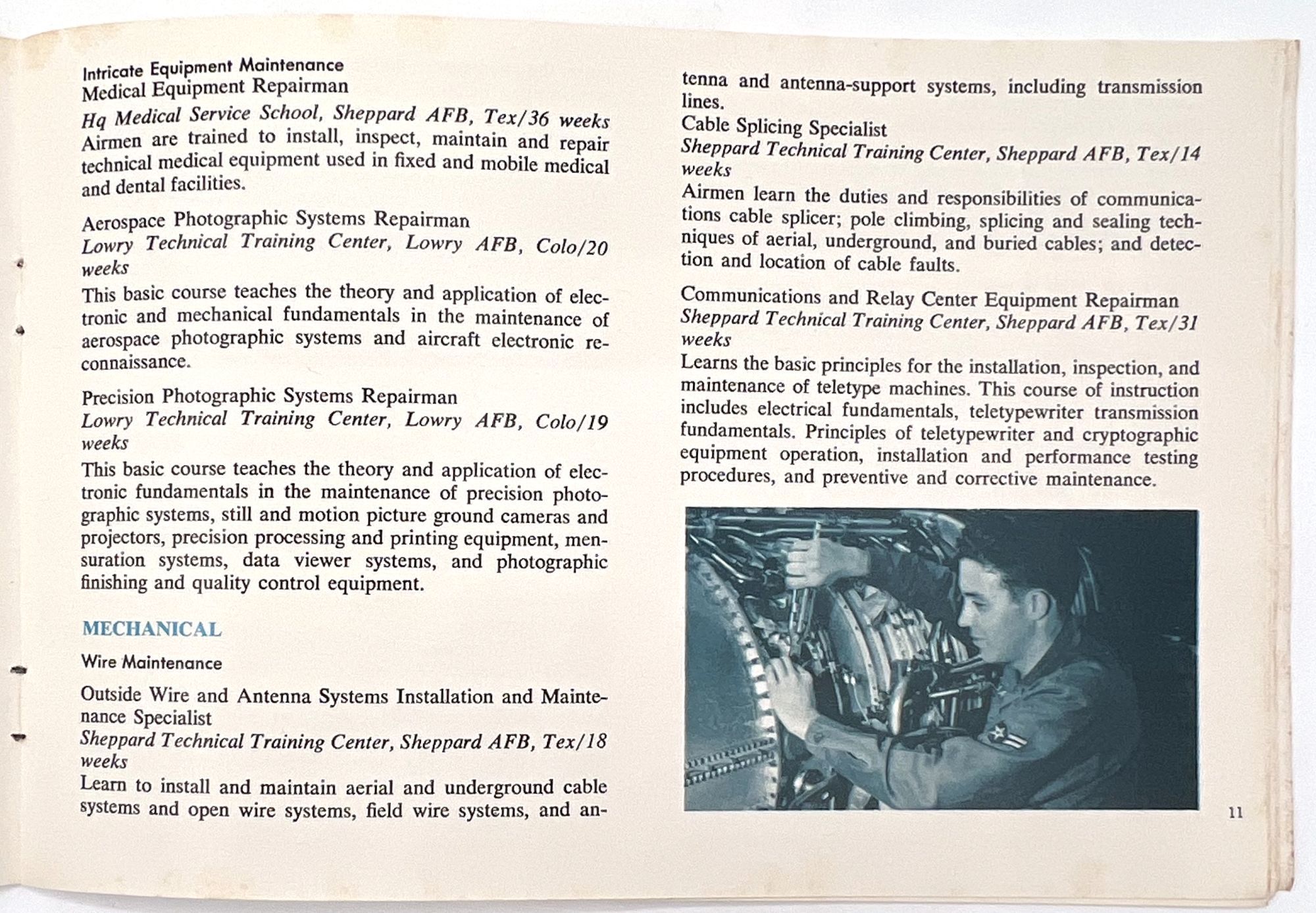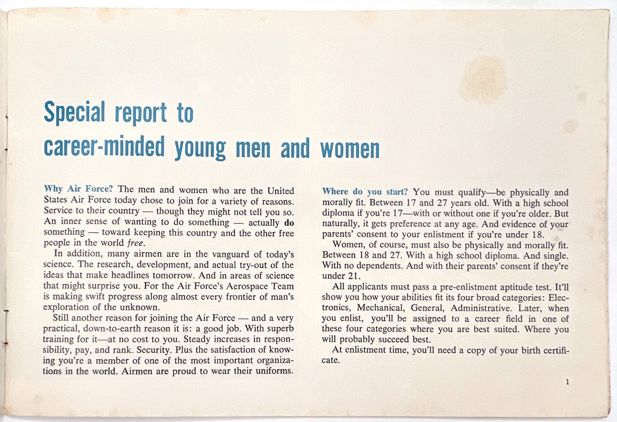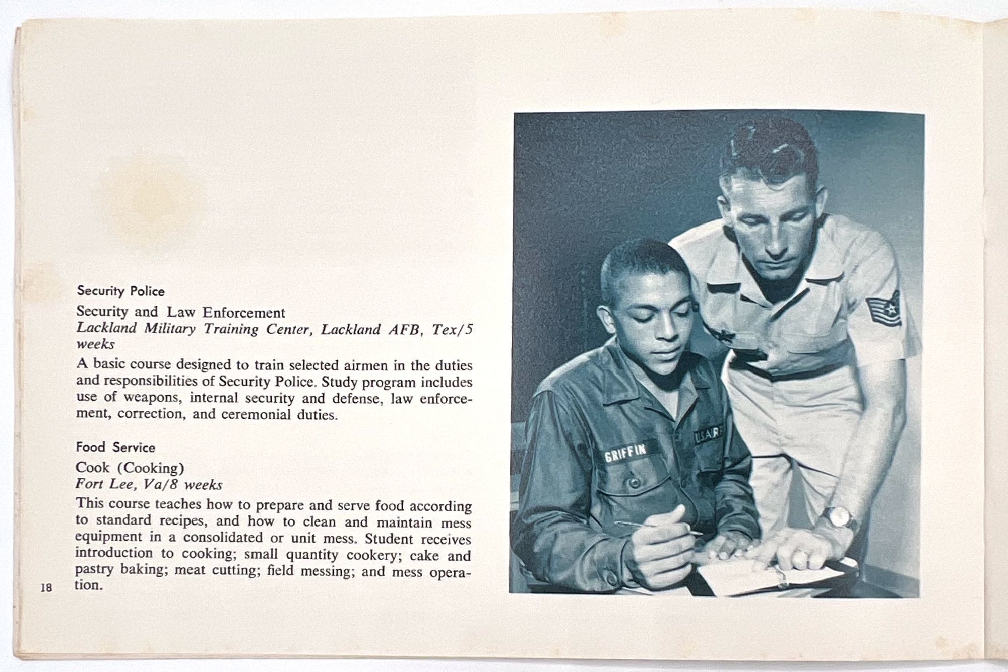 United States: U.S. Air Force, 1972. Very good. Minor dust soiling, extremities worn.. A guide to career opportunities in the Air Force, published for teens and young adults. Featuring an illustration of a plane on a runway on the front, the booklet aims to paint military service as an exciting and fulfilling career path rife with opportunities for advancement. Includes an index of different job titles in the back ranging from Helicopter Mechanic to Marksmanship Instructor, Photographer, Weather Observer and Air Traffic Control Officer. Note that it includes a message to parents in the front of the booklet, easing their fears. Offers information on benefits, what it's like living on base, and offers brief descriptions of the different roles. An interesting view into military recruitment c.1972, at a time when the military found it difficult to recruit young people (Vietnam War). Single vol. (6" by 9"), pp. 28, illus., stapled in original photo- illus. wrps.