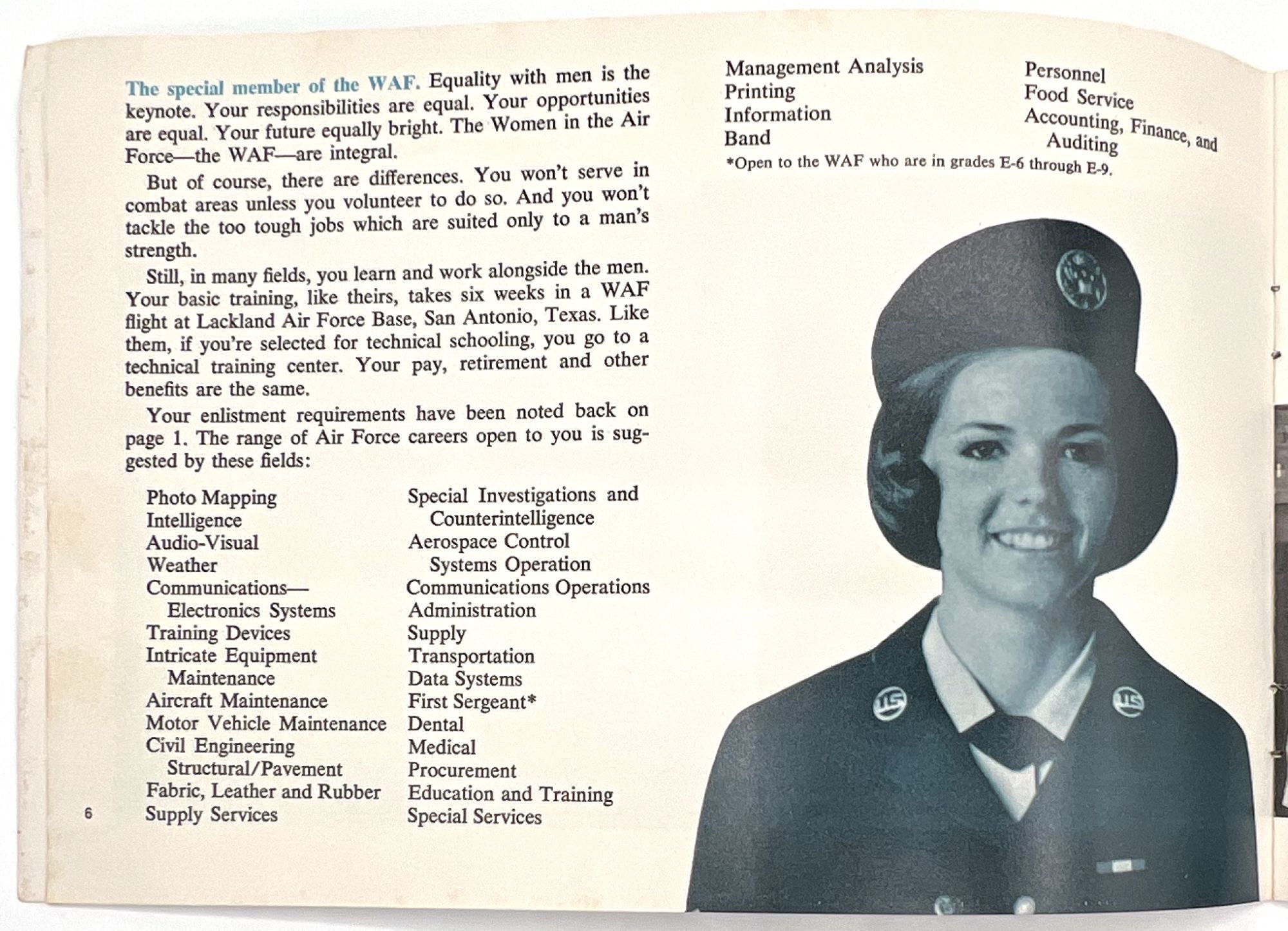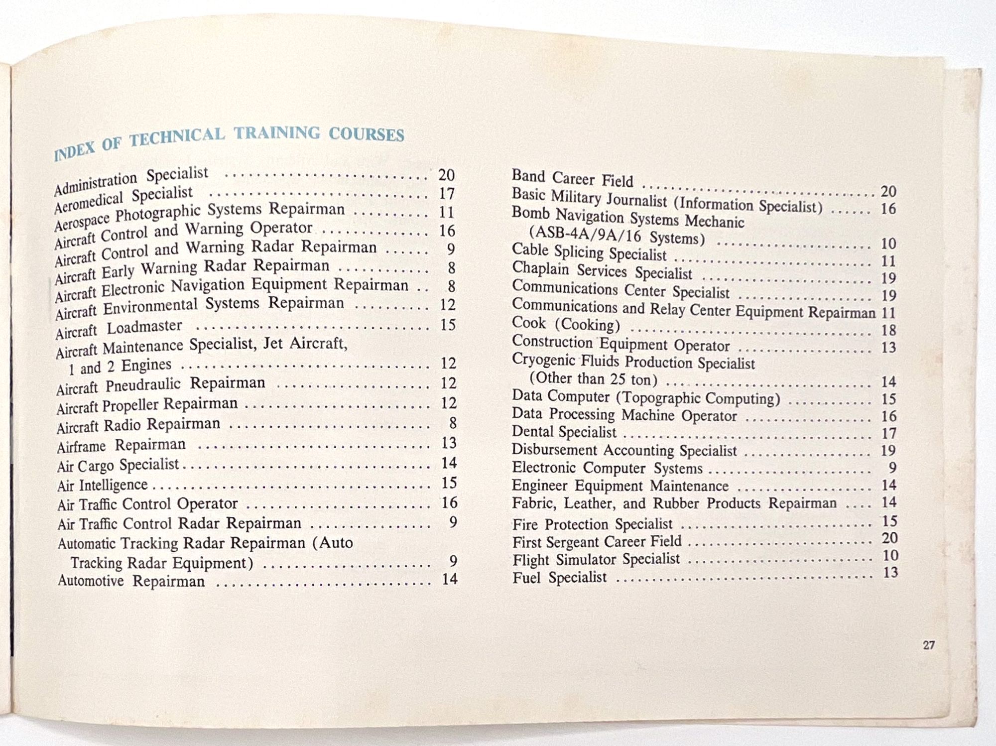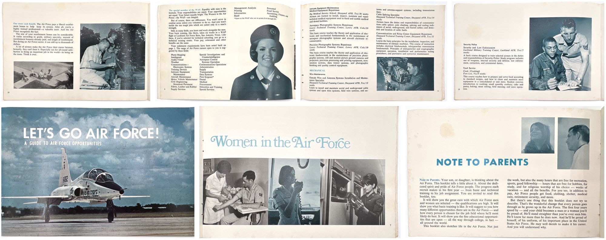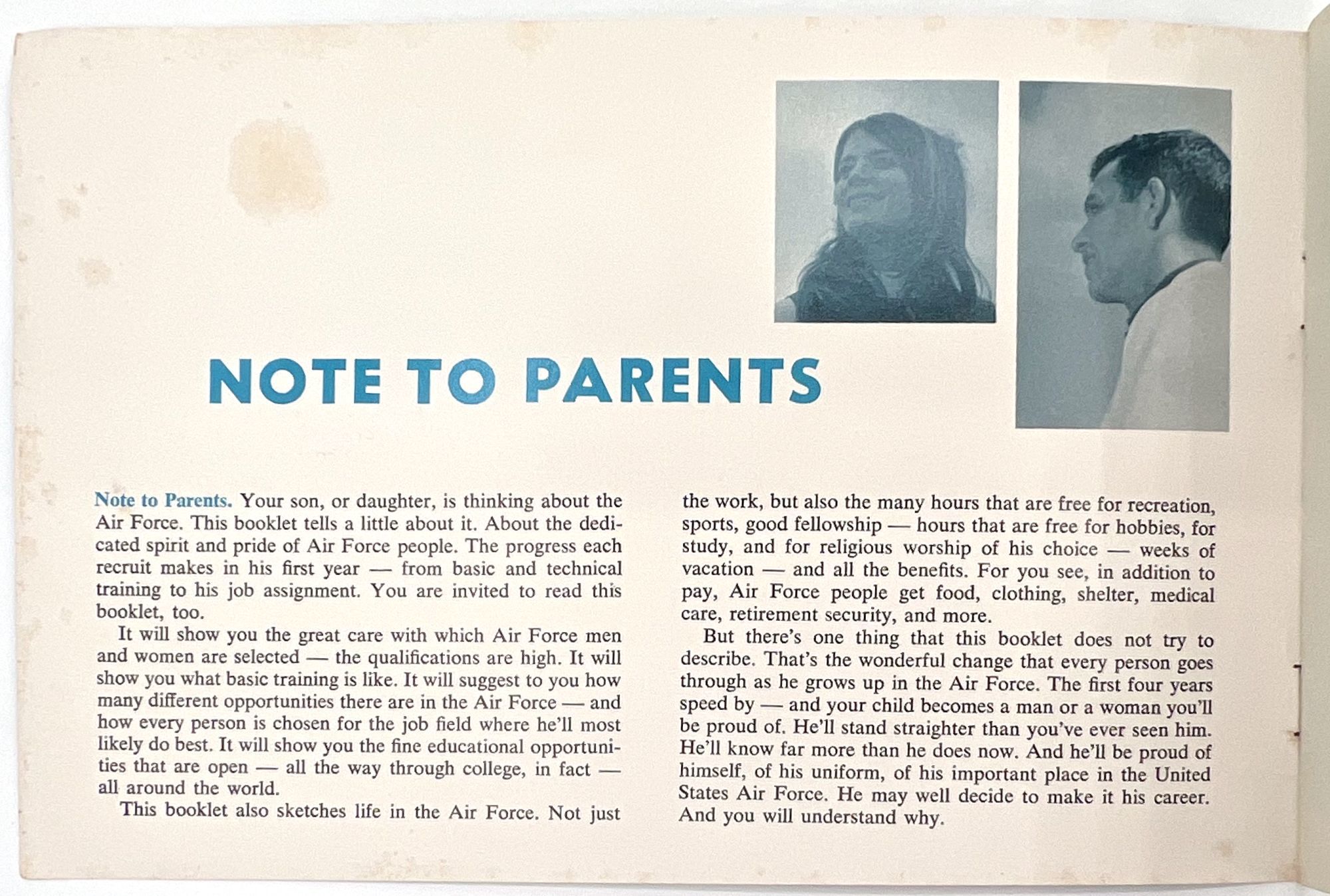 United States: U.S. Air Force, 1972. Very good. Minor dust soiling, extremities worn.. A guide to career opportunities in the Air Force, published for teens and young adults. Featuring an illustration of a plane on a runway on the front, the booklet aims to paint military service as an exciting and fulfilling career path rife with opportunities for advancement. Includes an index of different job titles in the back ranging from Helicopter Mechanic to Marksmanship Instructor, Photographer, Weather Observer and Air Traffic Control Officer. Note that it includes a message to parents in the front of the booklet, easing their fears. Offers information on benefits, what it's like living on base, and offers brief descriptions of the different roles. An interesting view into military recruitment c.1972, at a time when the military found it difficult to recruit young people (Vietnam War). Single vol. (6" by 9"), pp. 28, illus., stapled in original photo- illus. wrps.