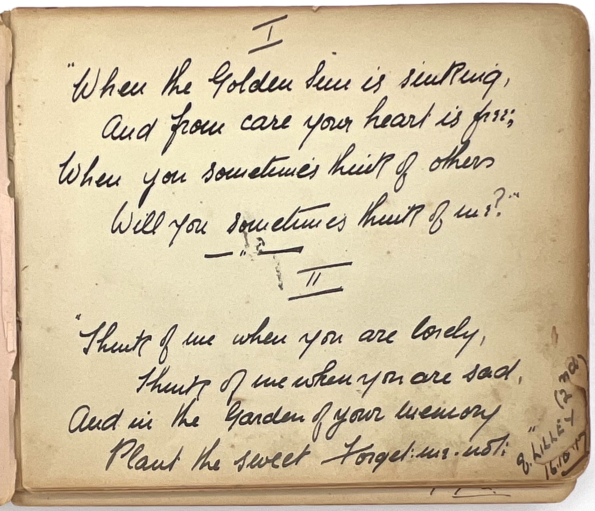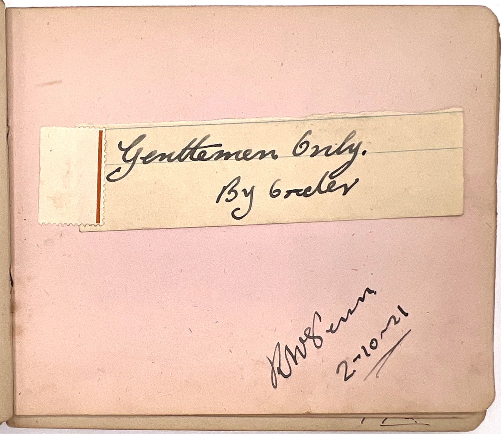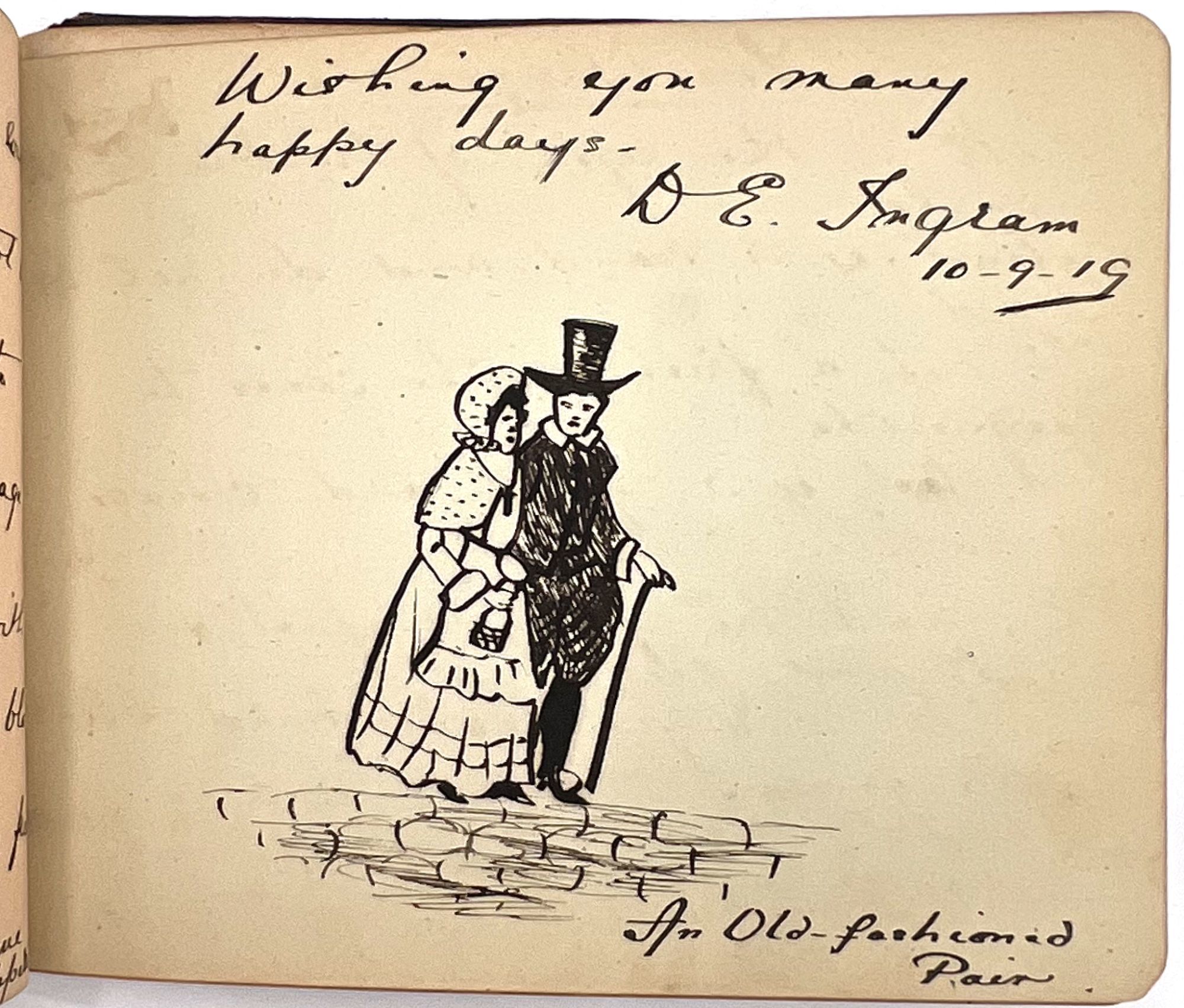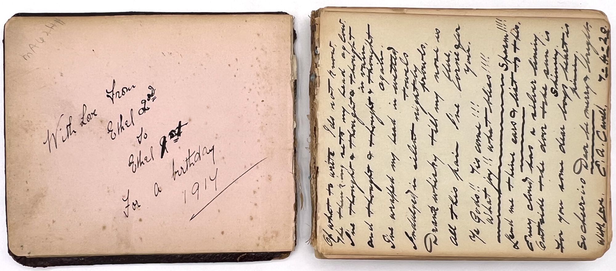 England, 1914. Fair. Spine lacking, worn, boards detached.. A sweet friendship WWI and post-WWI album inscribed "With love from Ethel 2nd to Ethel 1st For a birthday 1914". Ethel 1st appears to have been a popular and well-liked woman, as the many entries from friends attest, dating well into the 1930s. Includes inside jokes, humorous verses, and several pages of original art (pen and ink, watercolor). Includes at least two entries by WWI veterans (Sgt. W. Pascall, St. Luis Y[?]) and a couple of endlessly charming drawings by a child. One of the entries has a red one cent George V stamp. Single vol. (4.25" by 5"), approx. 75 blank pages with ink manuscript and original artwork (pen and ink, watercolor), in original album binding. "Some girls love their brothers, But I so good have grown, that I love other girls' brothers, Far better than my own. With best wishes I. Skinner Aug. 11th 1933