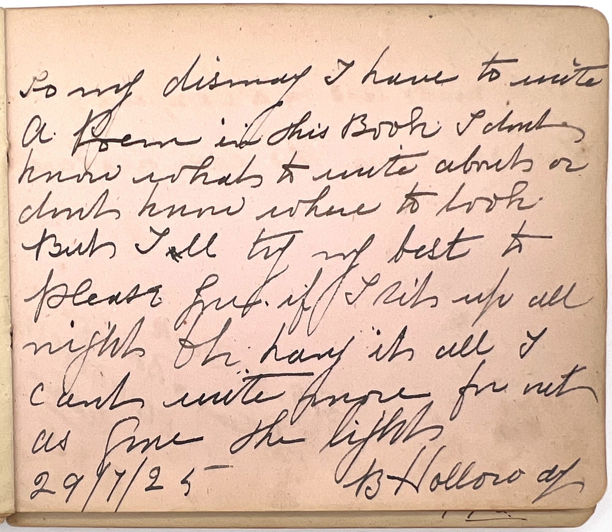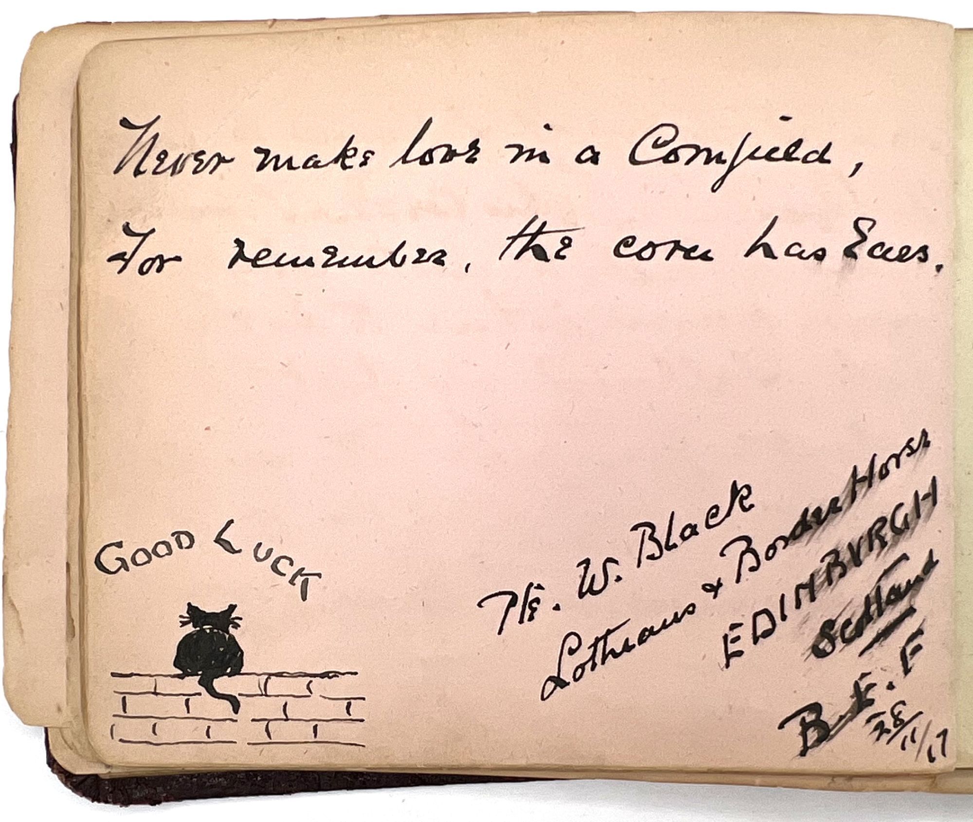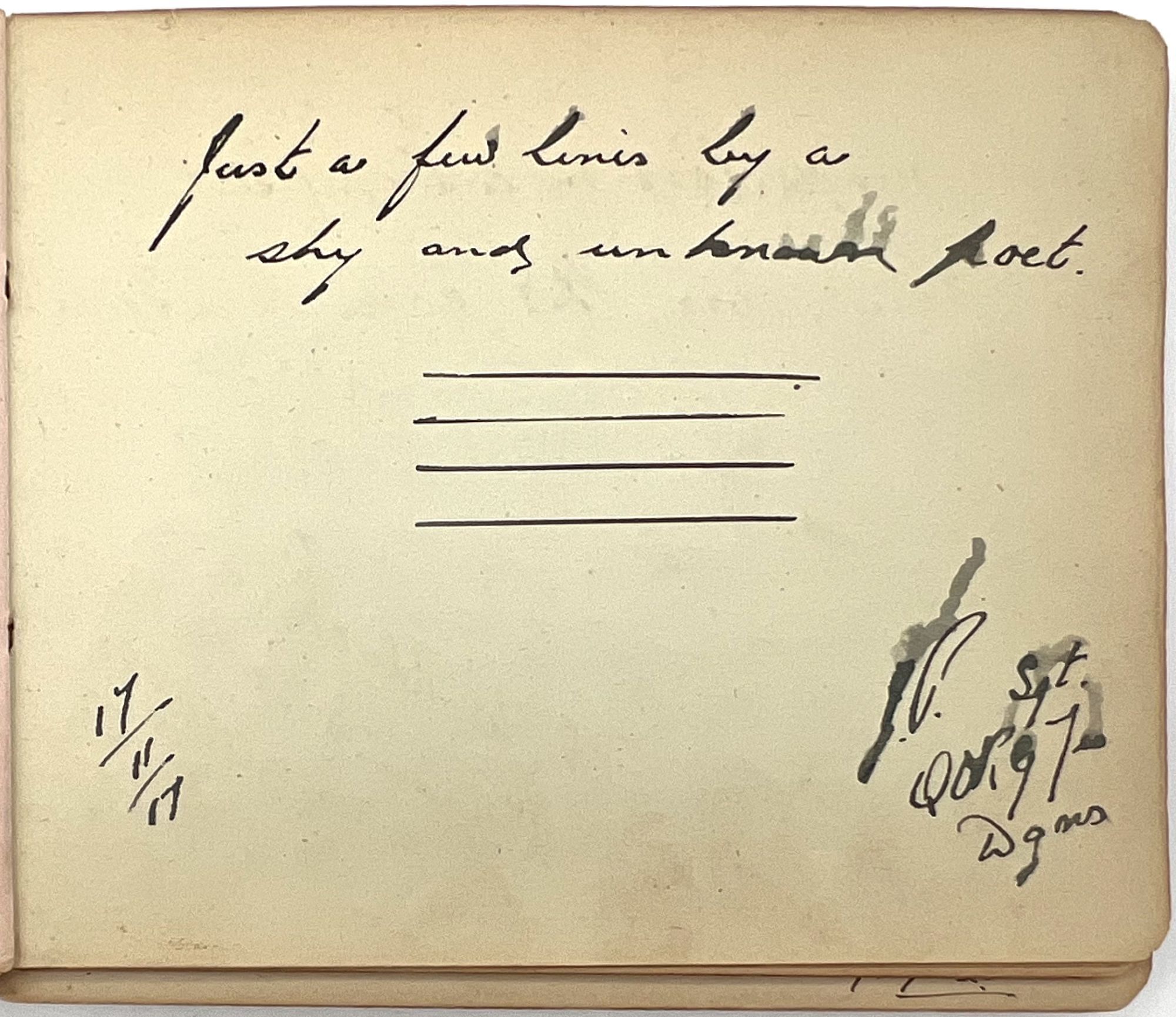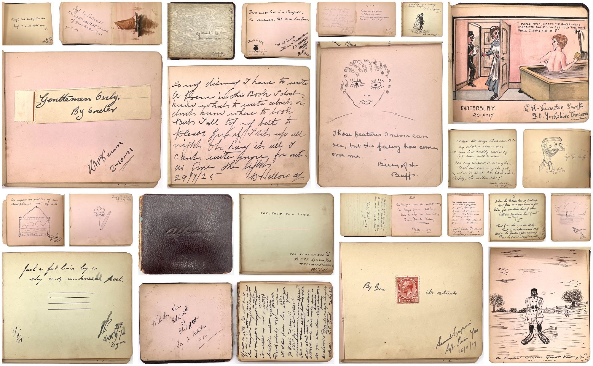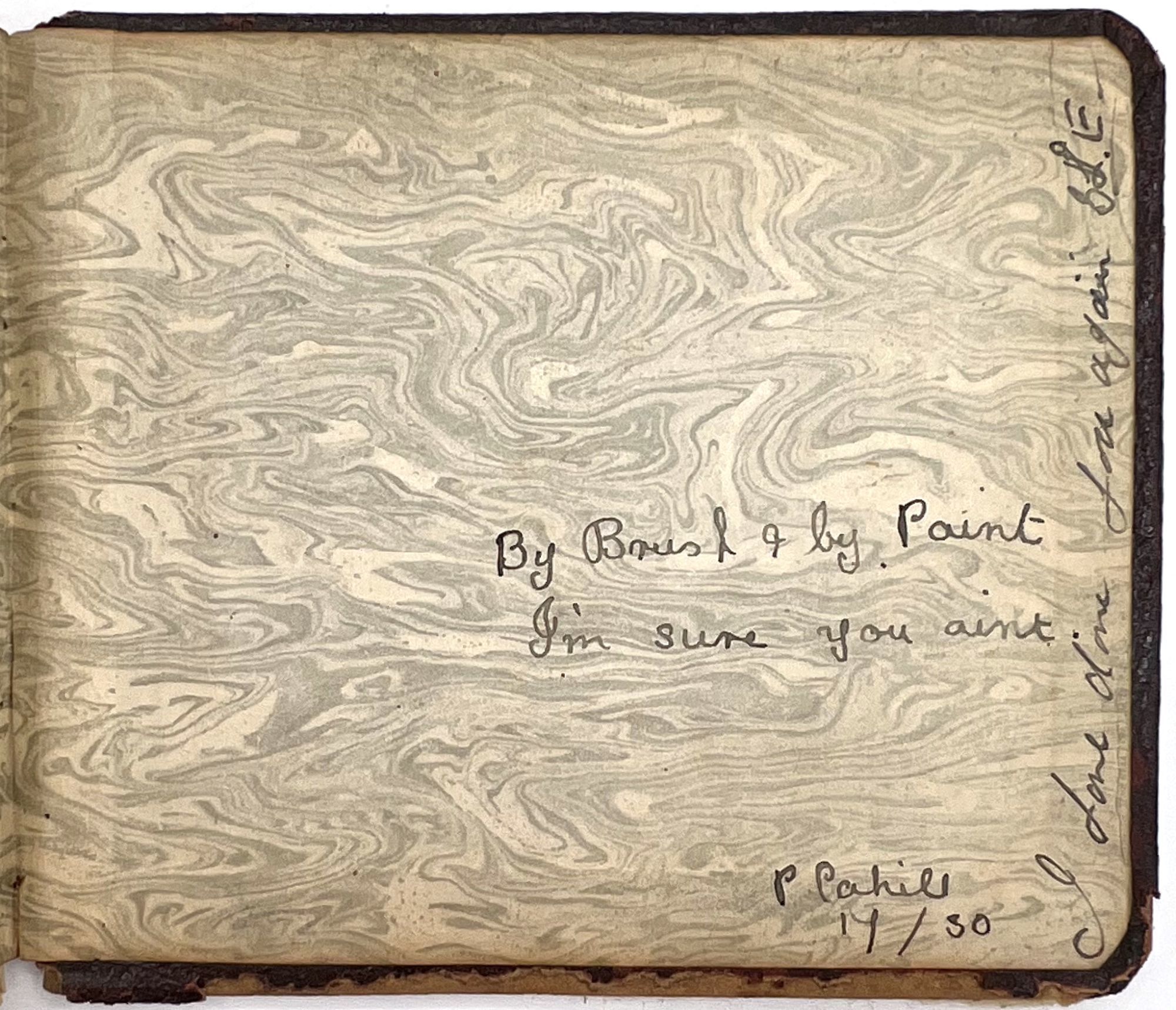 England, 1914. Fair. Spine lacking, worn, boards detached.. A sweet friendship WWI and post-WWI album inscribed "With love from Ethel 2nd to Ethel 1st For a birthday 1914". Ethel 1st appears to have been a popular and well-liked woman, as the many entries from friends attest, dating well into the 1930s. Includes inside jokes, humorous verses, and several pages of original art (pen and ink, watercolor). Includes at least two entries by WWI veterans (Sgt. W. Pascall, St. Luis Y[?]) and a couple of endlessly charming drawings by a child. One of the entries has a red one cent George V stamp. Single vol. (4.25" by 5"), approx. 75 blank pages with ink manuscript and original artwork (pen and ink, watercolor), in original album binding. "Some girls love their brothers, But I so good have grown, that I love other girls' brothers, Far better than my own. With best wishes I. Skinner Aug. 11th 1933