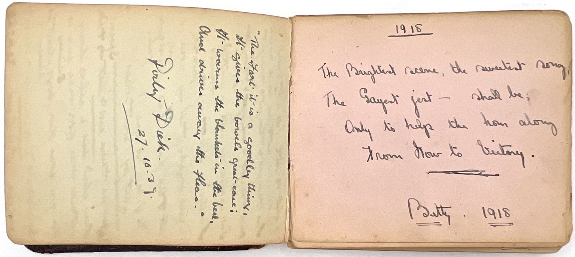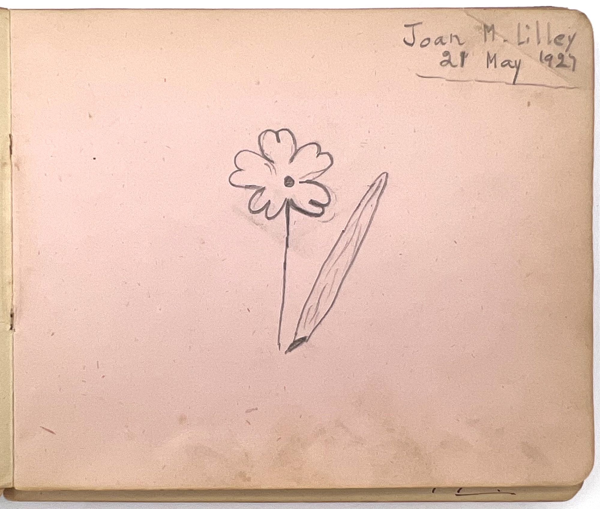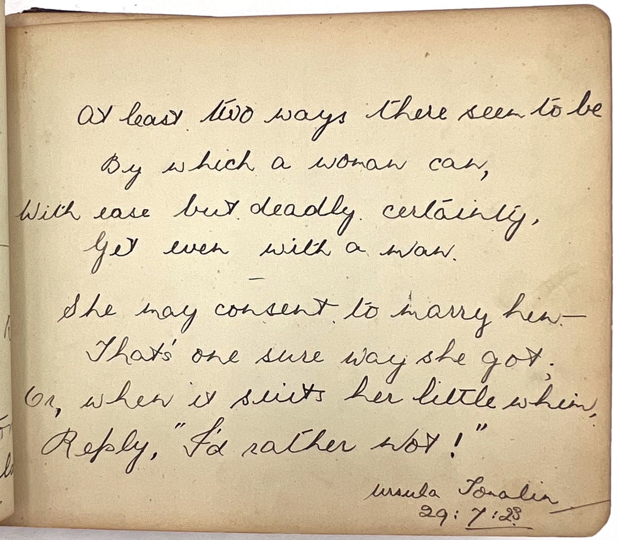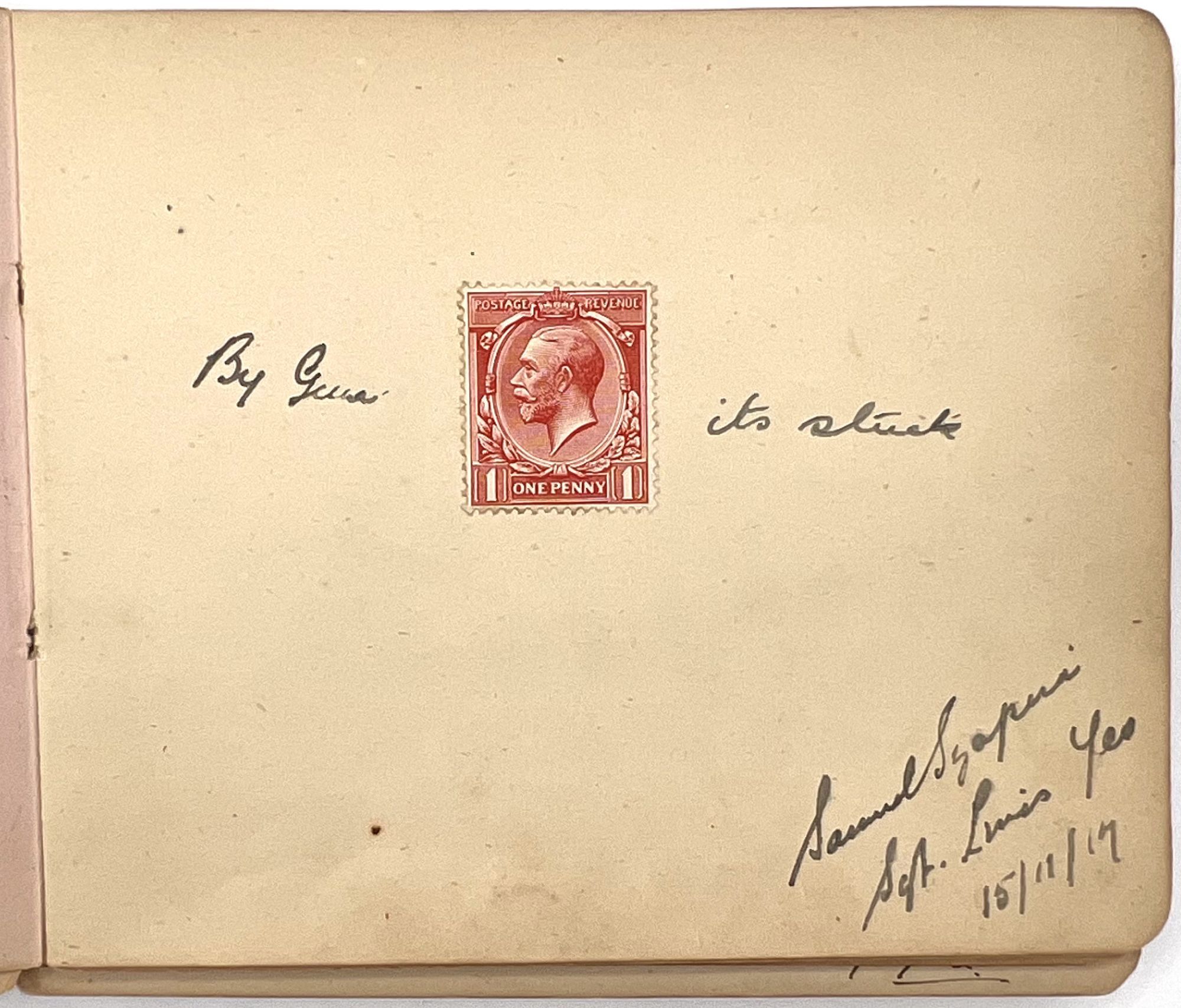 England, 1914. Fair. Spine lacking, worn, boards detached.. A sweet friendship WWI and post-WWI album inscribed "With love from Ethel 2nd to Ethel 1st For a birthday 1914". Ethel 1st appears to have been a popular and well-liked woman, as the many entries from friends attest, dating well into the 1930s. Includes inside jokes, humorous verses, and several pages of original art (pen and ink, watercolor). Includes at least two entries by WWI veterans (Sgt. W. Pascall, St. Luis Y[?]) and a couple of endlessly charming drawings by a child. One of the entries has a red one cent George V stamp. Single vol. (4.25" by 5"), approx. 75 blank pages with ink manuscript and original artwork (pen and ink, watercolor), in original album binding. "Some girls love their brothers, But I so good have grown, that I love other girls' brothers, Far better than my own. With best wishes I. Skinner Aug. 11th 1933