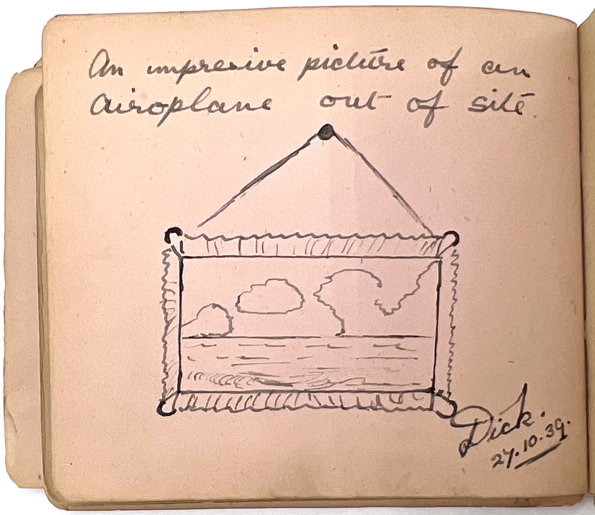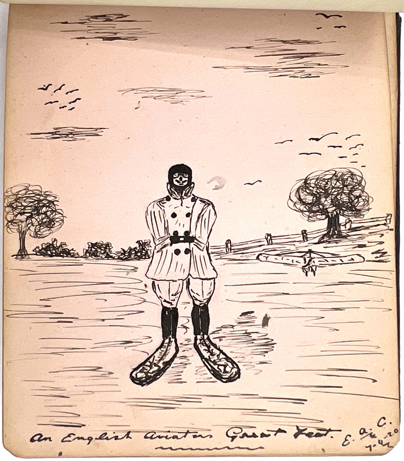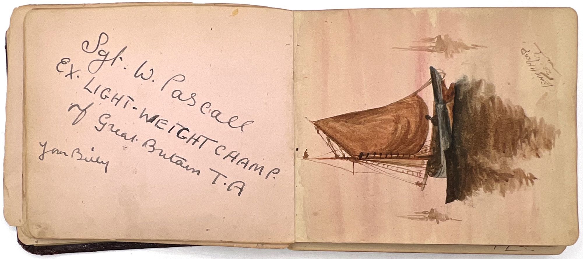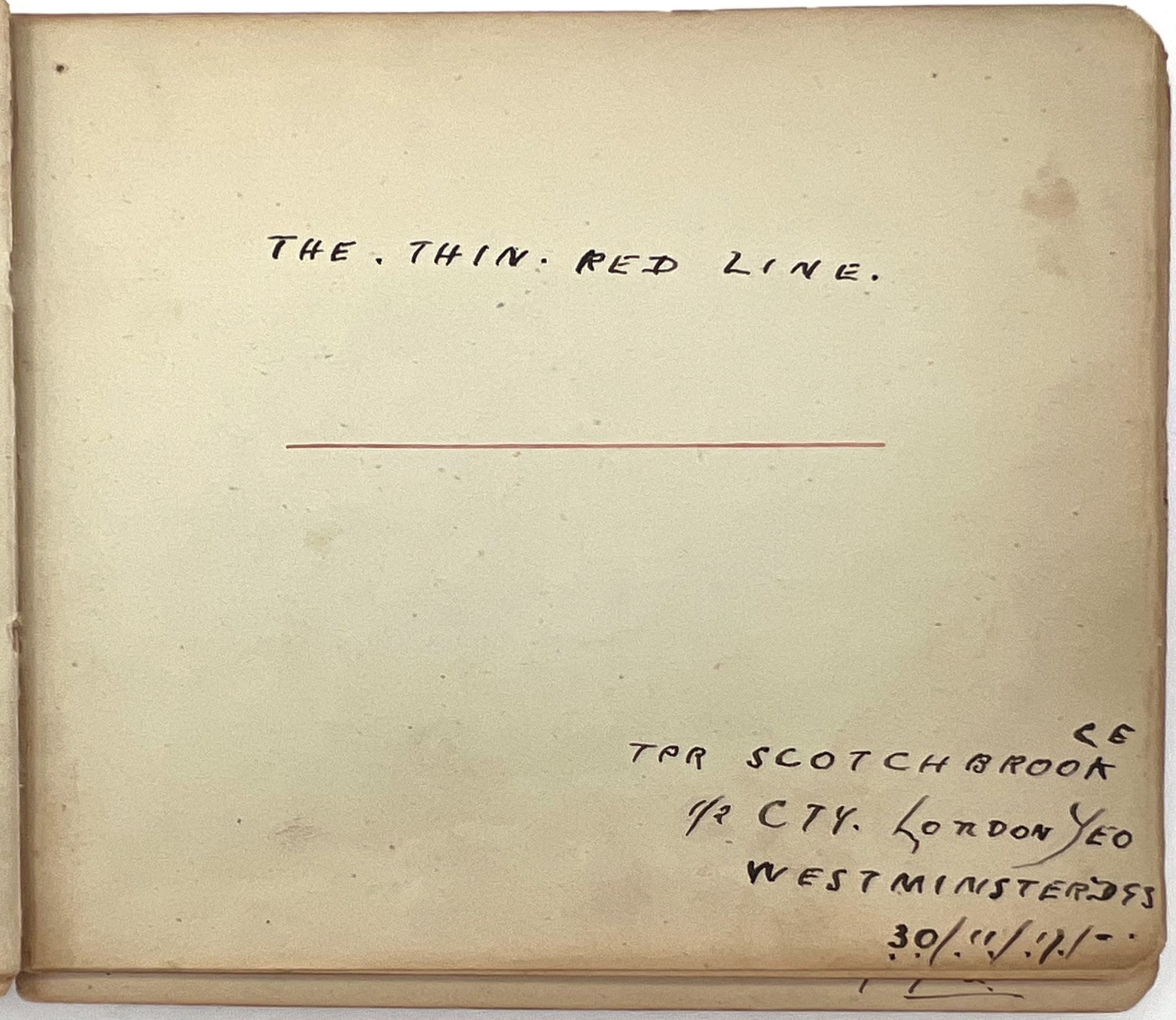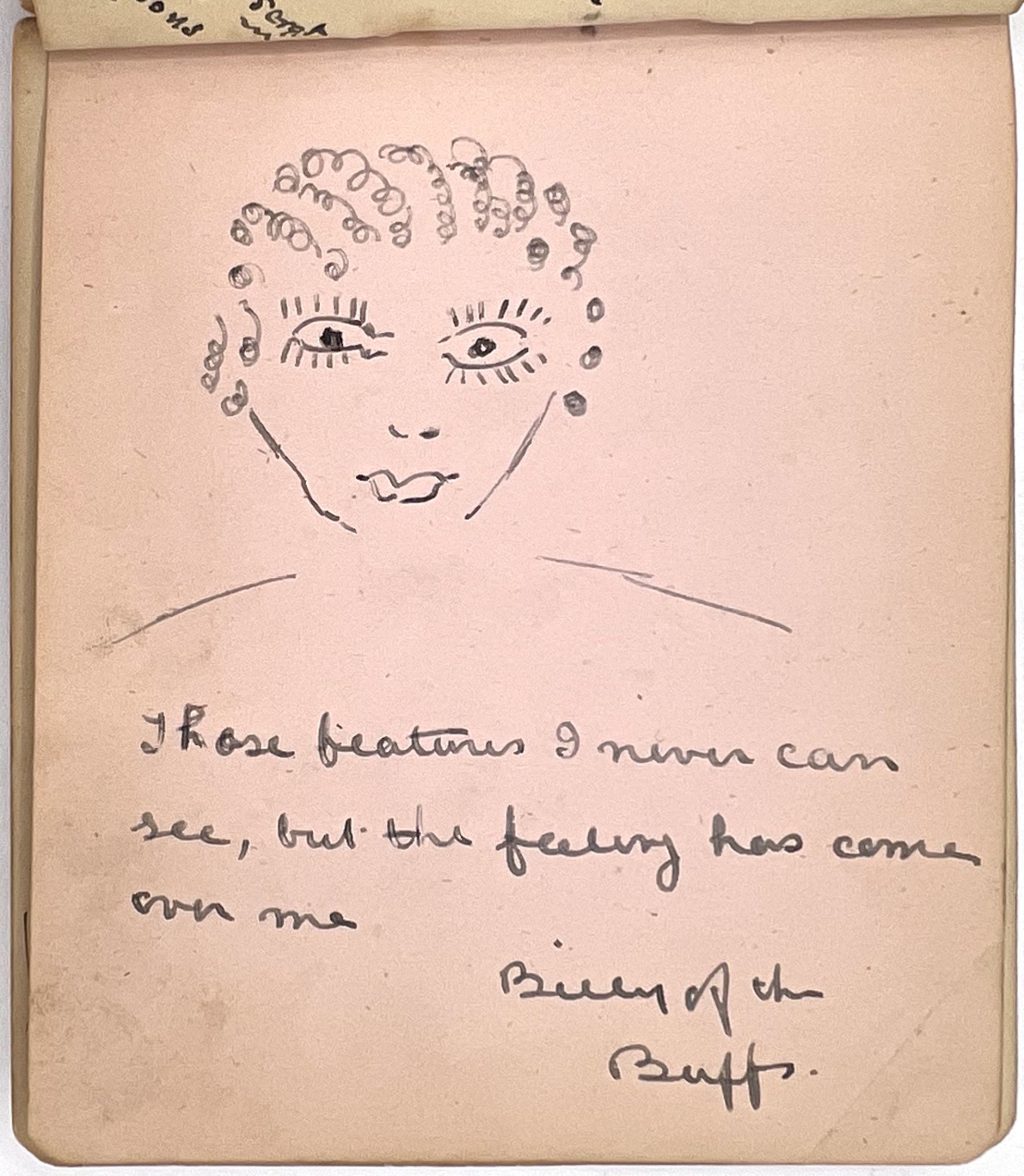 England, 1914. Fair. Spine lacking, worn, boards detached.. A sweet friendship WWI and post-WWI album inscribed "With love from Ethel 2nd to Ethel 1st For a birthday 1914". Ethel 1st appears to have been a popular and well-liked woman, as the many entries from friends attest, dating well into the 1930s. Includes inside jokes, humorous verses, and several pages of original art (pen and ink, watercolor). Includes at least two entries by WWI veterans (Sgt. W. Pascall, St. Luis Y[?]) and a couple of endlessly charming drawings by a child. One of the entries has a red one cent George V stamp. Single vol. (4.25" by 5"), approx. 75 blank pages with ink manuscript and original artwork (pen and ink, watercolor), in original album binding. "Some girls love their brothers, But I so good have grown, that I love other girls' brothers, Far better than my own. With best wishes I. Skinner Aug. 11th 1933