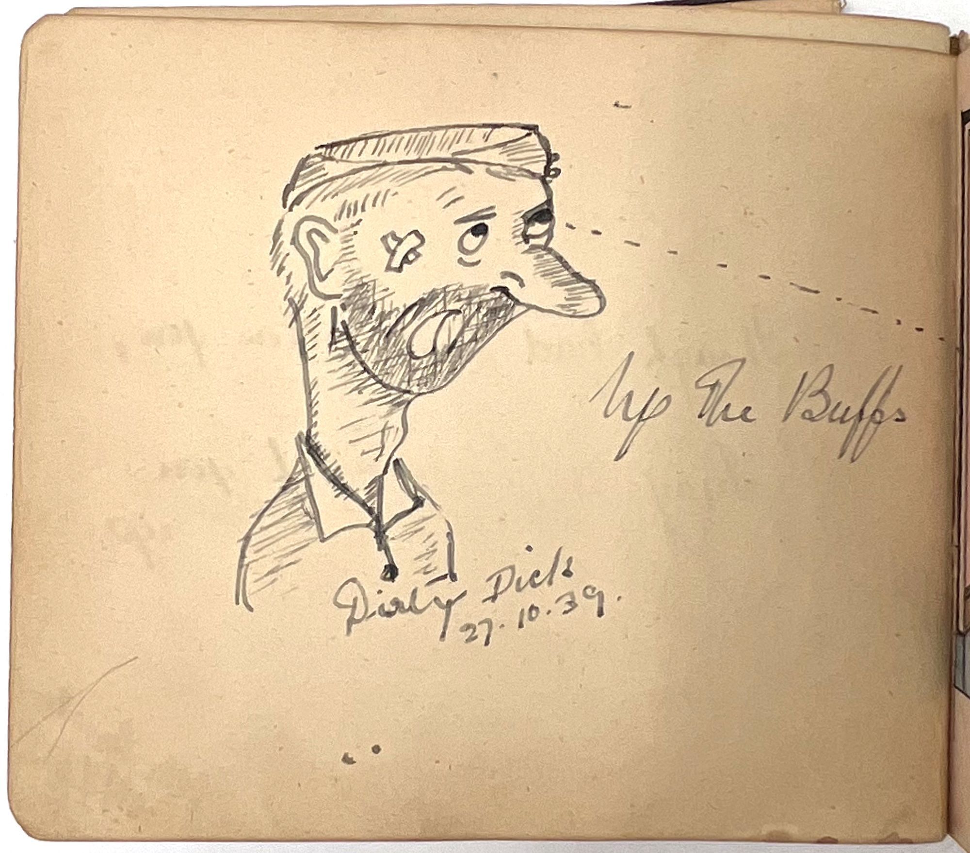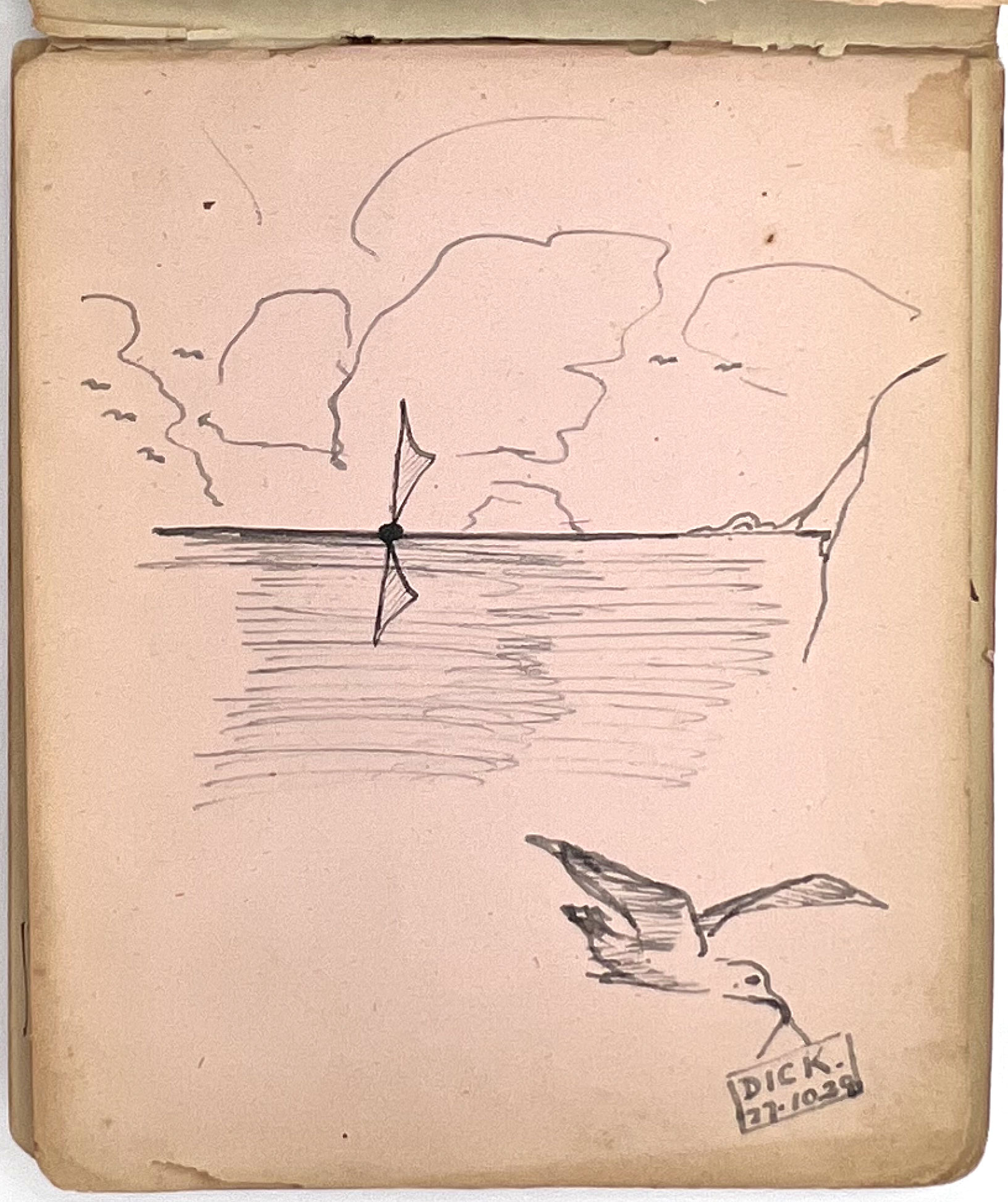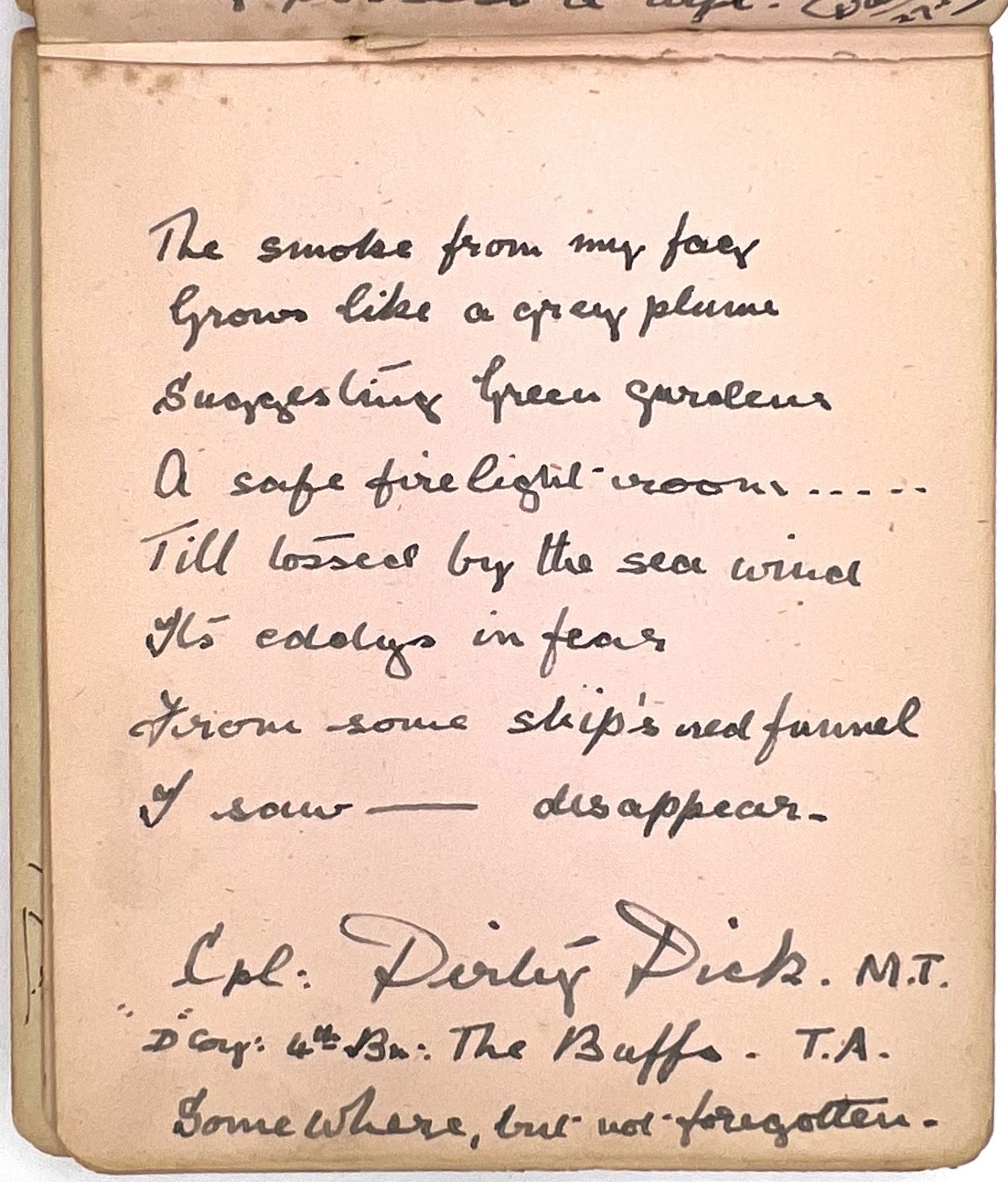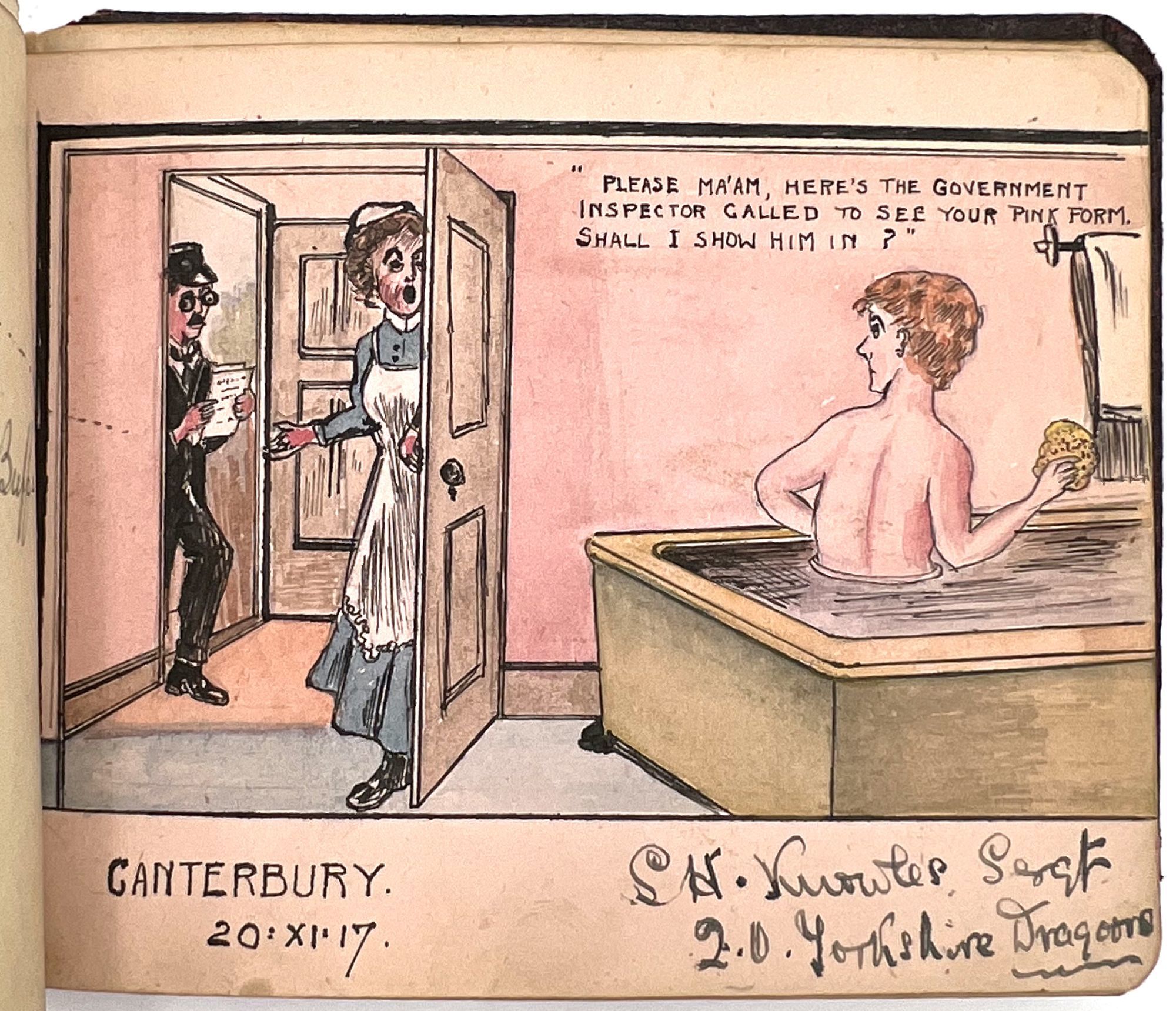 England, 1914. Fair. Spine lacking, worn, boards detached.. A sweet friendship WWI and post-WWI album inscribed "With love from Ethel 2nd to Ethel 1st For a birthday 1914". Ethel 1st appears to have been a popular and well-liked woman, as the many entries from friends attest, dating well into the 1930s. Includes inside jokes, humorous verses, and several pages of original art (pen and ink, watercolor). Includes at least two entries by WWI veterans (Sgt. W. Pascall, St. Luis Y[?]) and a couple of endlessly charming drawings by a child. One of the entries has a red one cent George V stamp. Single vol. (4.25" by 5"), approx. 75 blank pages with ink manuscript and original artwork (pen and ink, watercolor), in original album binding. "Some girls love their brothers, But I so good have grown, that I love other girls' brothers, Far better than my own. With best wishes I. Skinner Aug. 11th 1933