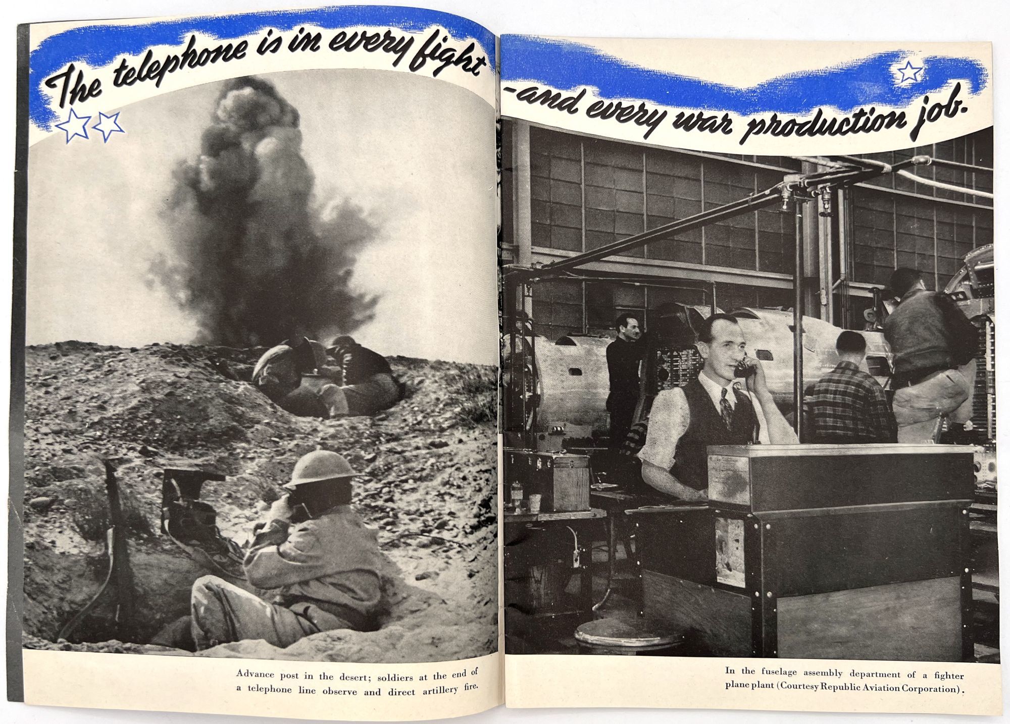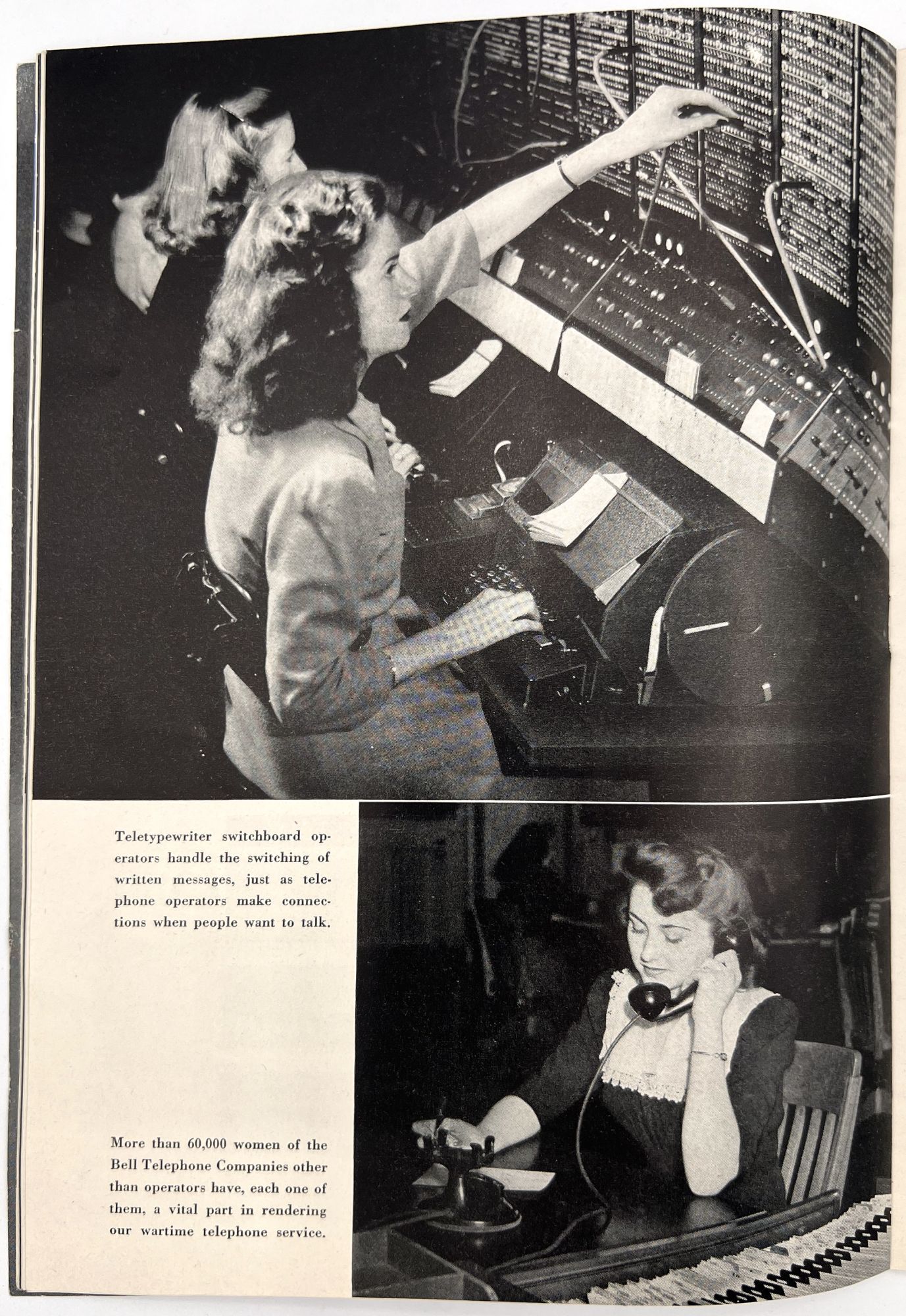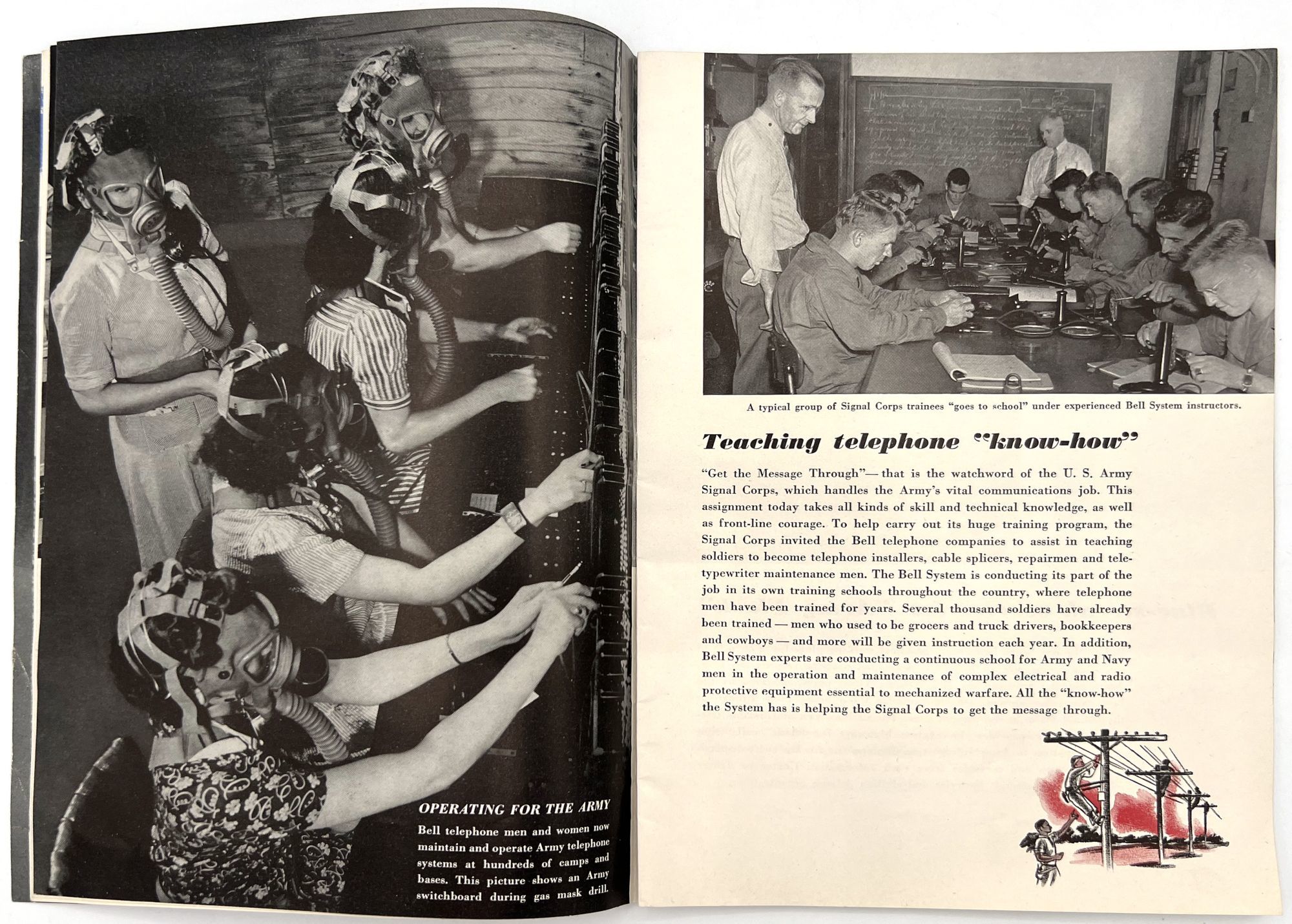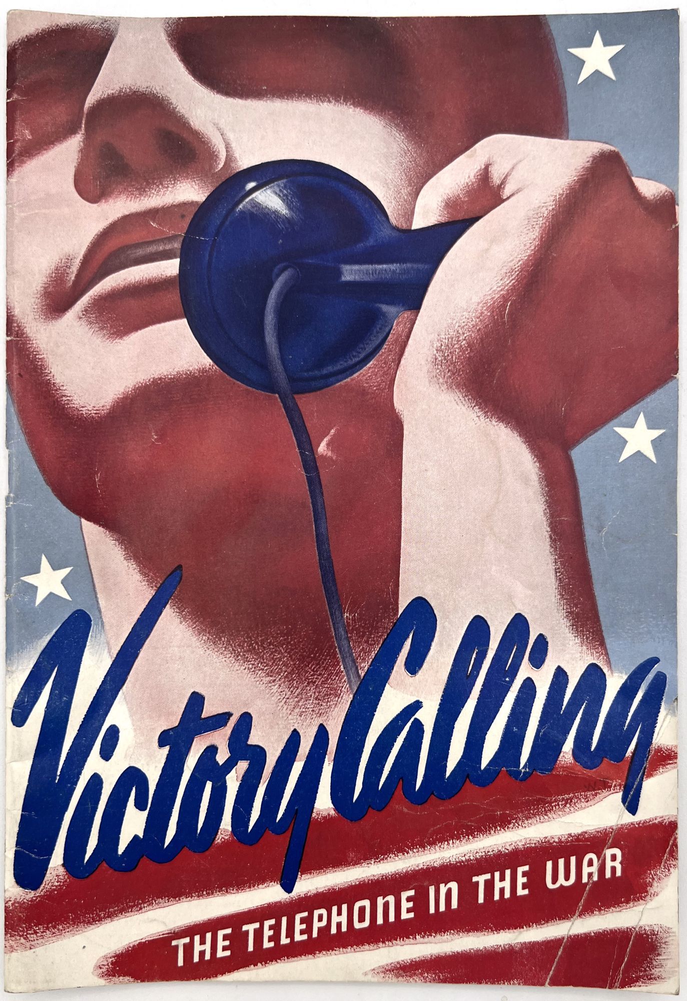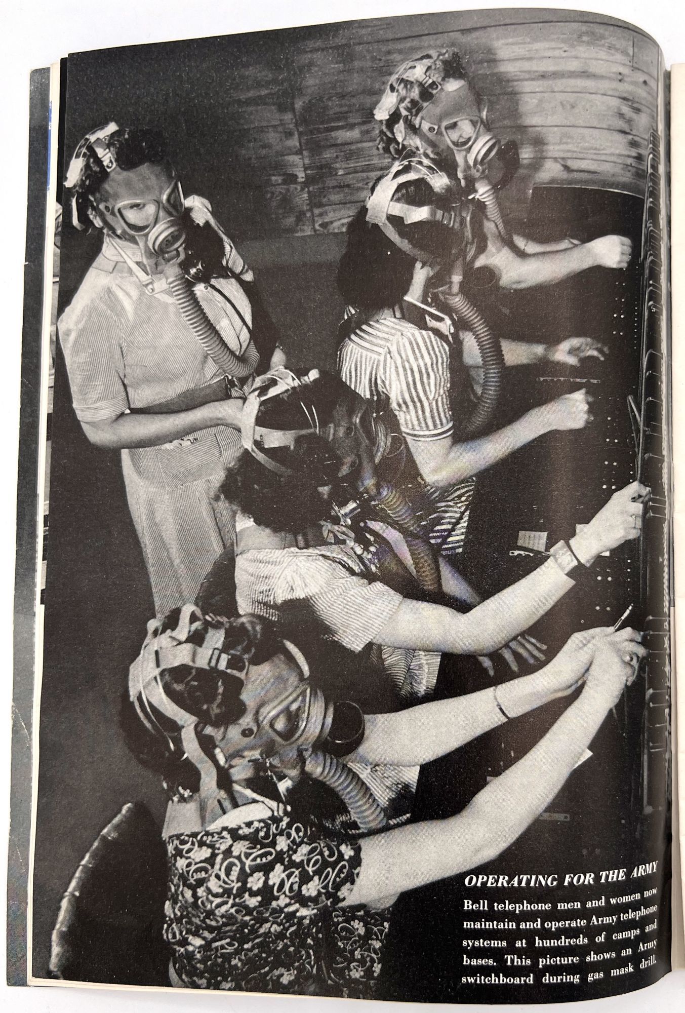 United States: Bell Telephone Company, 1943. Very good. A couple minor creases or short tears, minor dust soiling.. A WWII-era promotional booklet from Bell, highlighting the importance of telephones and communications technology to the war effort. Features patriotic imagery throughout, with photographs of telephonists, a telephone line on the front lines,a group of Signal Corps trainees in class, and the Bell Laboratories, where the technology is developed. Note in particular the image of five female telephonists at the switchboard during a drill, each sporting a gas mask. Single vol. (10" by 7"), pp. [32], illus., stapled in original illus. wrps. "Behind the clatter of rivets, the roar of war engines and the thunderous procession of the bombs is the ring-ring-ring of the telephone bell. War's on the wire. It is Victory calling." (p. [1]).