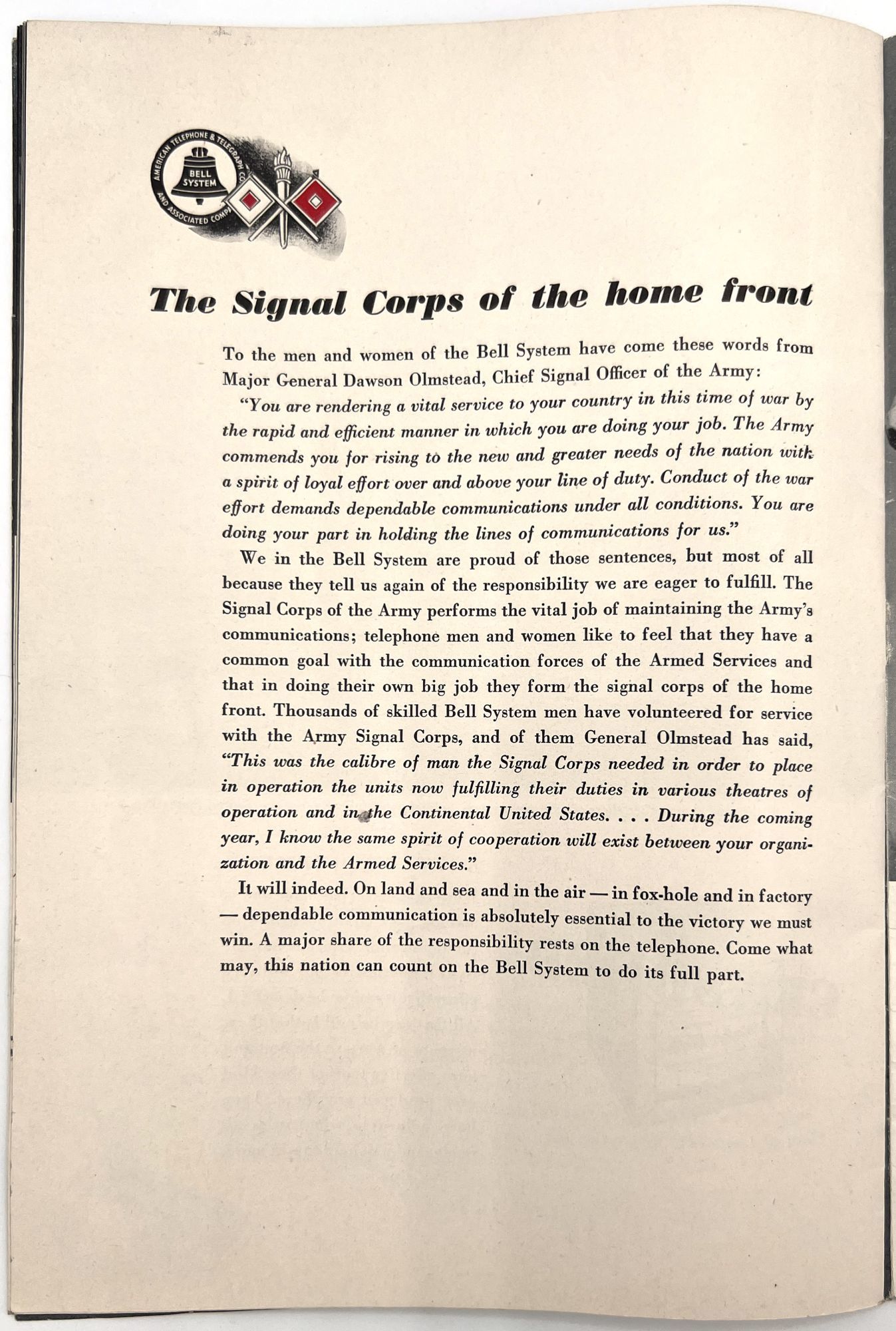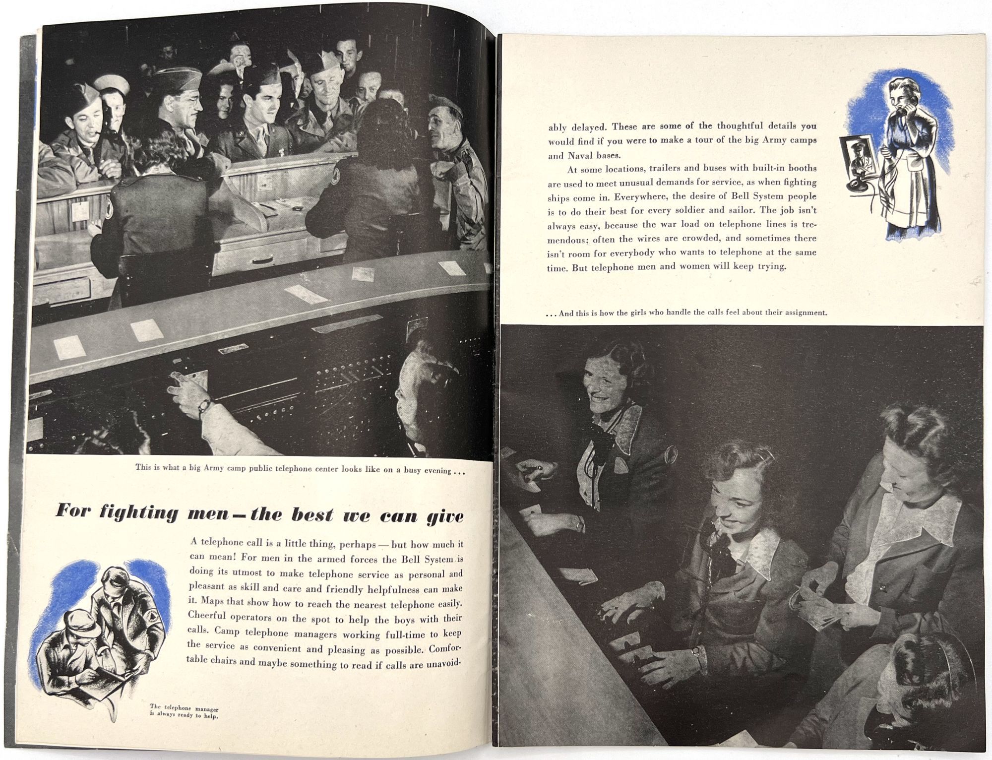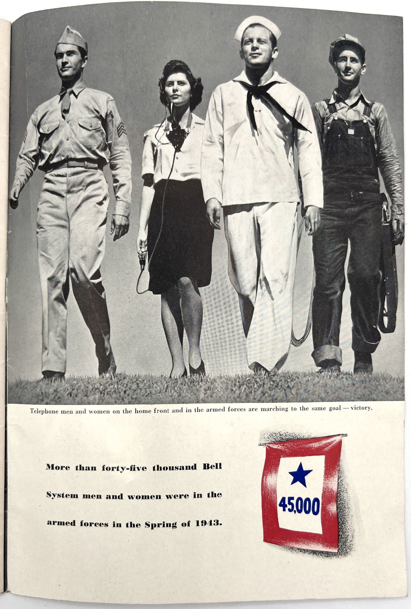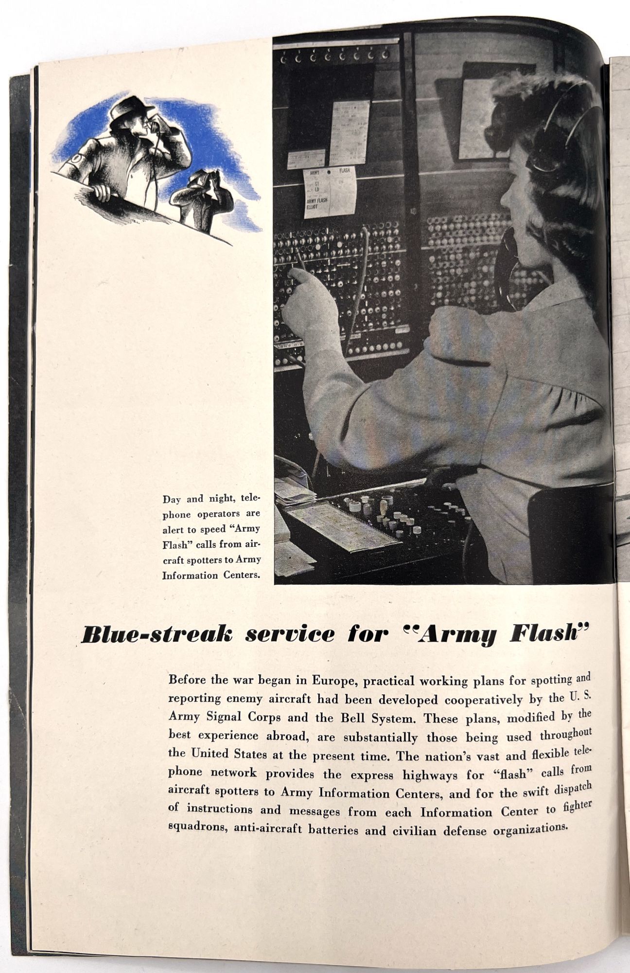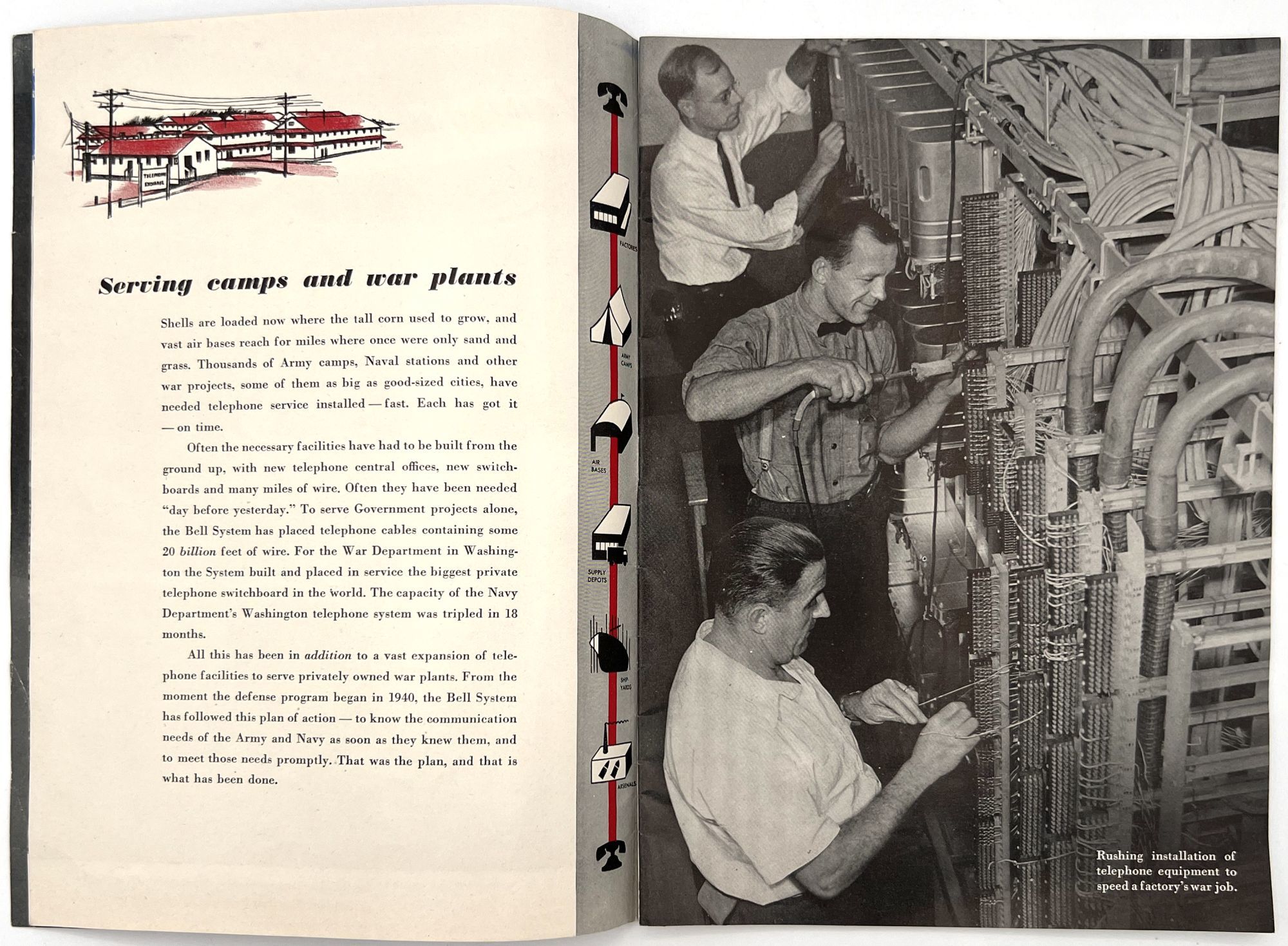 United States: Bell Telephone Company, 1943. Very good. A couple minor creases or short tears, minor dust soiling.. A WWII-era promotional booklet from Bell, highlighting the importance of telephones and communications technology to the war effort. Features patriotic imagery throughout, with photographs of telephonists, a telephone line on the front lines,a group of Signal Corps trainees in class, and the Bell Laboratories, where the technology is developed. Note in particular the image of five female telephonists at the switchboard during a drill, each sporting a gas mask. Single vol. (10" by 7"), pp. [32], illus., stapled in original illus. wrps. "Behind the clatter of rivets, the roar of war engines and the thunderous procession of the bombs is the ring-ring-ring of the telephone bell. War's on the wire. It is Victory calling." (p. [1]).