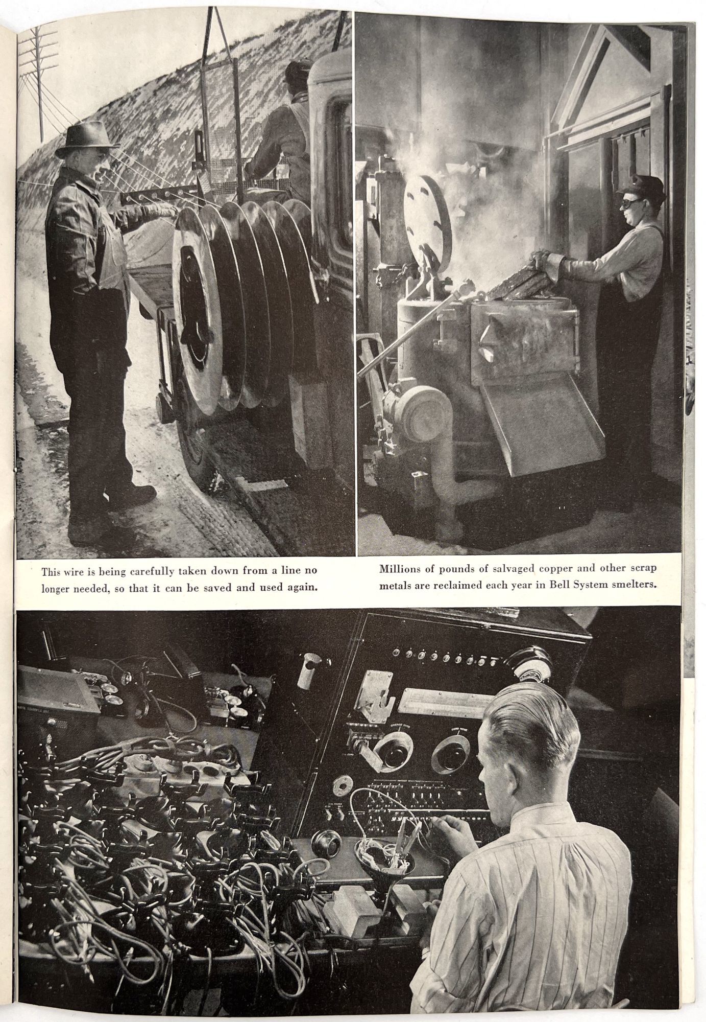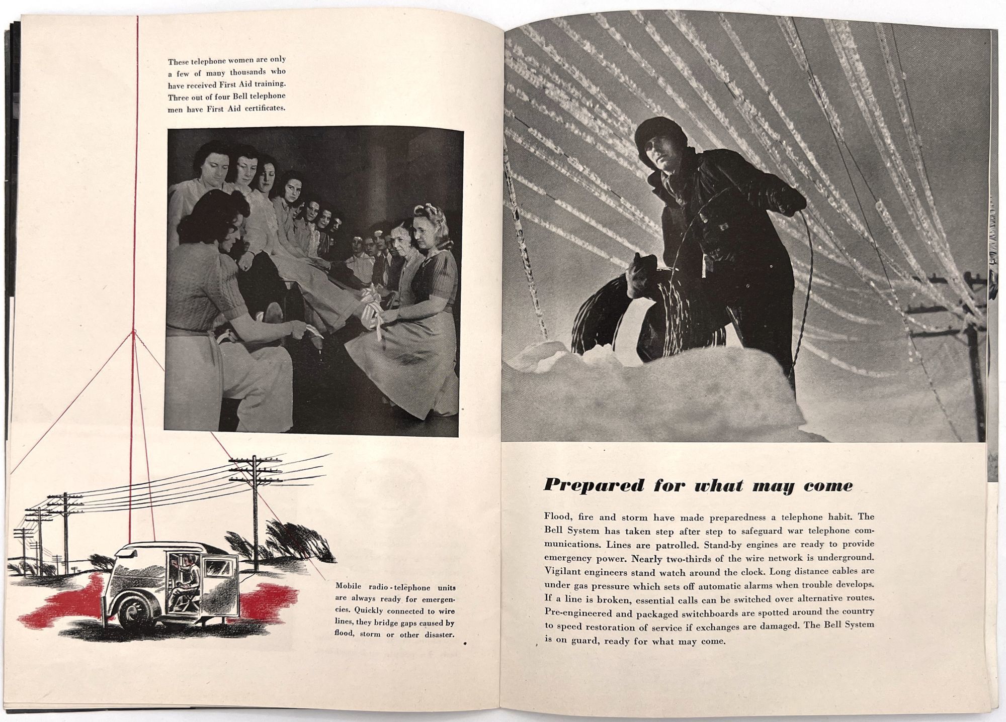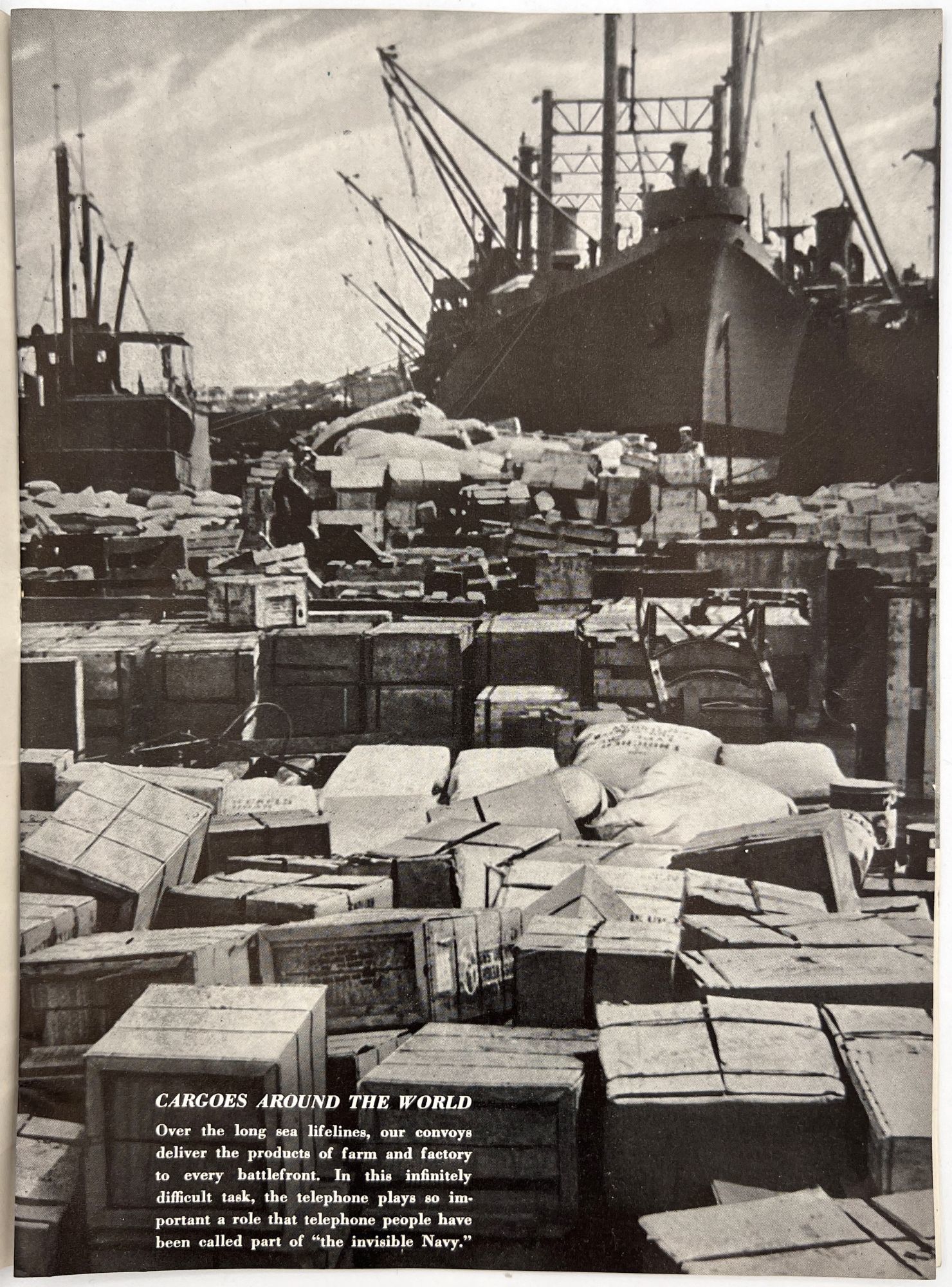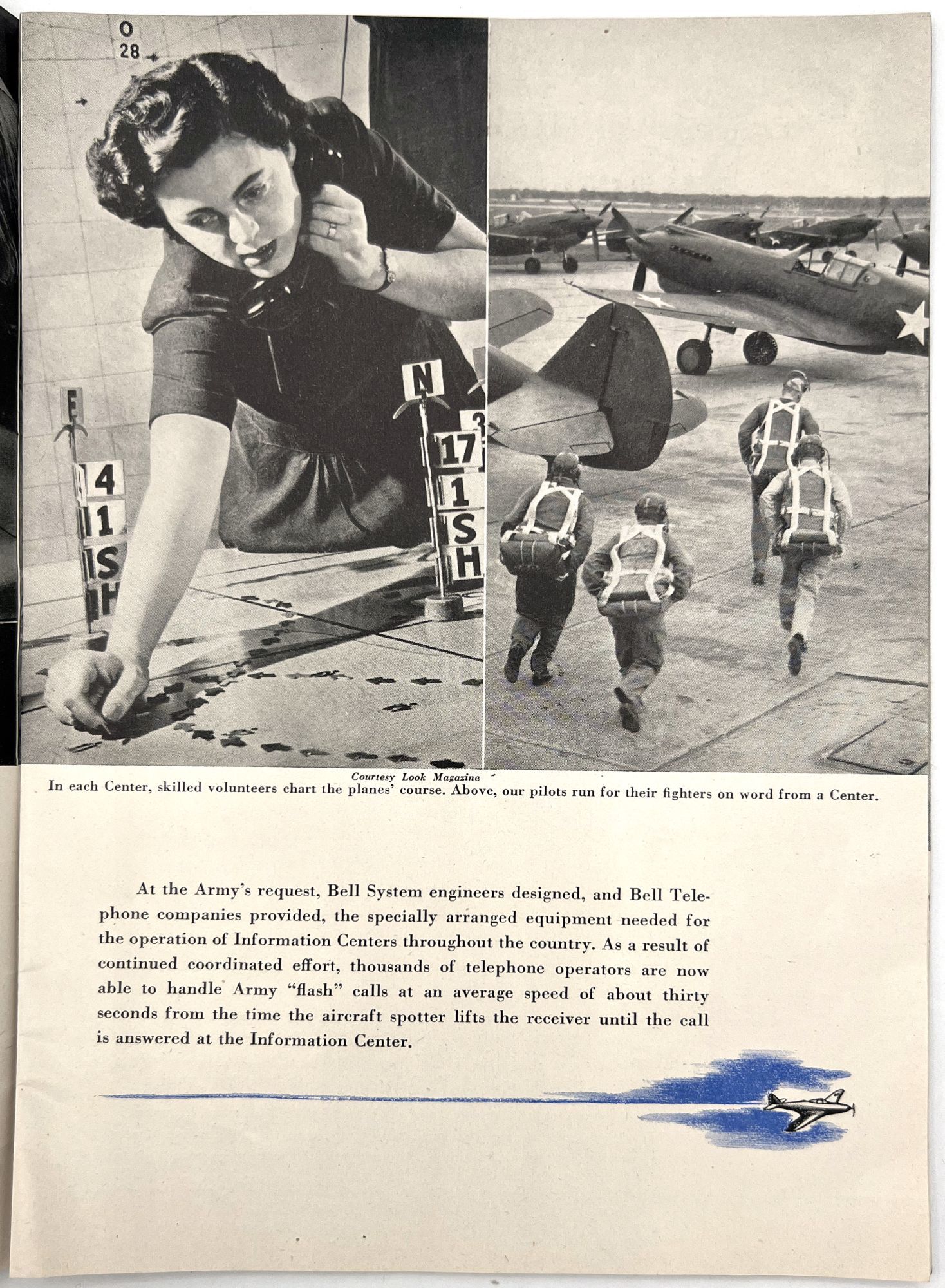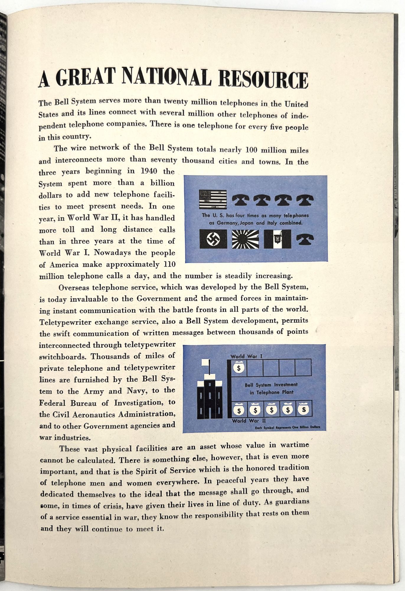 United States: Bell Telephone Company, 1943. Very good. A couple minor creases or short tears, minor dust soiling.. A WWII-era promotional booklet from Bell, highlighting the importance of telephones and communications technology to the war effort. Features patriotic imagery throughout, with photographs of telephonists, a telephone line on the front lines,a group of Signal Corps trainees in class, and the Bell Laboratories, where the technology is developed. Note in particular the image of five female telephonists at the switchboard during a drill, each sporting a gas mask. Single vol. (10" by 7"), pp. [32], illus., stapled in original illus. wrps. "Behind the clatter of rivets, the roar of war engines and the thunderous procession of the bombs is the ring-ring-ring of the telephone bell. War's on the wire. It is Victory calling." (p. [1]).