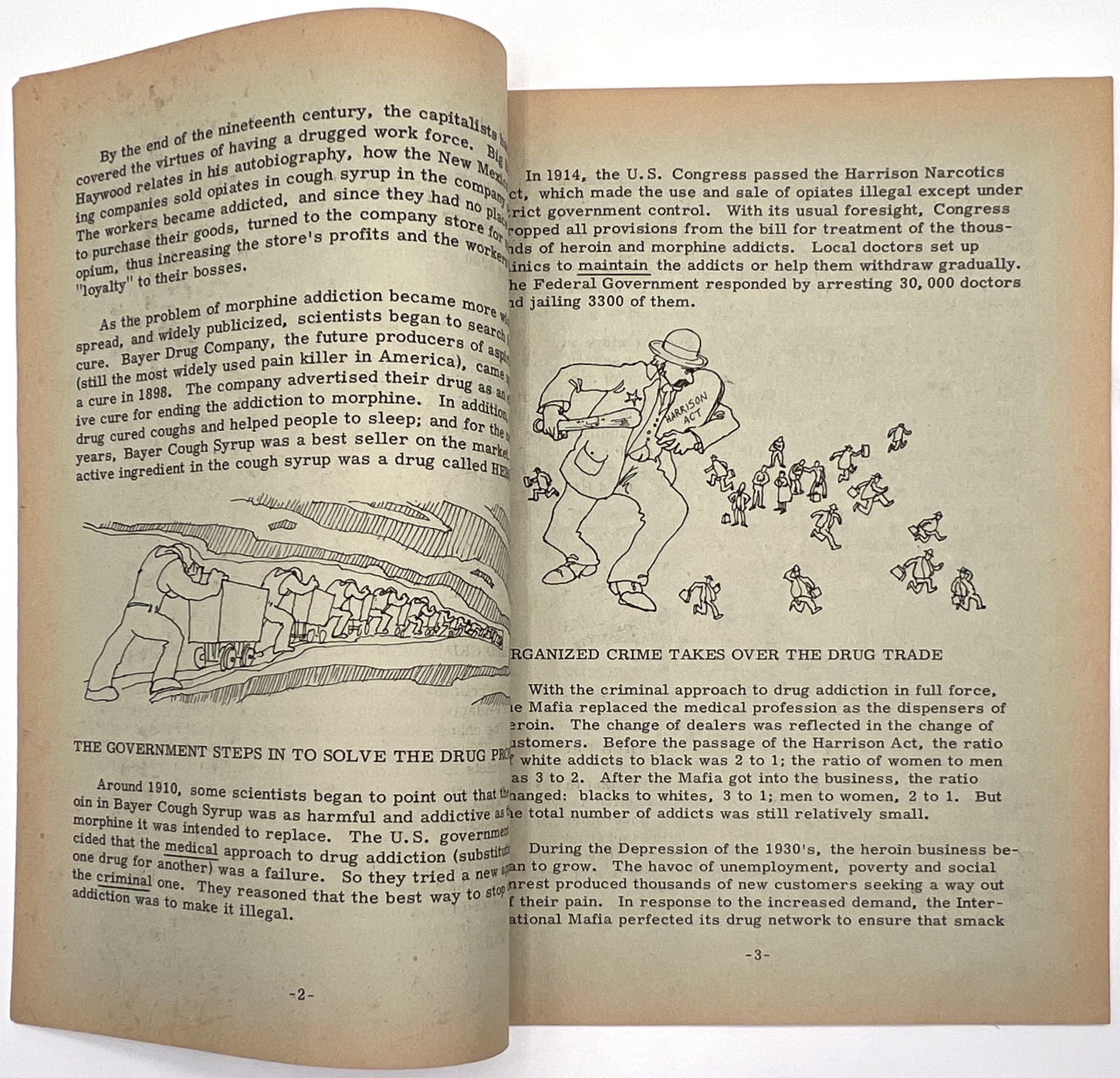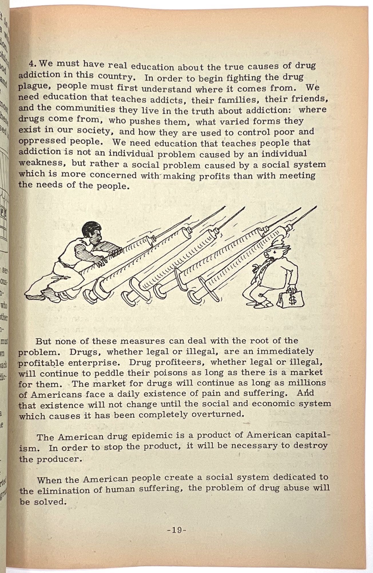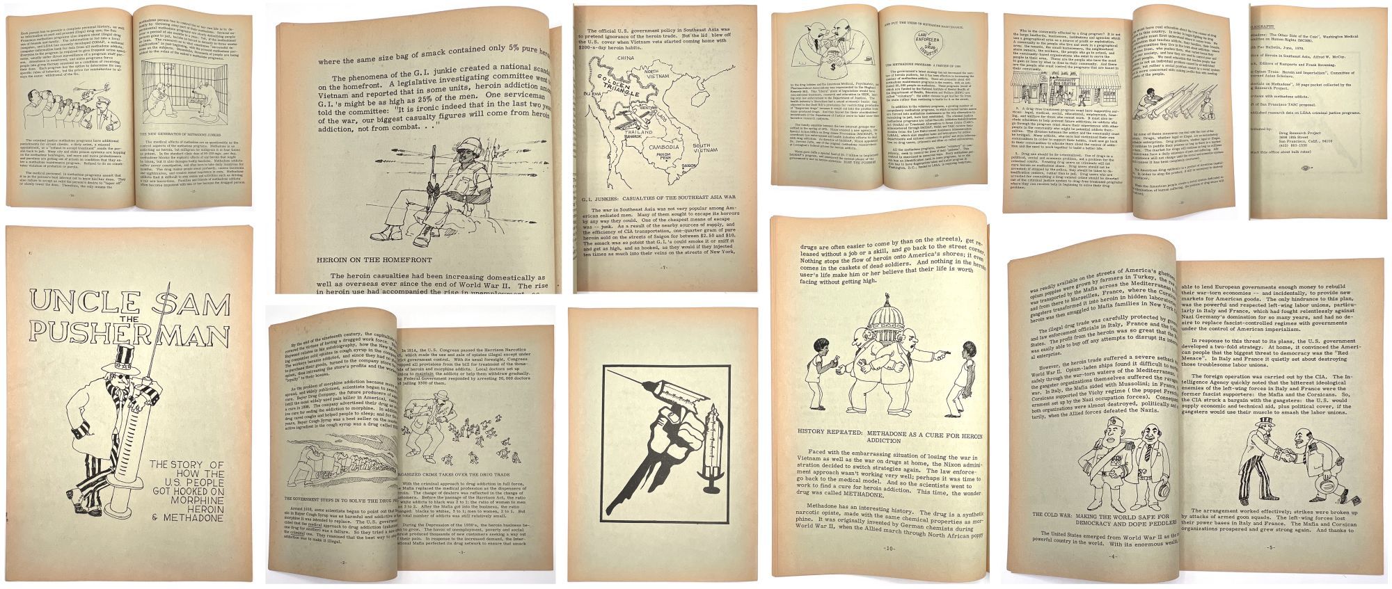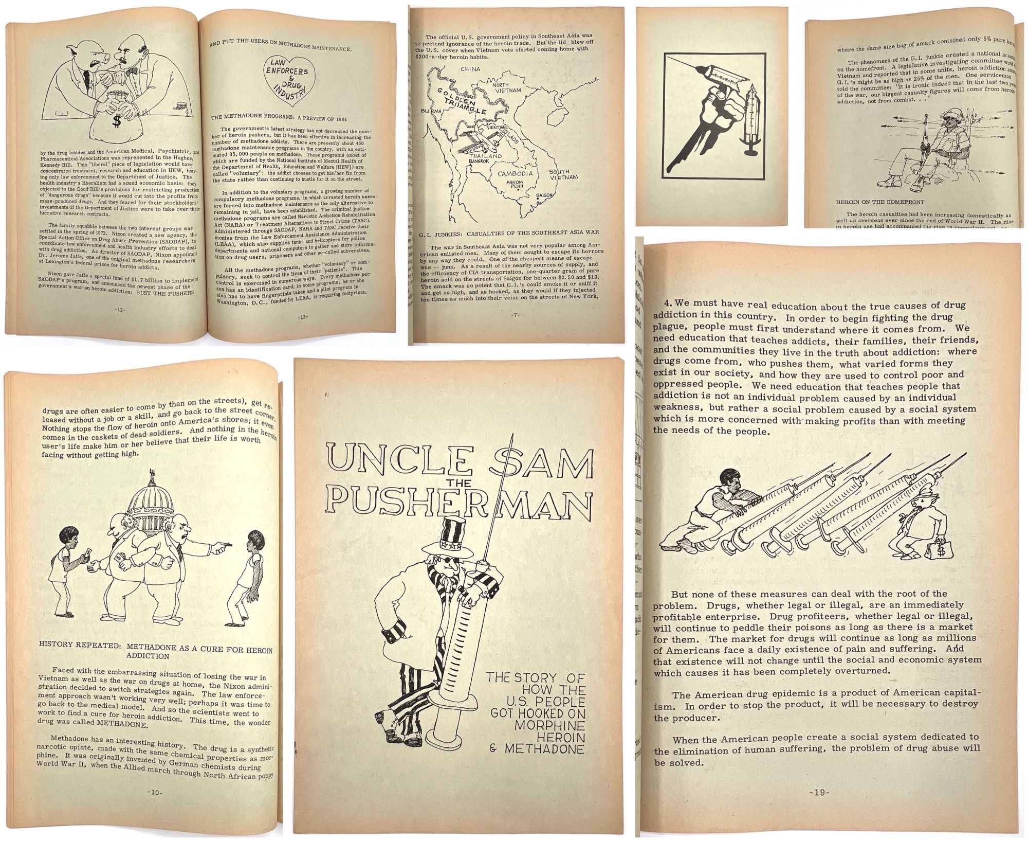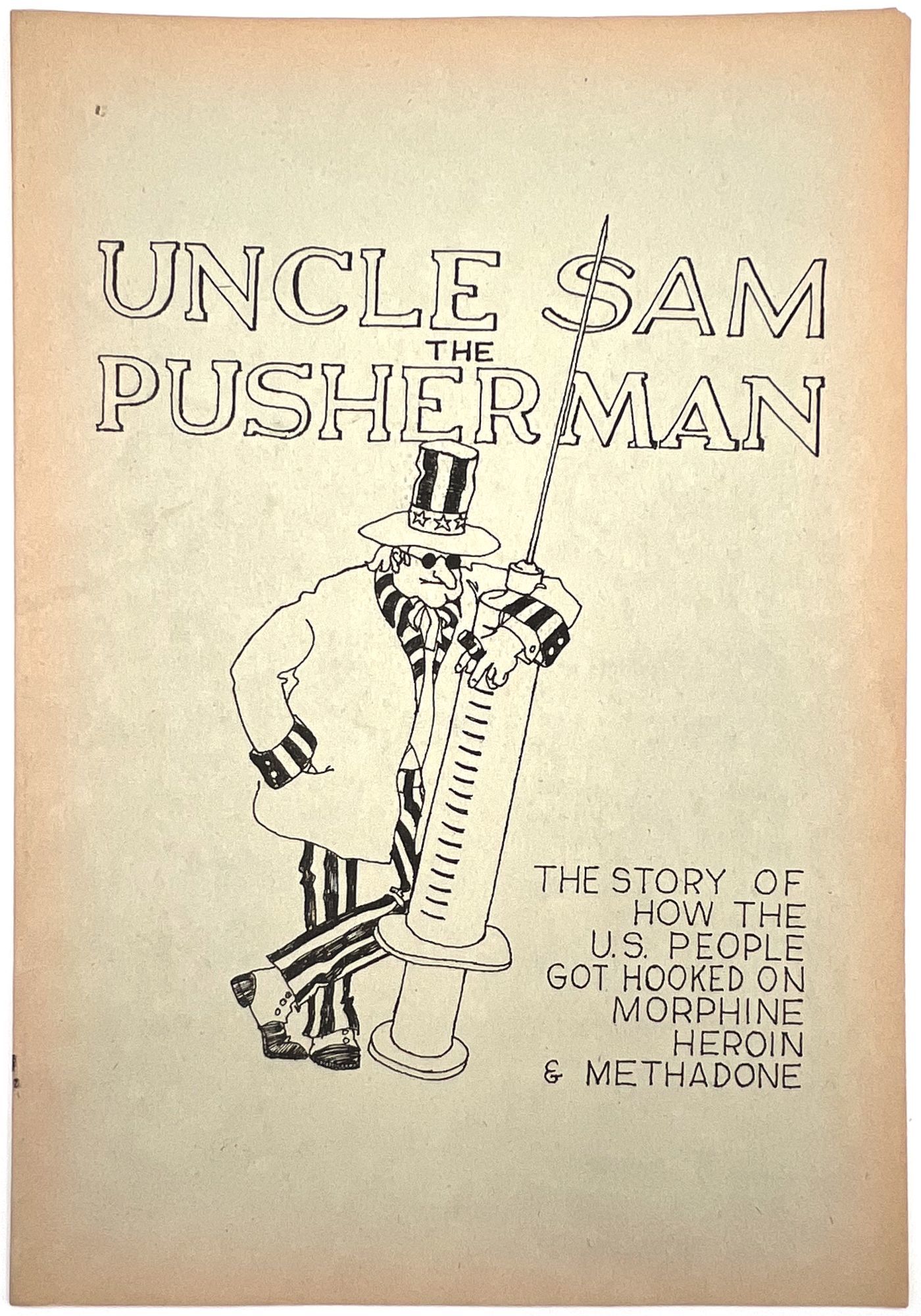 San Francisco, California: Drug Research Project, 1974. Very good. Light edge toning.. Featuring an image of Uncle Sam smoking a cigar and leaning on an oversized syringe, "Uncle Sam the Pusher Man" provides a frank look at narcotics addiction in America, putting the blame squarely on American capitalism and calling for the de-criminalization of drug use. Highlights the rise of methadone addiction after methadone was touted as a "cure" for heroin addiction, and how the government is complicit in the country's ongoing addiction. Includes several powerful political cartoons, such as one in which a Black man topples over a row of syringes to finally knock over American Capitalism, anthropomorphized as a pig with a large bag of money. Single vol. (10" by 7"), pp. 19, [3], illus. in original illus. light green wrps. Approx. 10 copies on WorldCat.