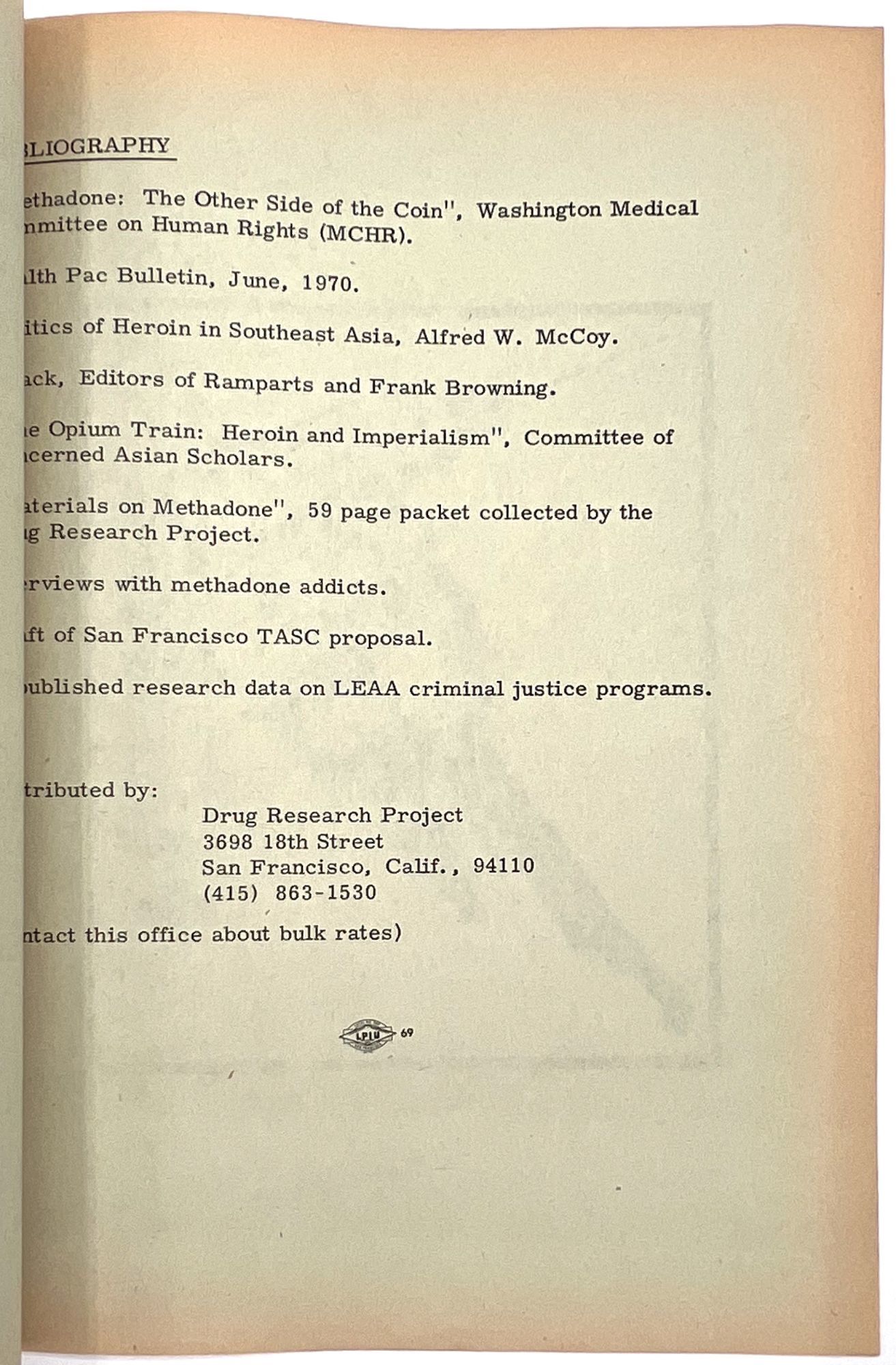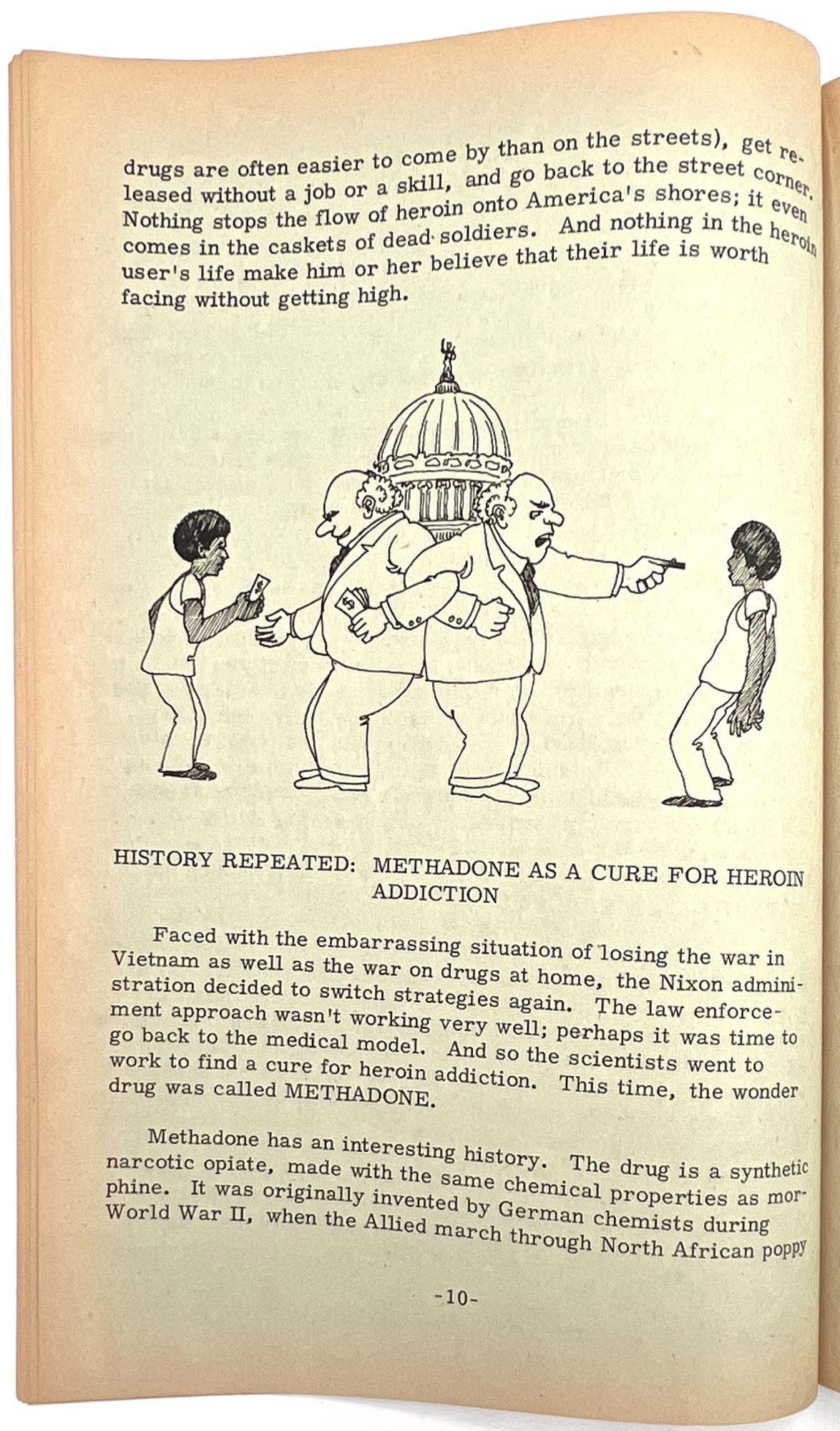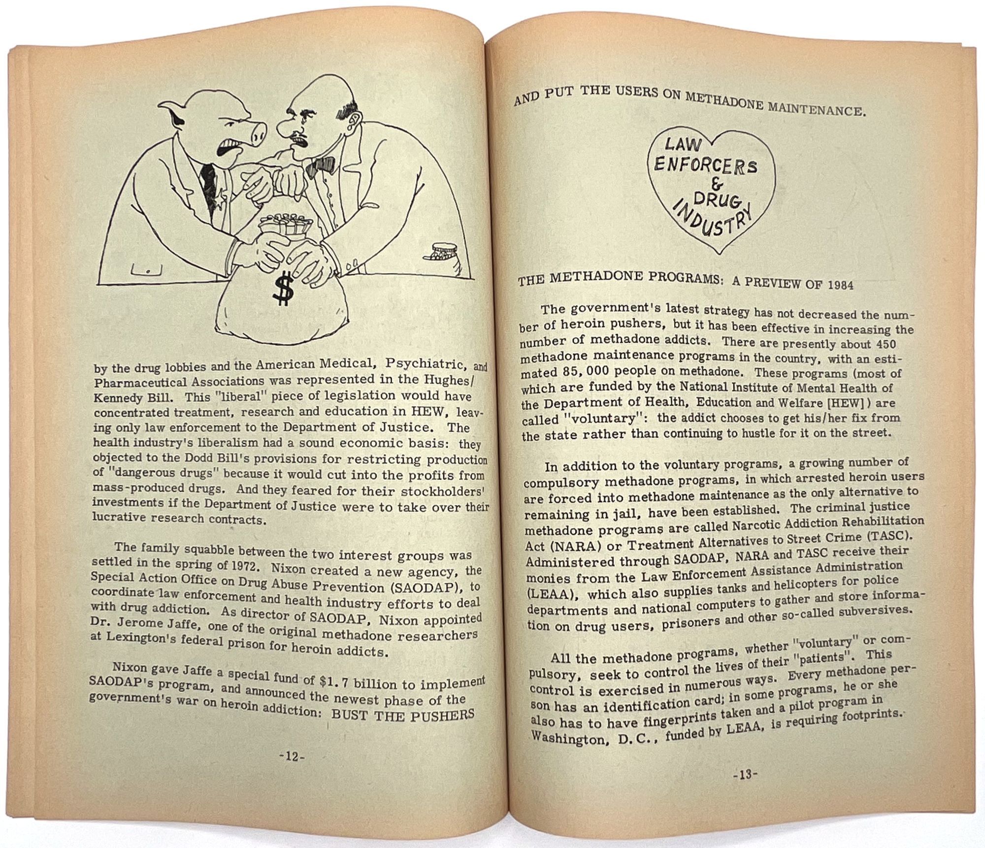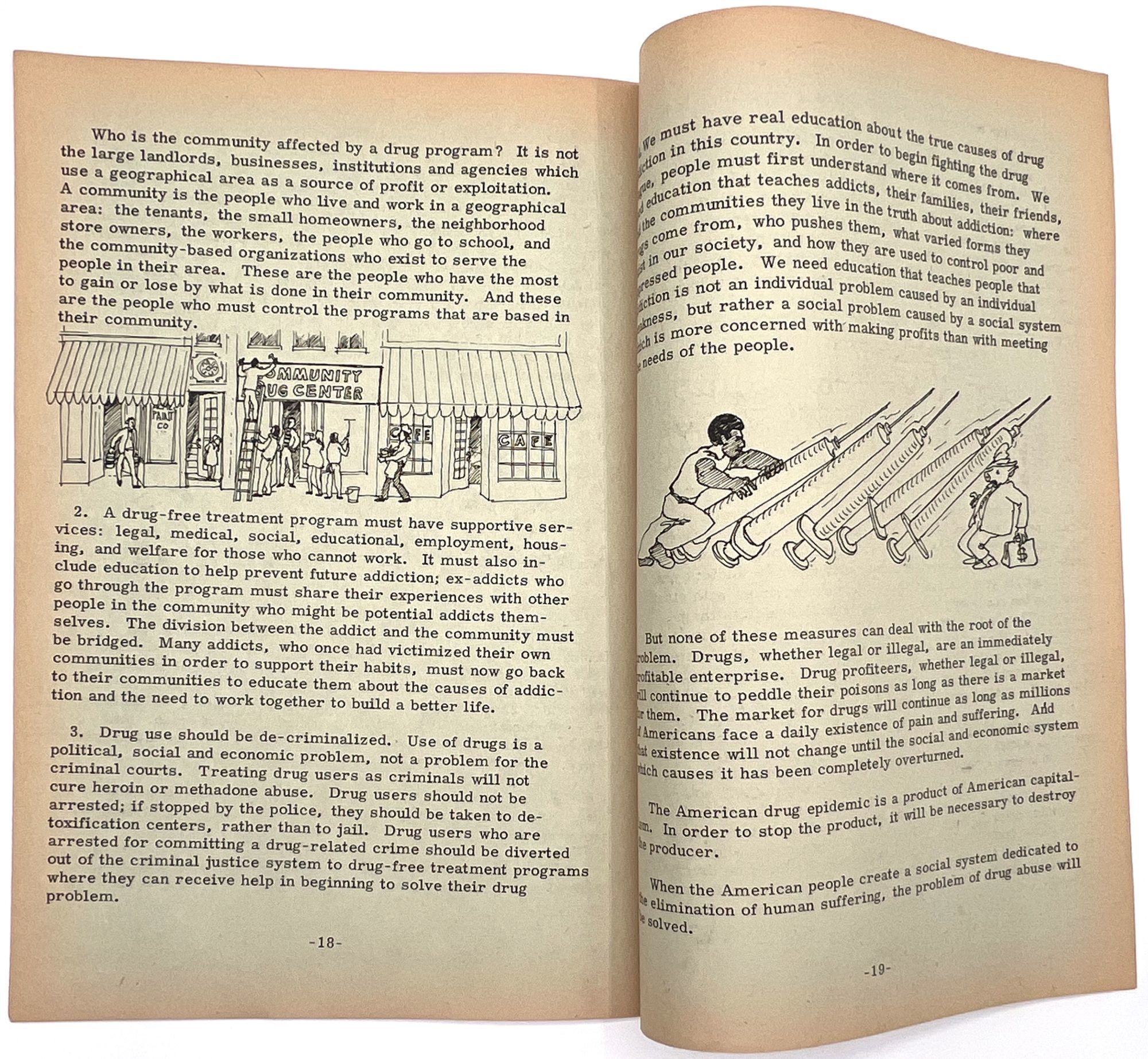 San Francisco, California: Drug Research Project, 1974. Very good. Light edge toning.. Featuring an image of Uncle Sam smoking a cigar and leaning on an oversized syringe, "Uncle Sam the Pusher Man" provides a frank look at narcotics addiction in America, putting the blame squarely on American capitalism and calling for the de-criminalization of drug use. Highlights the rise of methadone addiction after methadone was touted as a "cure" for heroin addiction, and how the government is complicit in the country's ongoing addiction. Includes several powerful political cartoons, such as one in which a Black man topples over a row of syringes to finally knock over American Capitalism, anthropomorphized as a pig with a large bag of money. Single vol. (10" by 7"), pp. 19, [3], illus. in original illus. light green wrps. Approx. 10 copies on WorldCat.