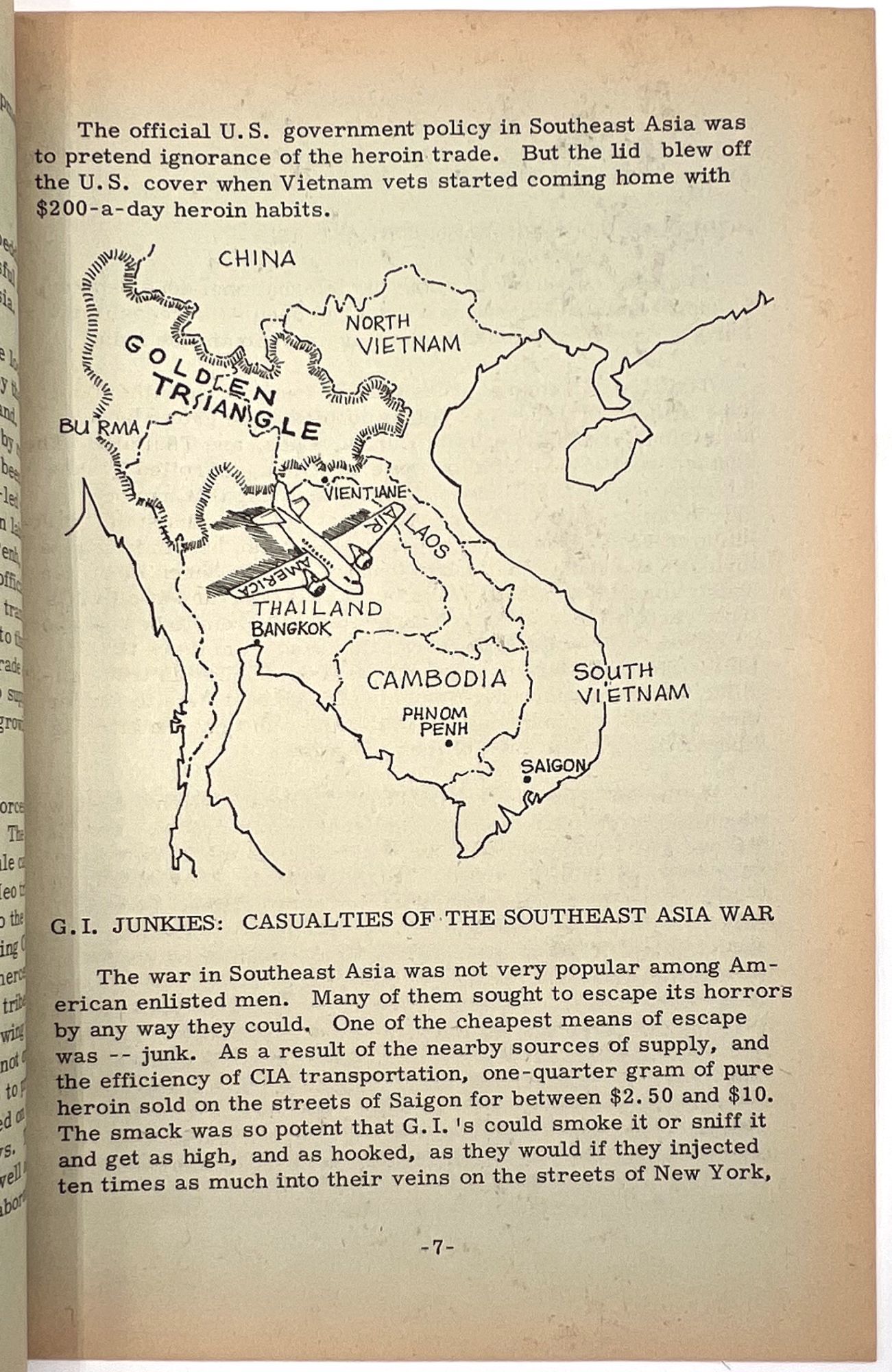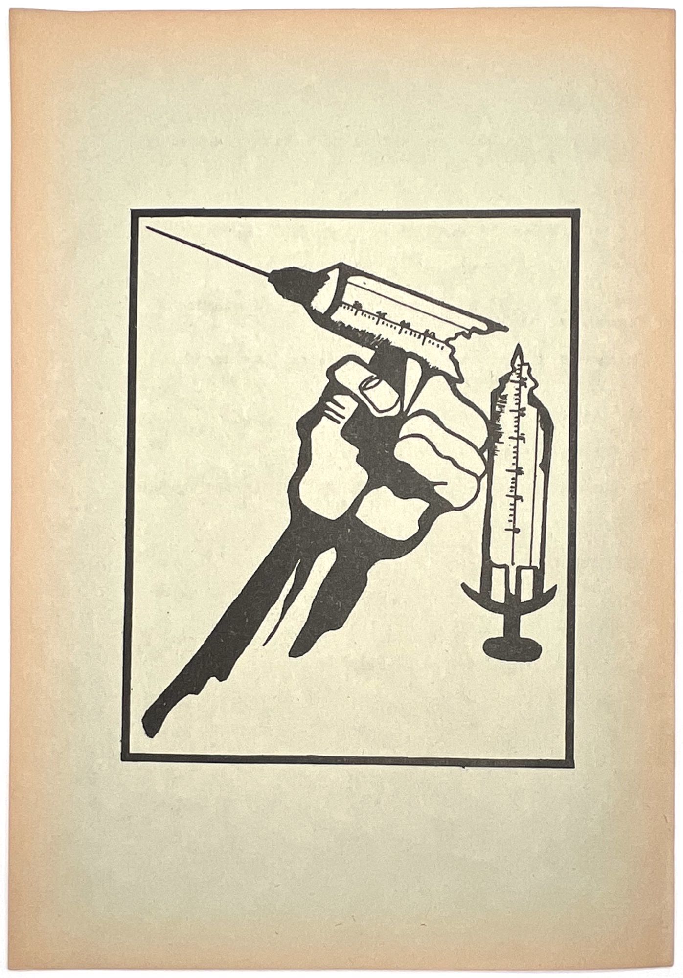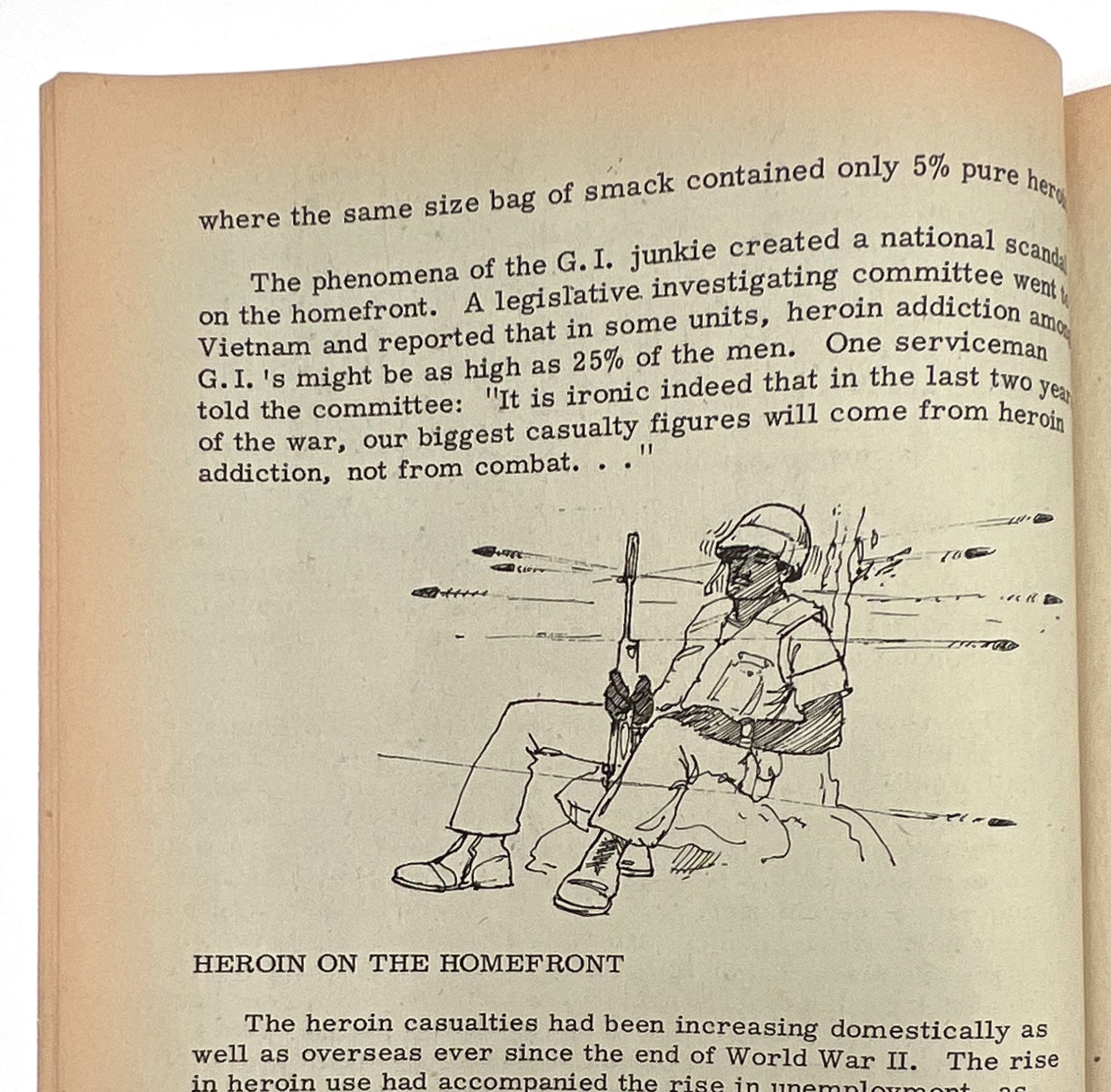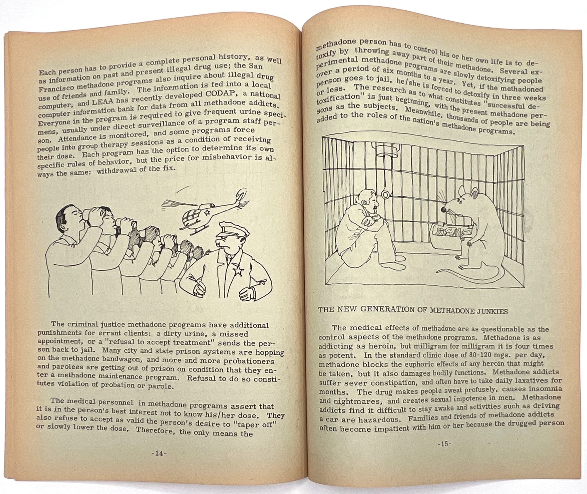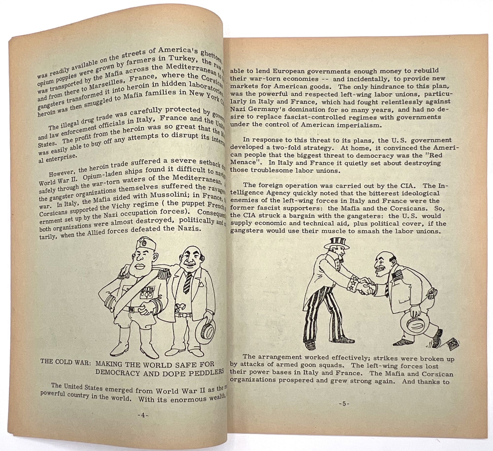 San Francisco, California: Drug Research Project, 1974. Very good. Light edge toning.. Featuring an image of Uncle Sam smoking a cigar and leaning on an oversized syringe, "Uncle Sam the Pusher Man" provides a frank look at narcotics addiction in America, putting the blame squarely on American capitalism and calling for the de-criminalization of drug use. Highlights the rise of methadone addiction after methadone was touted as a "cure" for heroin addiction, and how the government is complicit in the country's ongoing addiction. Includes several powerful political cartoons, such as one in which a Black man topples over a row of syringes to finally knock over American Capitalism, anthropomorphized as a pig with a large bag of money. Single vol. (10" by 7"), pp. 19, [3], illus. in original illus. light green wrps. Approx. 10 copies on WorldCat.