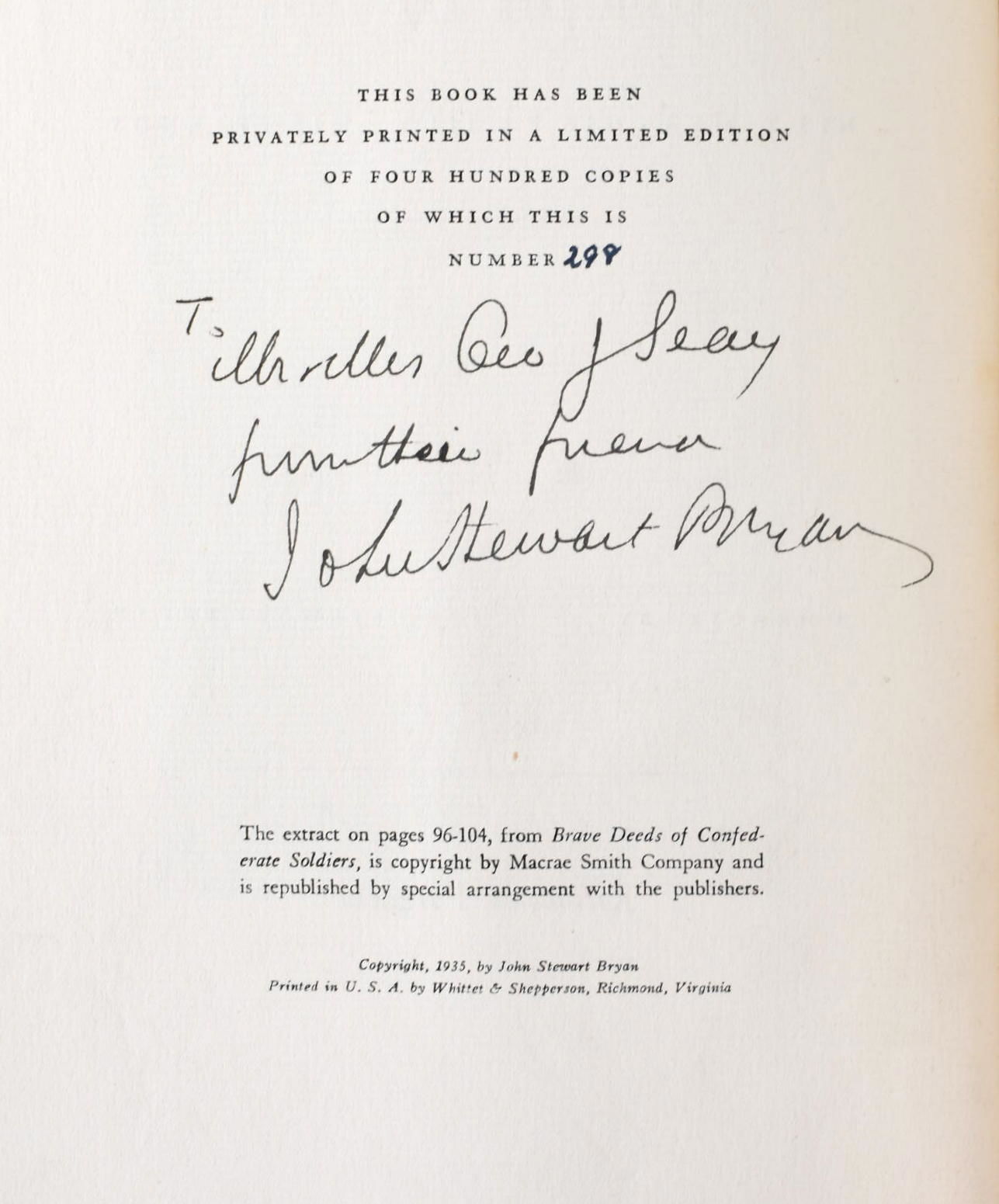 Richmond, VA: Whittet & Shepperson, 1935. Limited Edition. Hard Cover. Very Good binding. Signed. Quarto; in the publisher's quarter black cloth over gray cloth, with decoration in gilt and titling in gilt to the spine; [18]. 19-408 pages, including the Index; illustrated with black and white photographic portraits, interiors of the Library at Laburnum, and the like; this copy signed by John Stewart Bryan with a personal inscription to George J. Seay; Mr. Seay was responsible for Richmond becoming a site for a regional Reserve Bank, and was the first chief executive officer of the Federal Reserve Bank of Richmond from 1916 to 1936.~~A scarce and sought after memoir of one Richmond's great leaders, penned by his son "for the children and grandchildren of Joseph Bryan". Born in Gloucester, Bryan served in the Confederate Armed Forces with the Richmond Howitzers and Mosby's Rangers. He became a most prominent industrialist and newspaper publisher, and at his death owned both the Richmond Times-Dispatch and the Richmond News-Leader. Limited to 400 copies, this being #298. (Haynes, 2388,; Dornbursch II, 1277). Very Good binding.