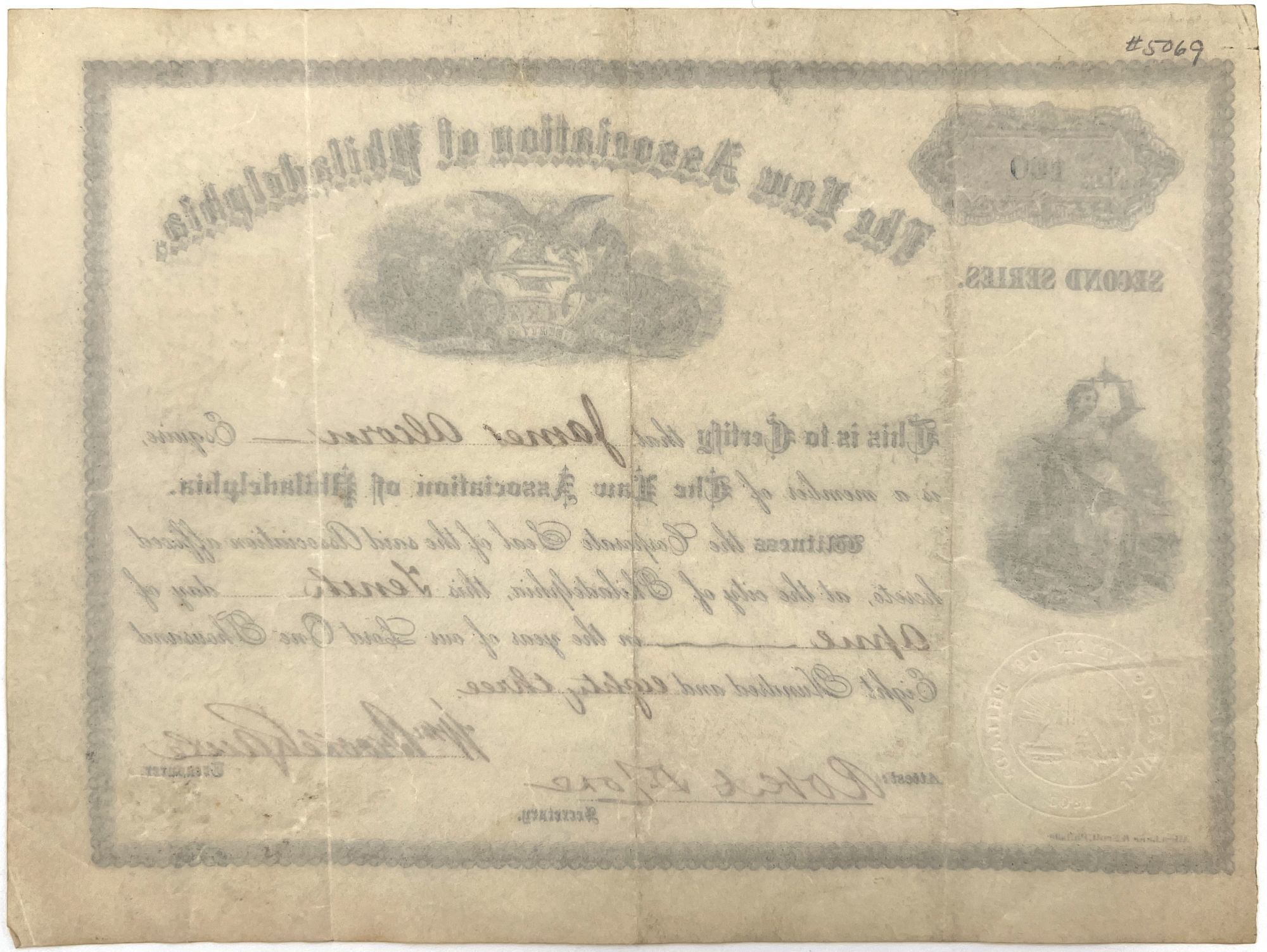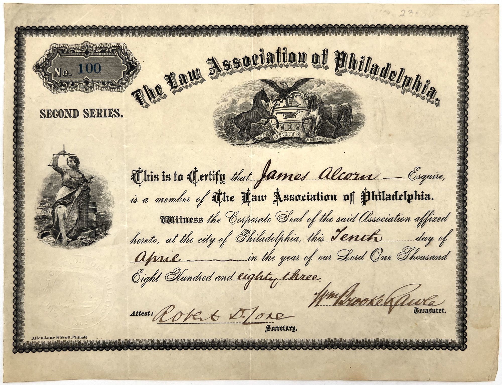 Philadelphia, Pennsylvania: Allen, Lane & Scott, 1883. Very good. Letter folds.. Engraved Law Association of Philadelphia certificate, finished in contemporary ink manuscript, certifying the membership of James Alcorn, Esq., signed by the treasurer and secretary of the organization. Measures 6.75" by 8.5", with engraved allegorical illustration of Lady Justice, and an eagle flanked by two horses. Embossed seal of the Association to lower left-hand corner. Ink stamp "No. 100" to upper left-hand corner.